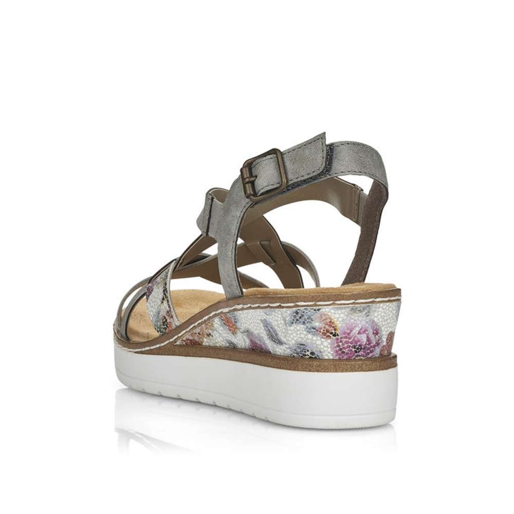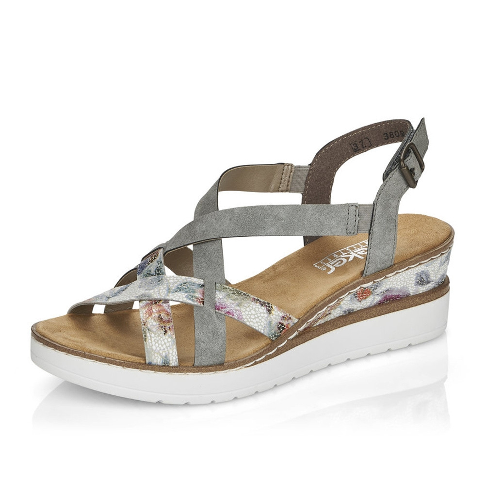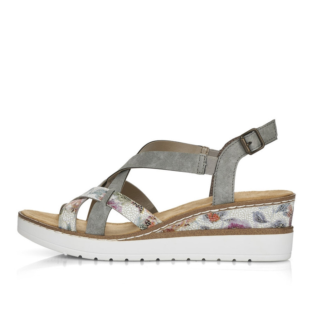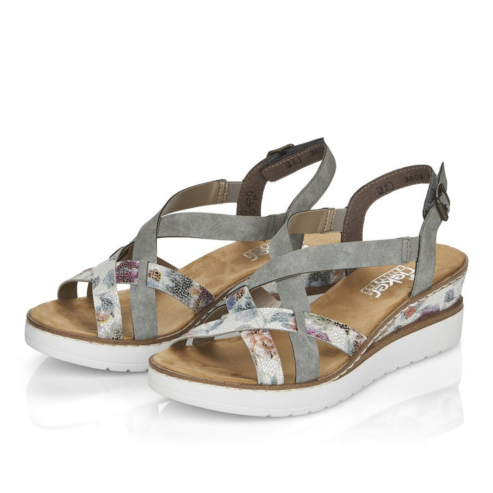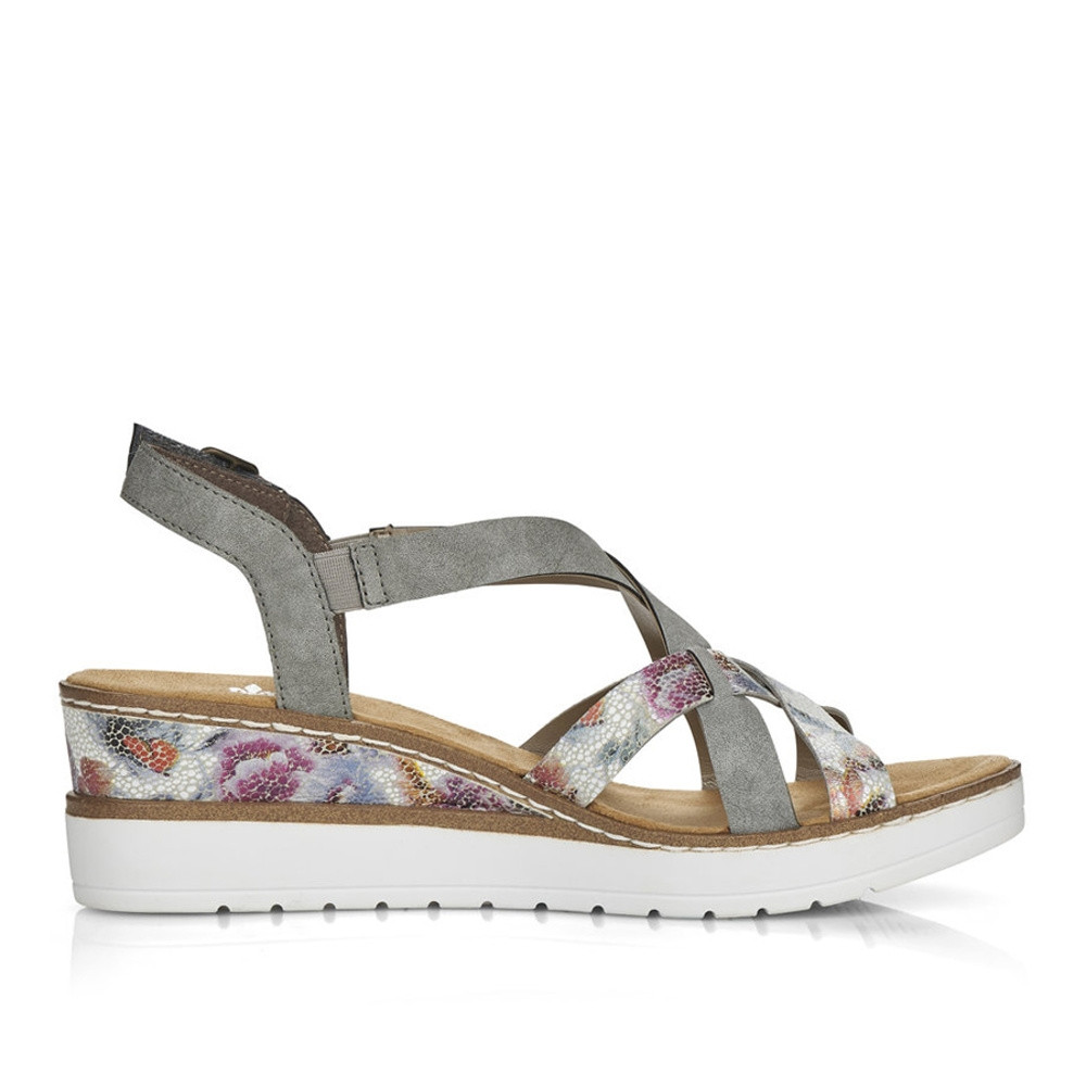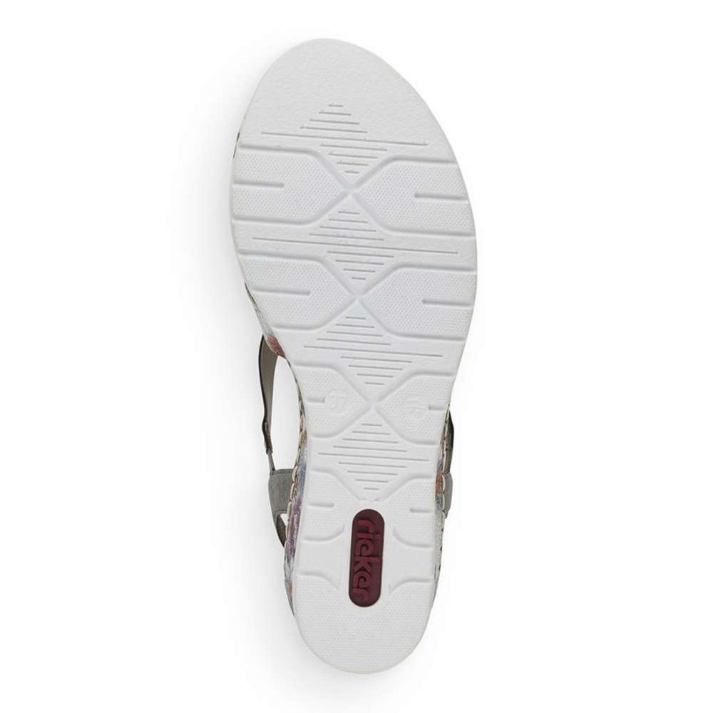 Originálně propletené páskové sandály Rieker mají kontrastně sladěnou podešev. Obuv je vybavena úzkou přezkou a pružnými gumičkami vsazenými po bocích.