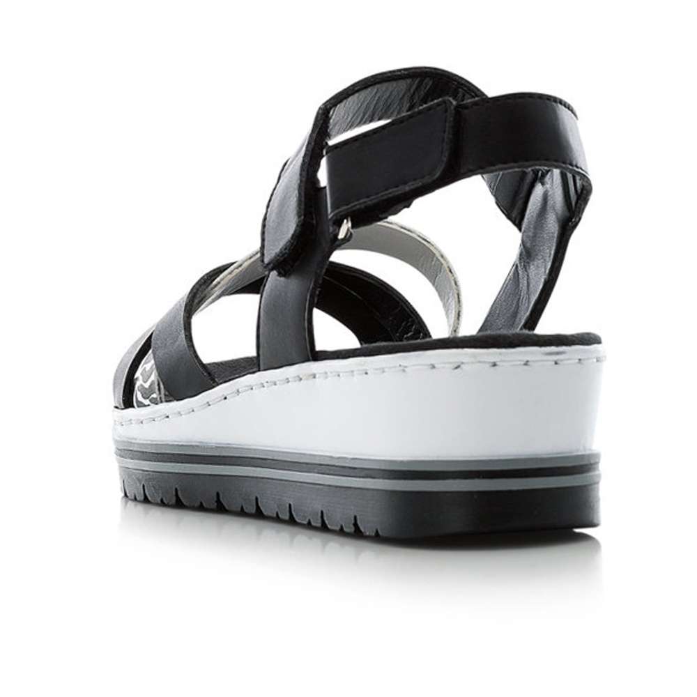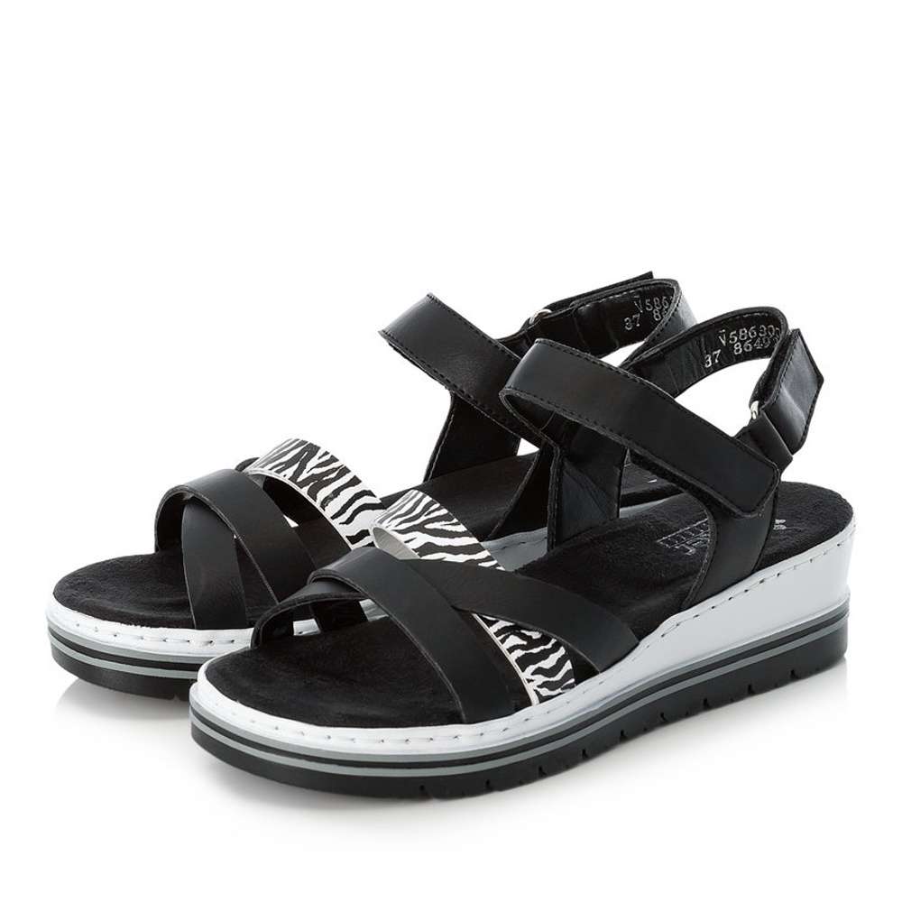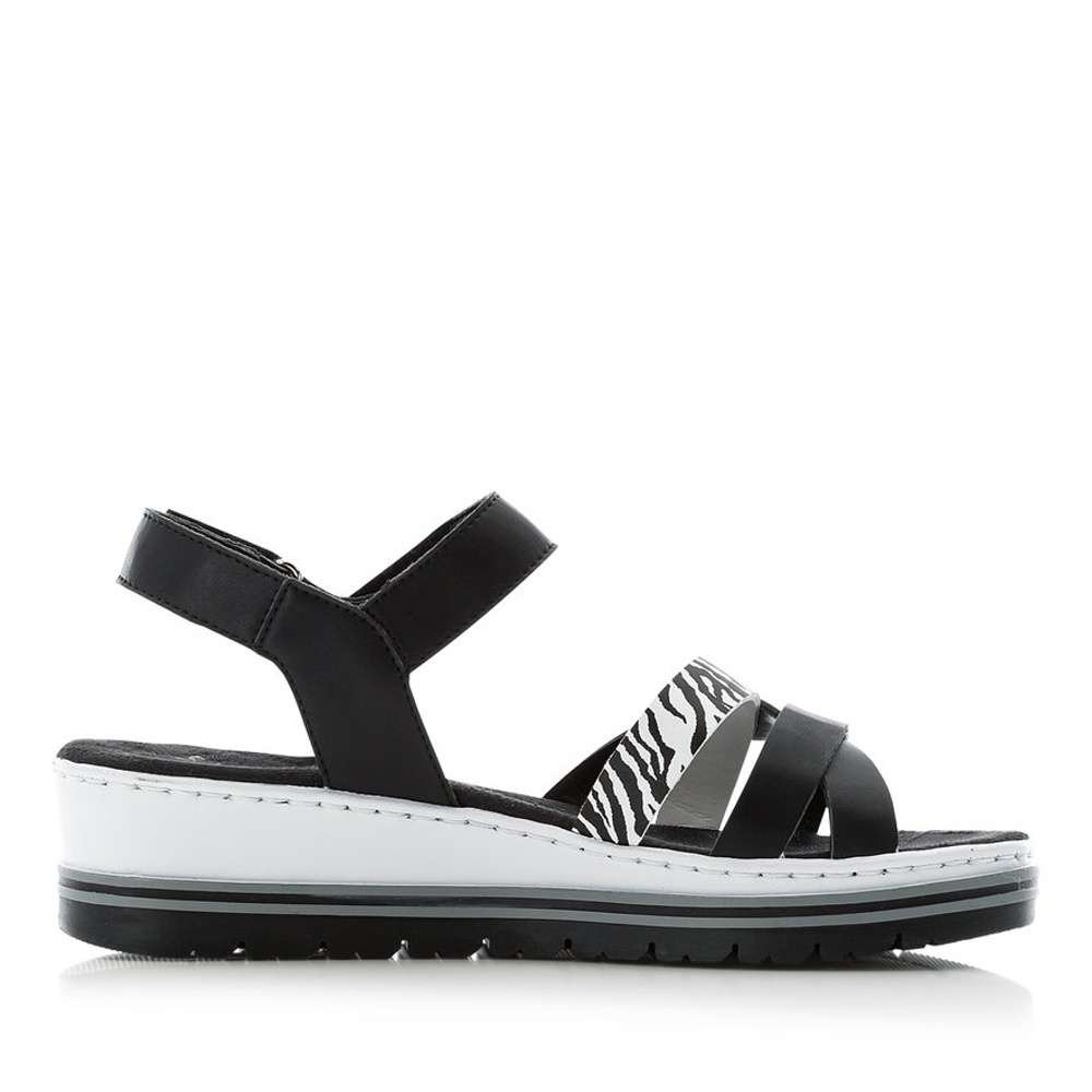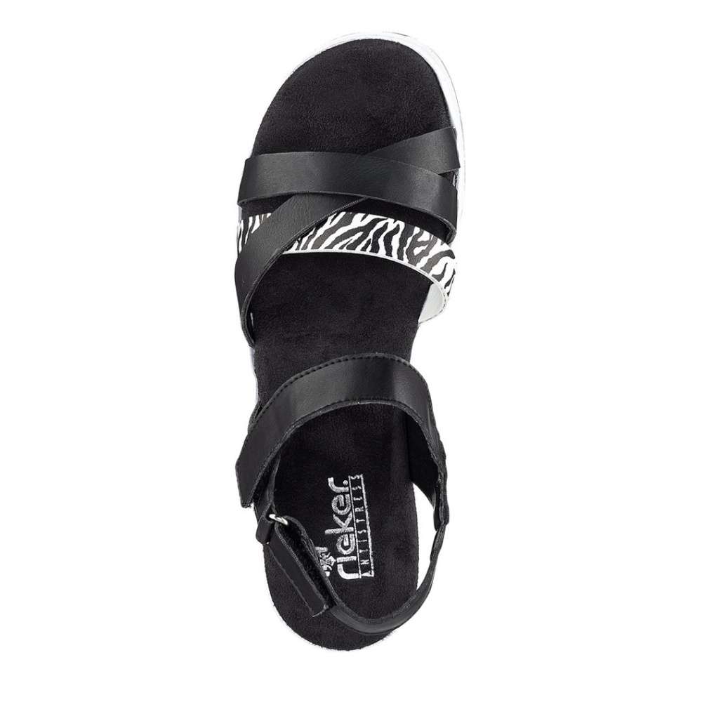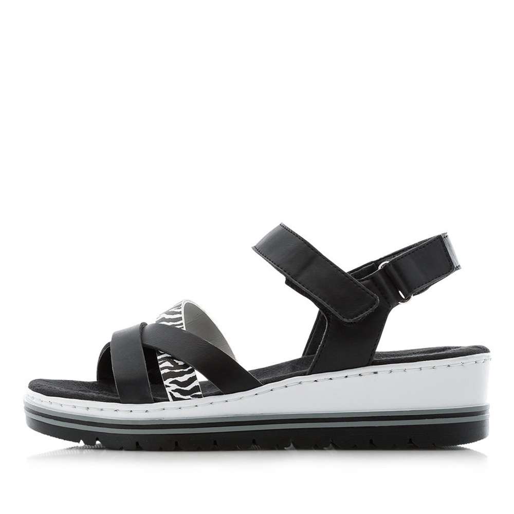 Tyto dokonalé dámské sandály v černé barvě jsou ideálním doplňkem pro horké letní dny. V přední části je několik překřížených pásku, z čehož jeden má výrazný vzor a dodává ten správný nádech nadčasové obuvi. Další pásky v patní a nártové části jsou vybaveny suchým zipem, díky kterým si boty jednoduše upravíte dle svého chodidla. Tímto modelem zajisté skvěle podtrhnete oblíbený outfit do práce, na schůzky nebo na procházky.