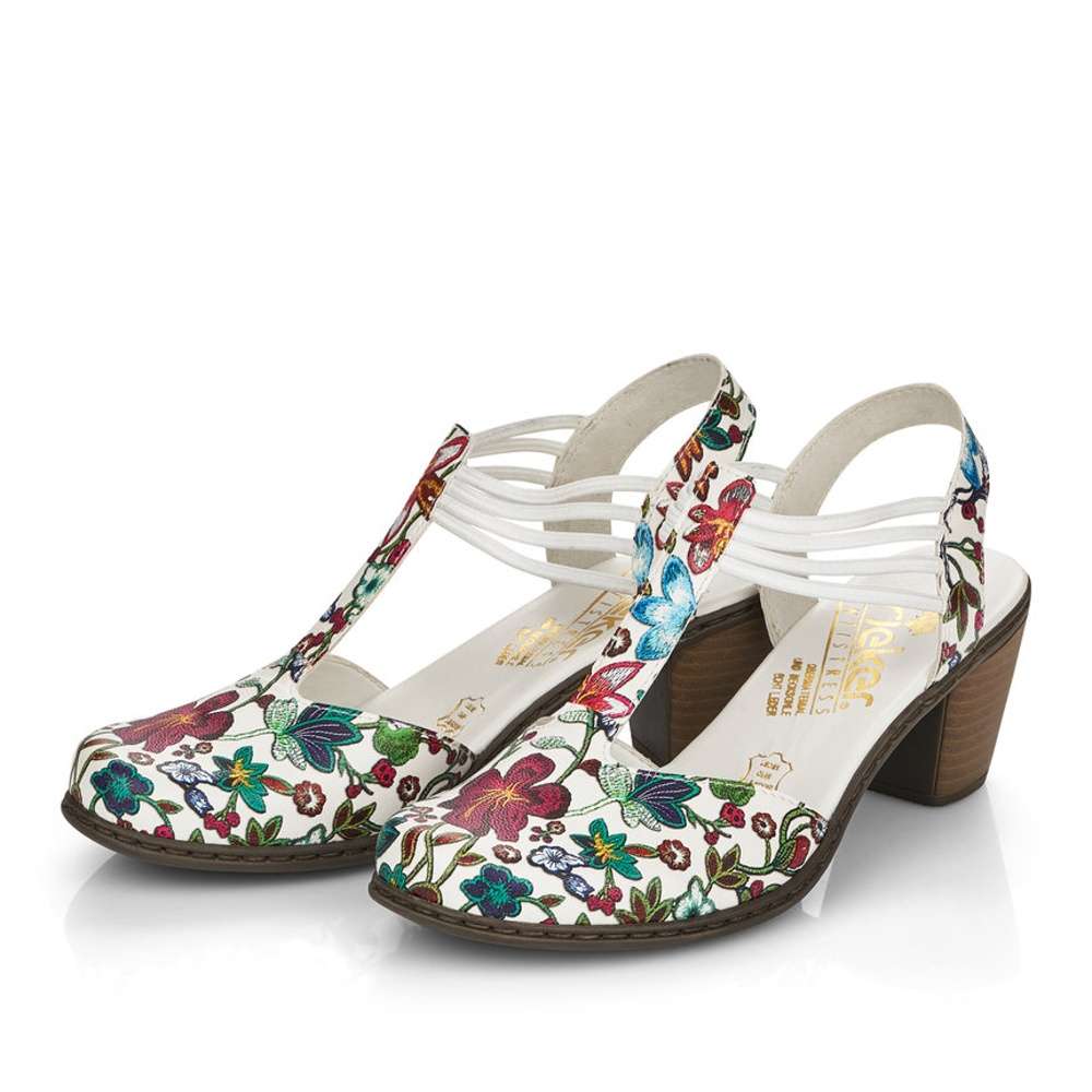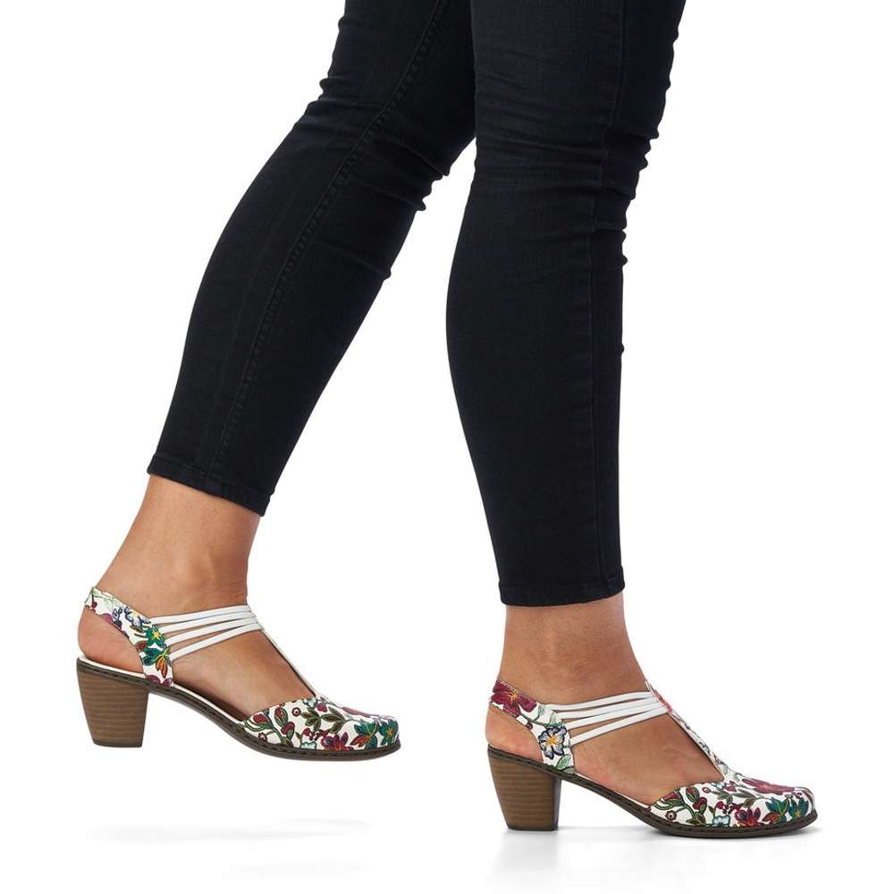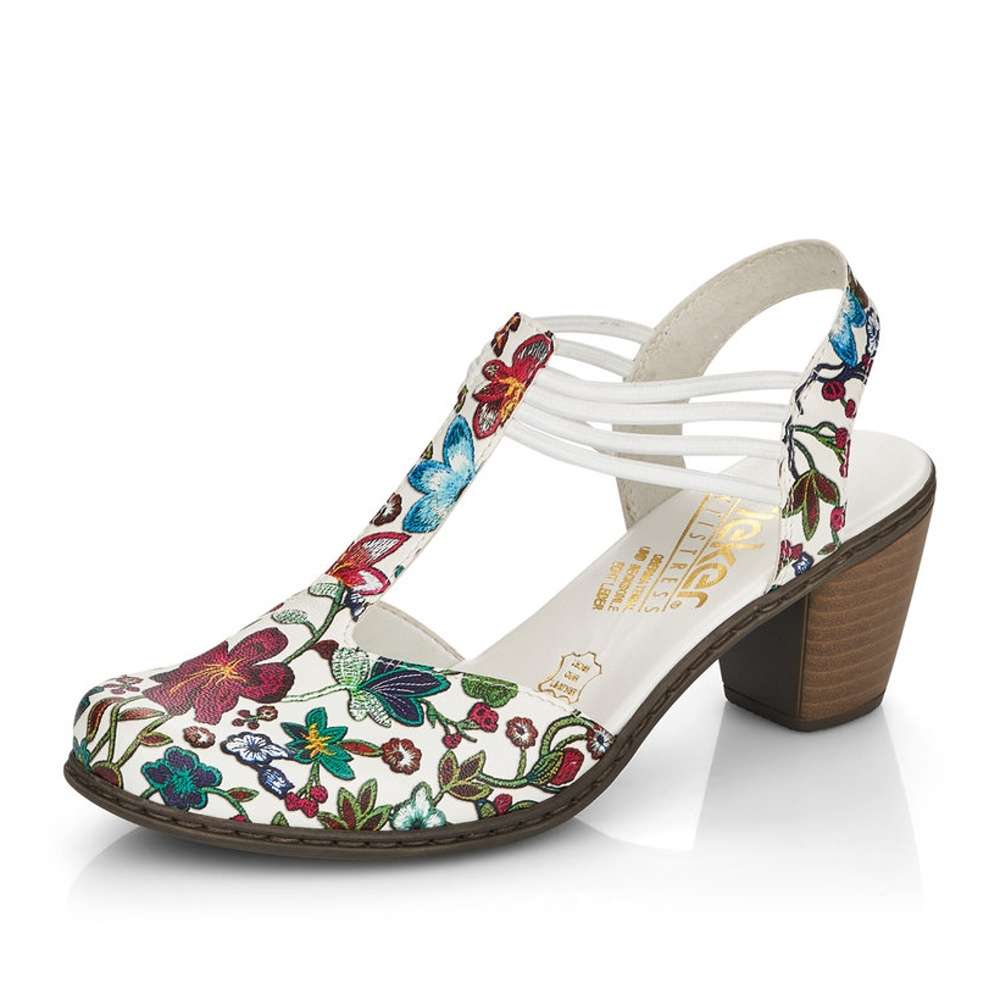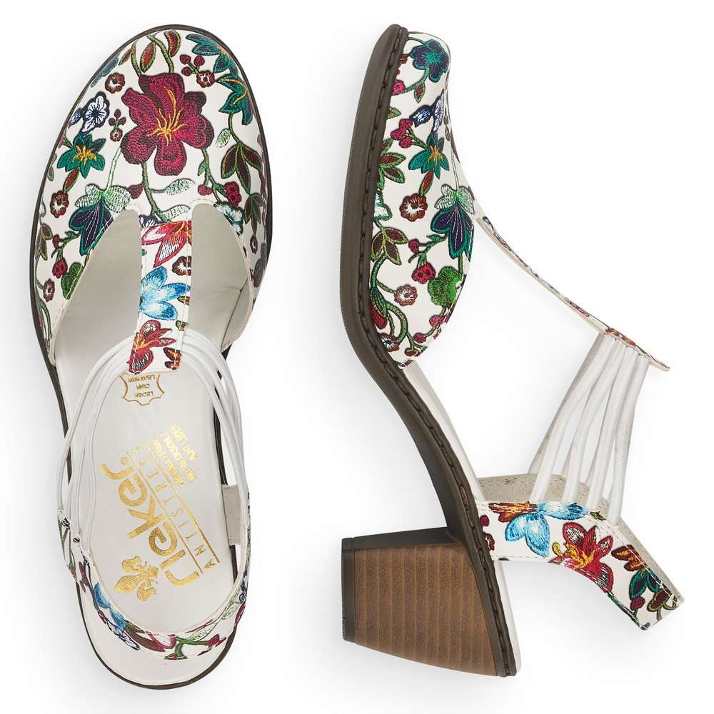 Detailní informace Dámské elegantní sandálky značky RIEKER Vás okouzlí svým nevšedním designem. Hladký svršek je zdoben květinovým vzorem, který zdokonalí každý Váš outfit. Pro pohodlí při chůzi a snadné obutí poslouží pásek kolem paty a pružné gumičky po stranách. Podešev vybavená technologií Antistress na nízkém podpatku zaručí elegantní a komfortní chůzi. Tento jedinečný model se skvěle hodí k sukni i kalhotám na každou příležitost.