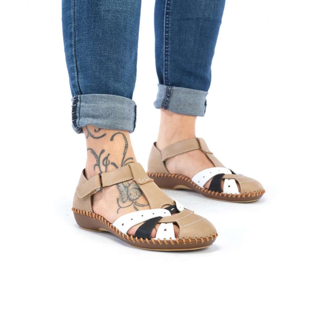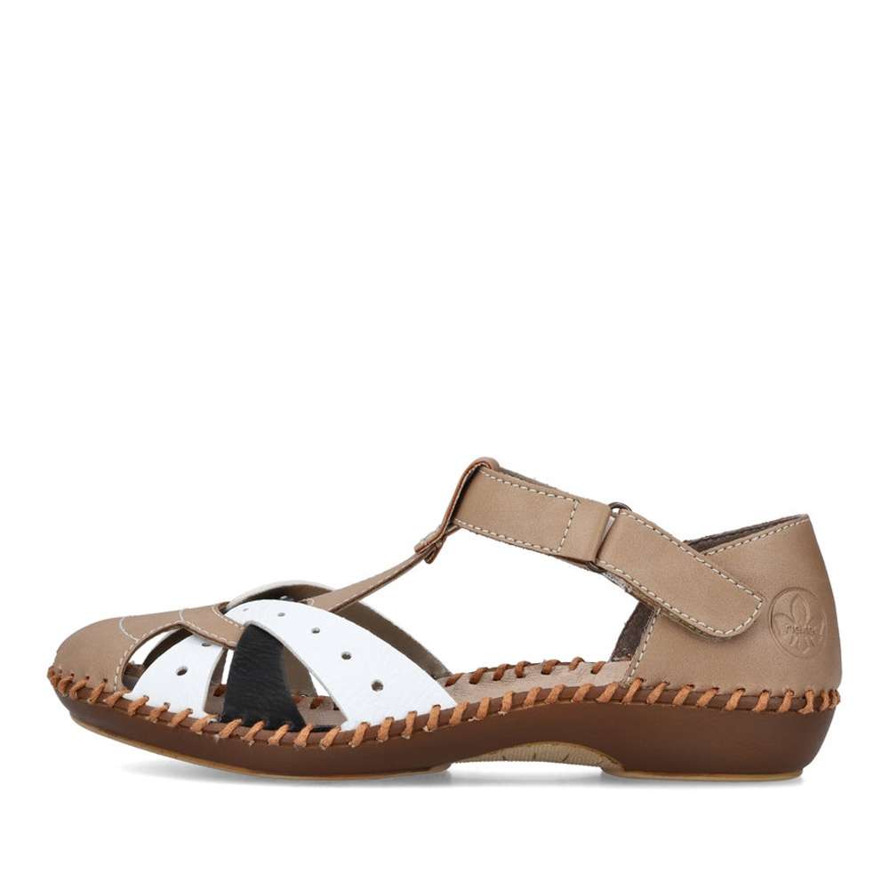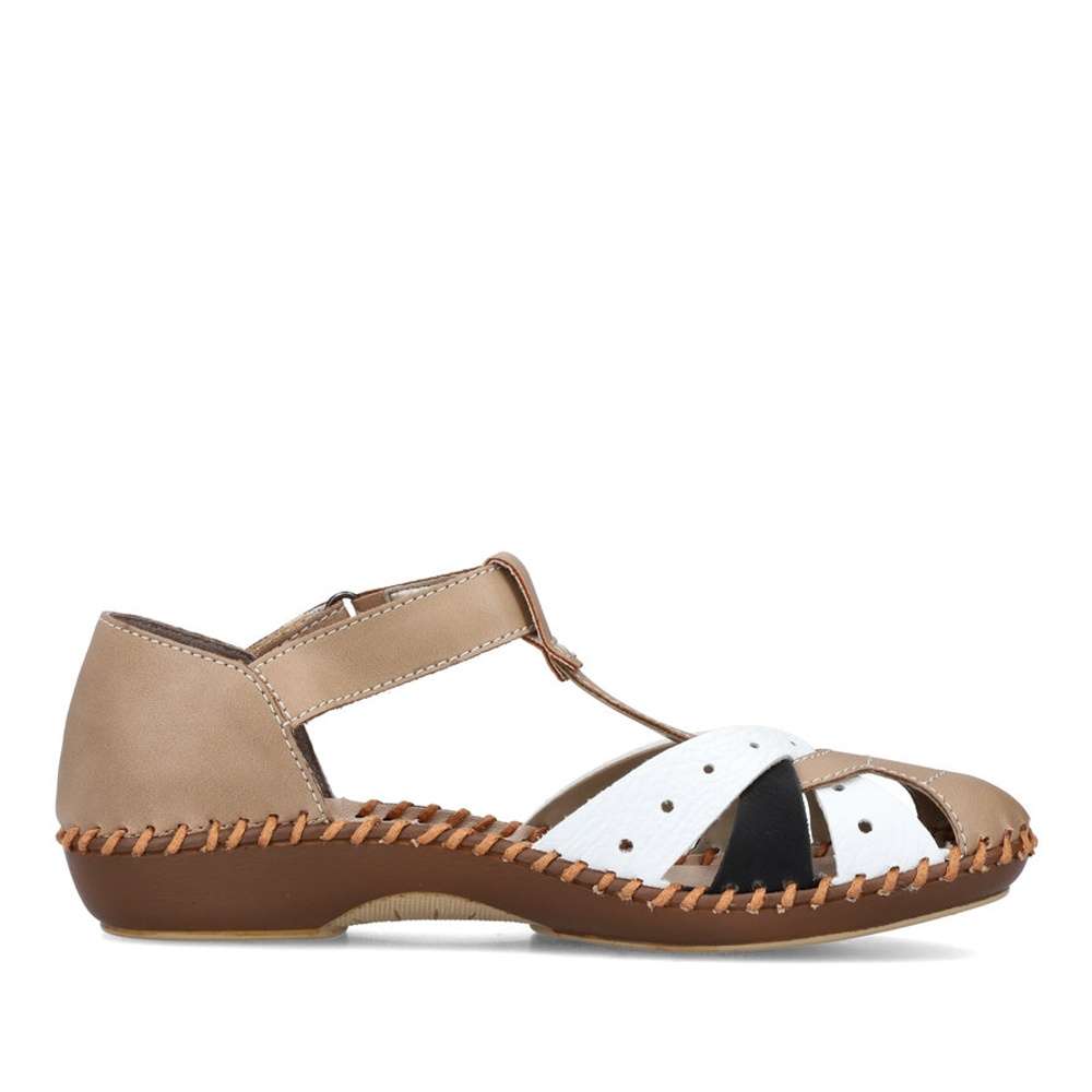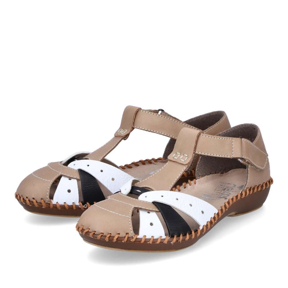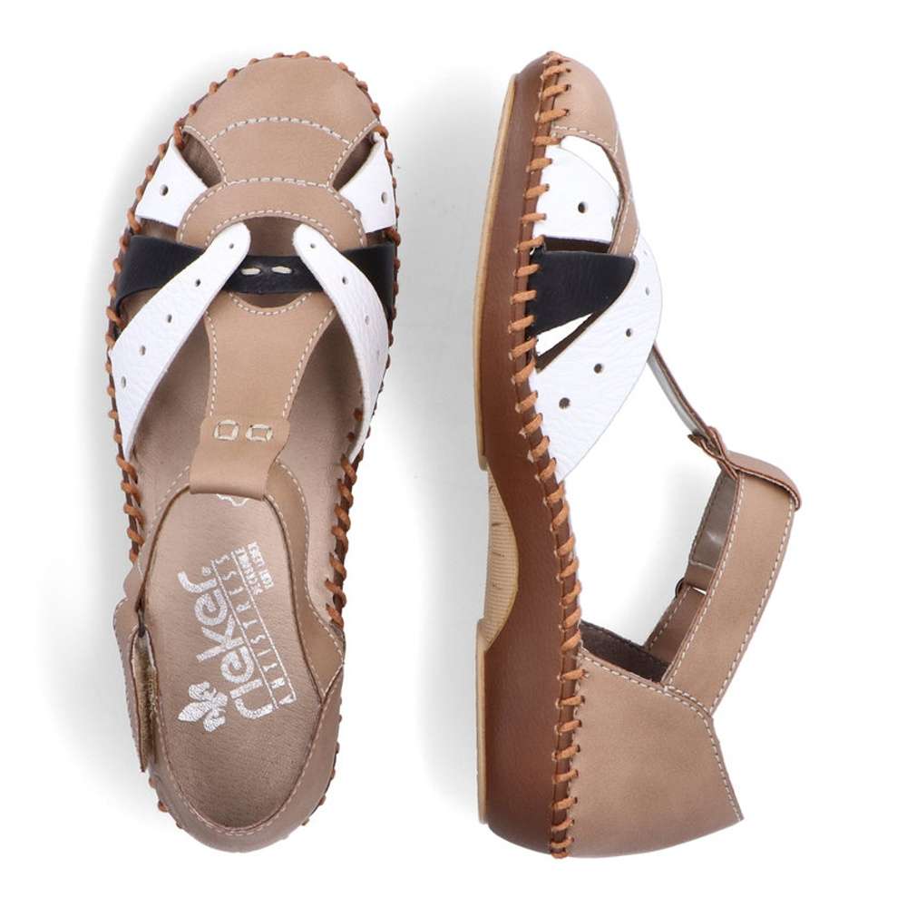 Dámské sandály značky RIEKER Vás uchvátí netradičním provedením. Kombinovaný svršek je tvořen několika pásky a zdoben jemným prošíváním. Pro snadné obutí poslouží pásek na suchý zip v oblasti nártu. Měkká paměťová stélka a pohodlná podešev dělá tento model maximálně komfortním i při delší chůzi. S tímto kouskem nebude žádný Váš outfit všední.