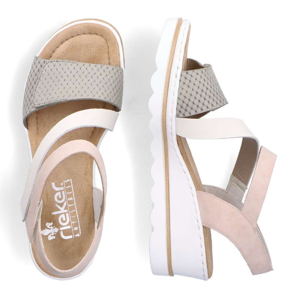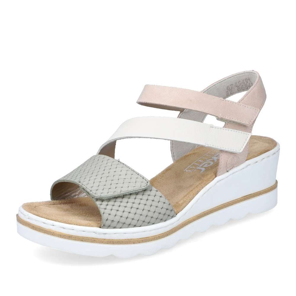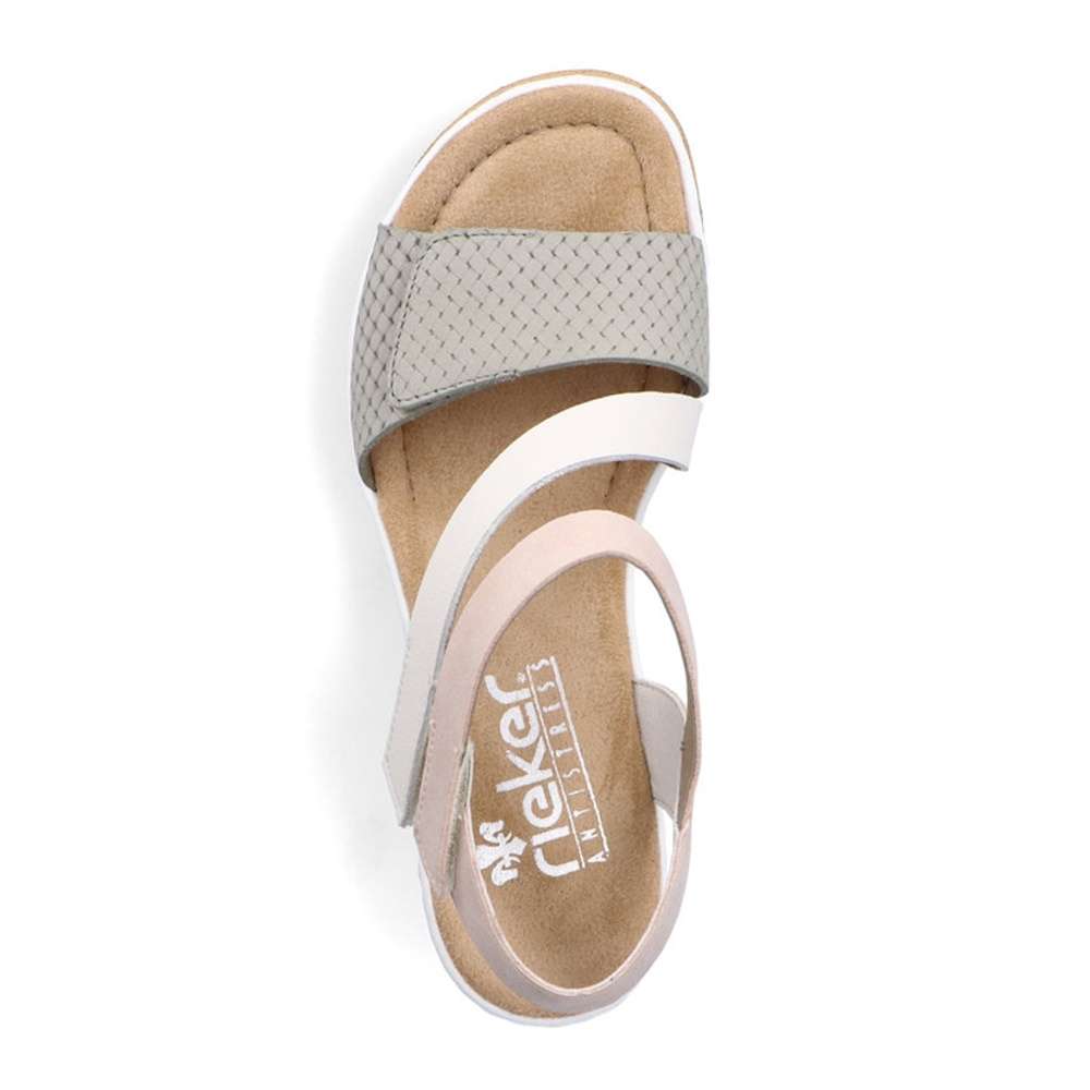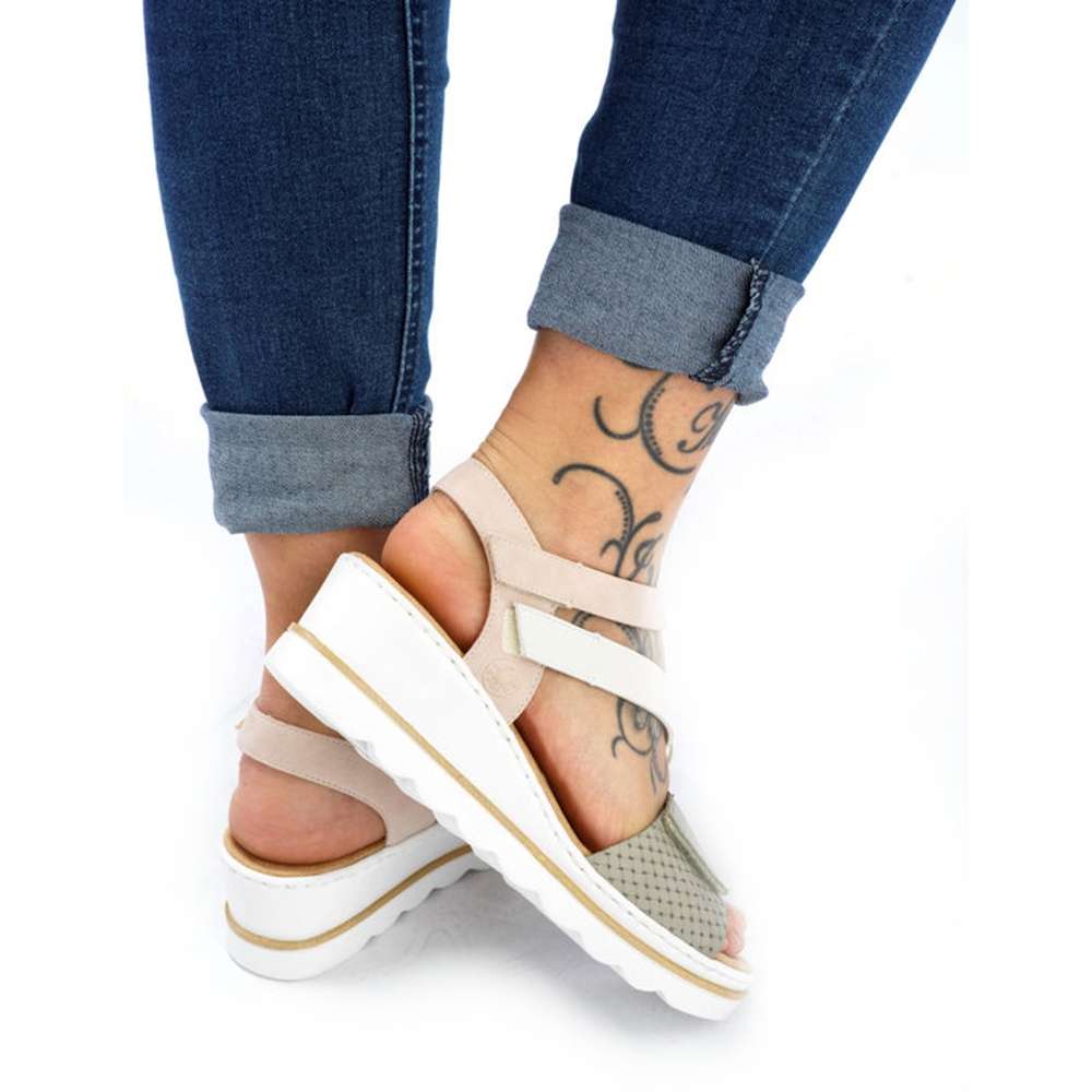 Dámské světlé sandálky RIEKER skvěle doplní Vaše letní outfity. Svršek je složený že tří pásků, které skvěle obejmou Vaši nohu a snadno si díky zapínání na suché zipy nastavíte obuv dle potřeb. Stélka je vyrobena z kvalitního měkkého materiálu a vyšší podešev s kontrastním pruhem dolaďuje celkový vzhled obuvi k dokonalosti. Tyto sandálky unosíte jak na nákupy do města, tak i na letní dovolené. Technologie: Antistress – podešev je díky této technologii lehká, flexibilní, absorbuje nárazy při došlapu a snadno se přizpůsobí každé noze.