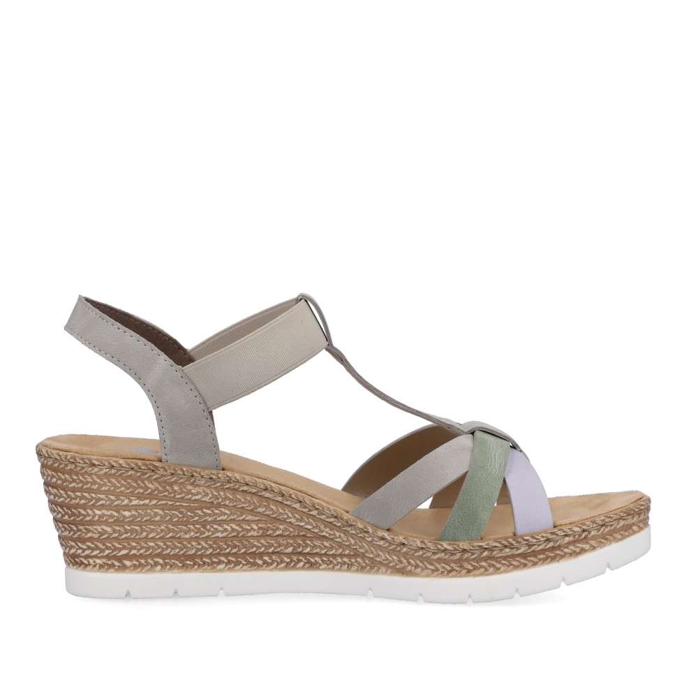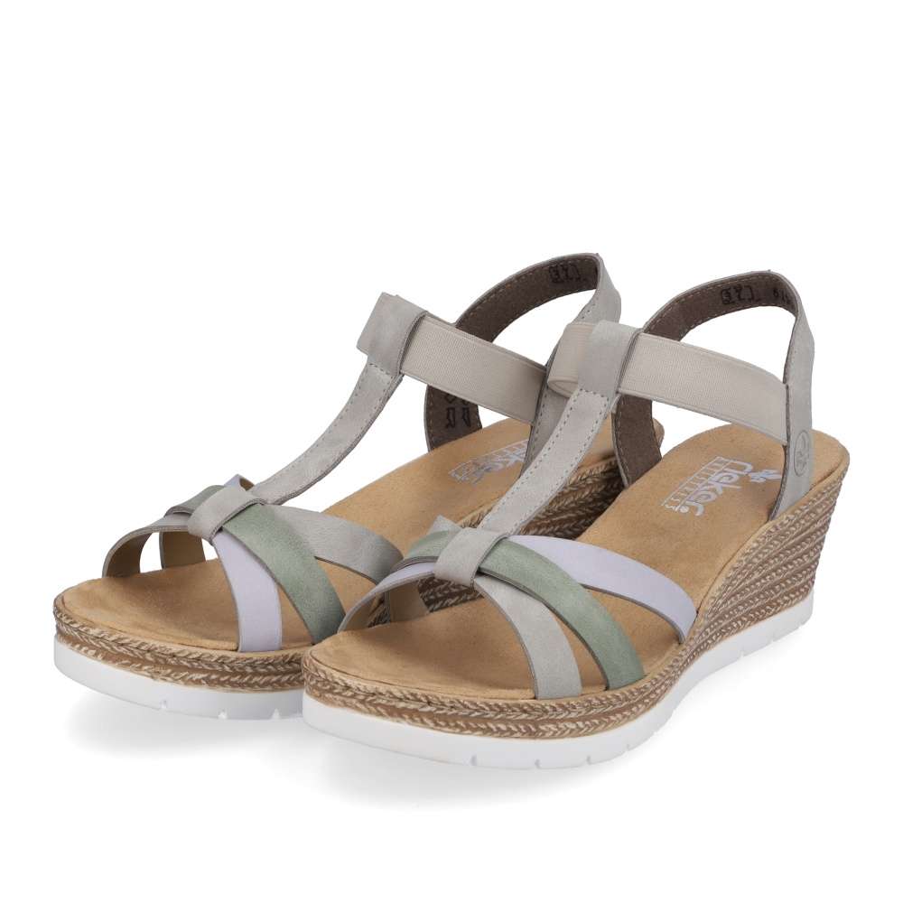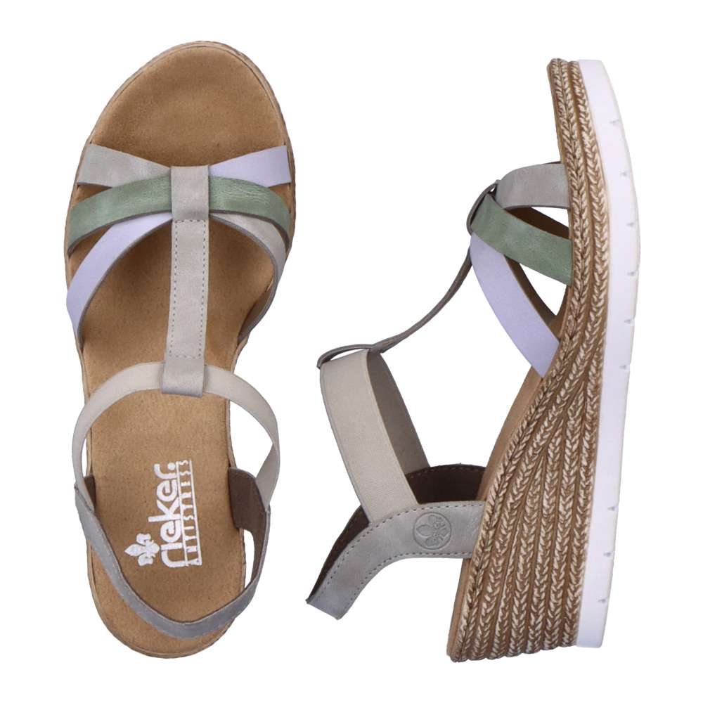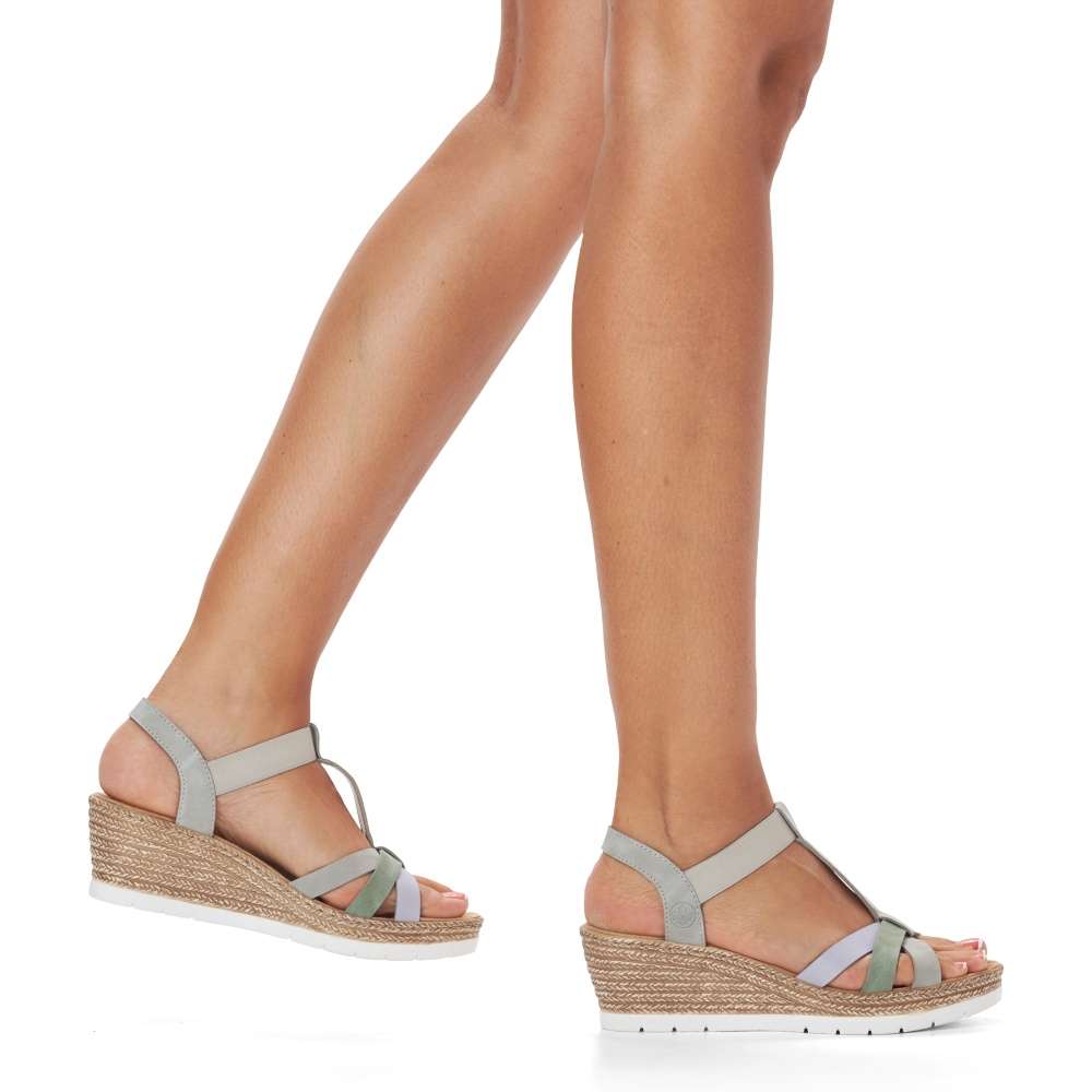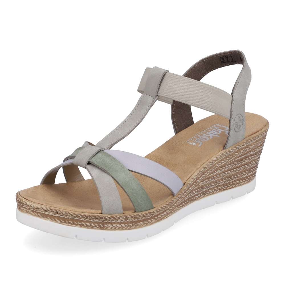 Detailní informace Tyto stylově provedené sandály od značky Rieker si zamilujete už na první pohled, díky své elegantnosti a kombinaci barev. Přední pásky jsou spojené s patním, a to pružnou gumou, díky které si obuv snadno a rychle nazujete. Měkká a pohodlná stélka Vám zajistí, že se budete cítit skvěle po celý den. Podešev na klínku je vysoká cca 5,5 cm a má technologii Antistress, díky niž se snadno přizpůsobí každé noze. Jsou ideálním kouskem pro letní dny, můžete si je vzít jak k sukni, tak i ke kraťasům.