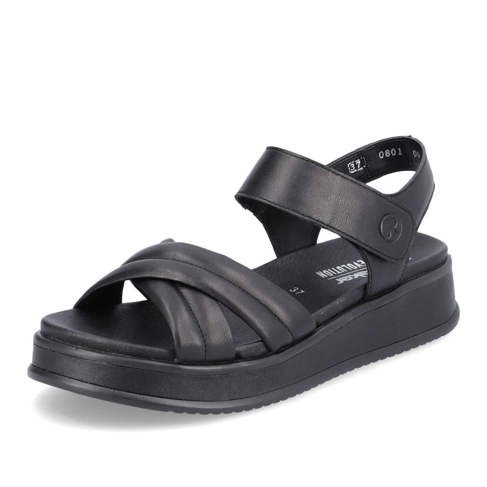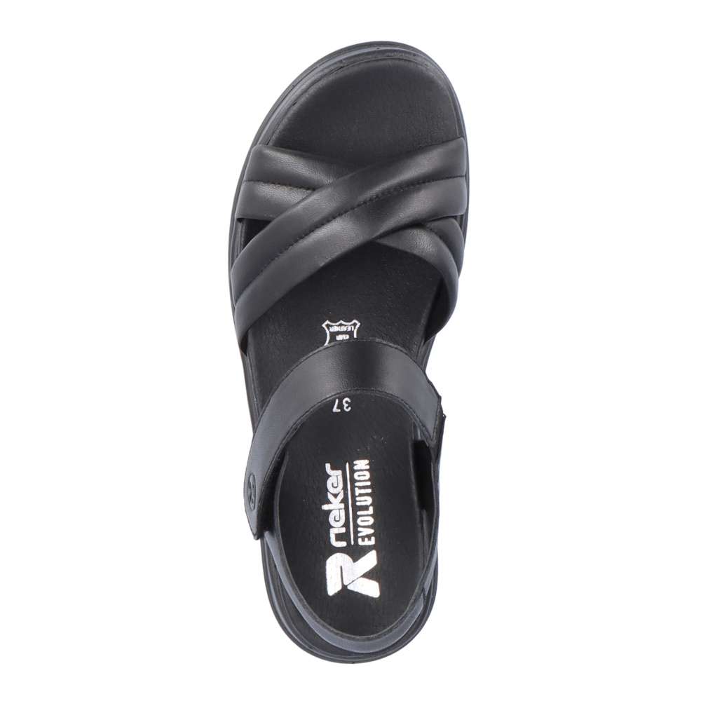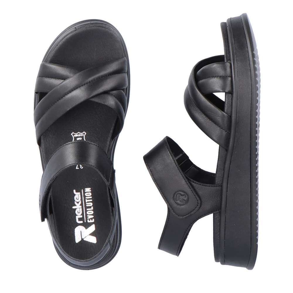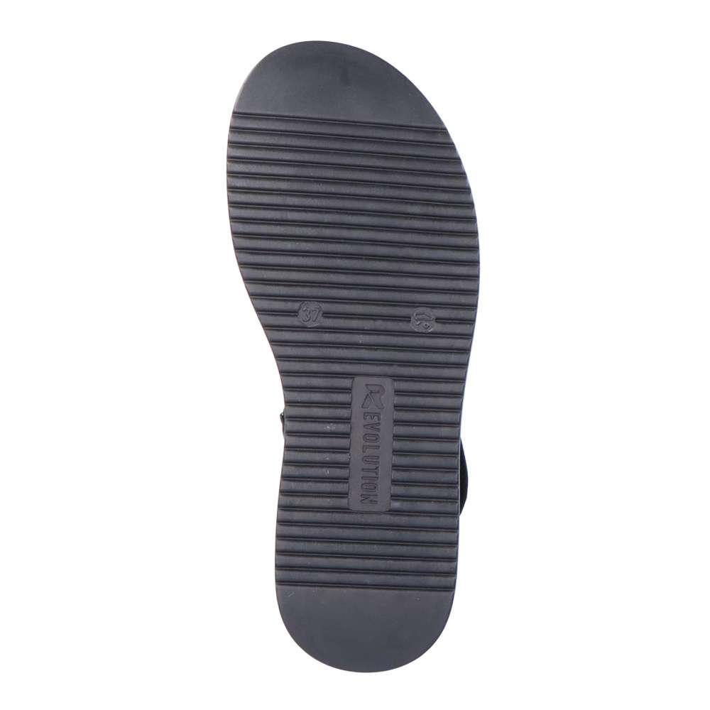 Rieker Revolution je nová řada moderní obuvi s obrovským důrazem na komfort a pohodlí i při celodenním nošení. Tyto černé sandály značky Rieker vyrobené z hladké kůže jsou dokonalým univerzálním kouskem této sezóny. Díky suchému zipu lze botu obout za okamžik. Nárazy absorbující a velmi lehká podrážka s extra měkkou stélkou zajišťuje pohodlné nošení. Nemusíte už přemýšlet co si obujete k sukni nebo šatům, vždy doladíte oblečení tímto kouskem.