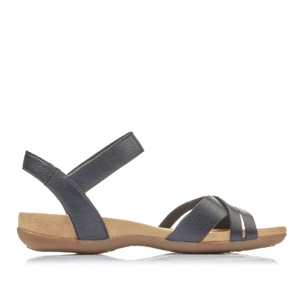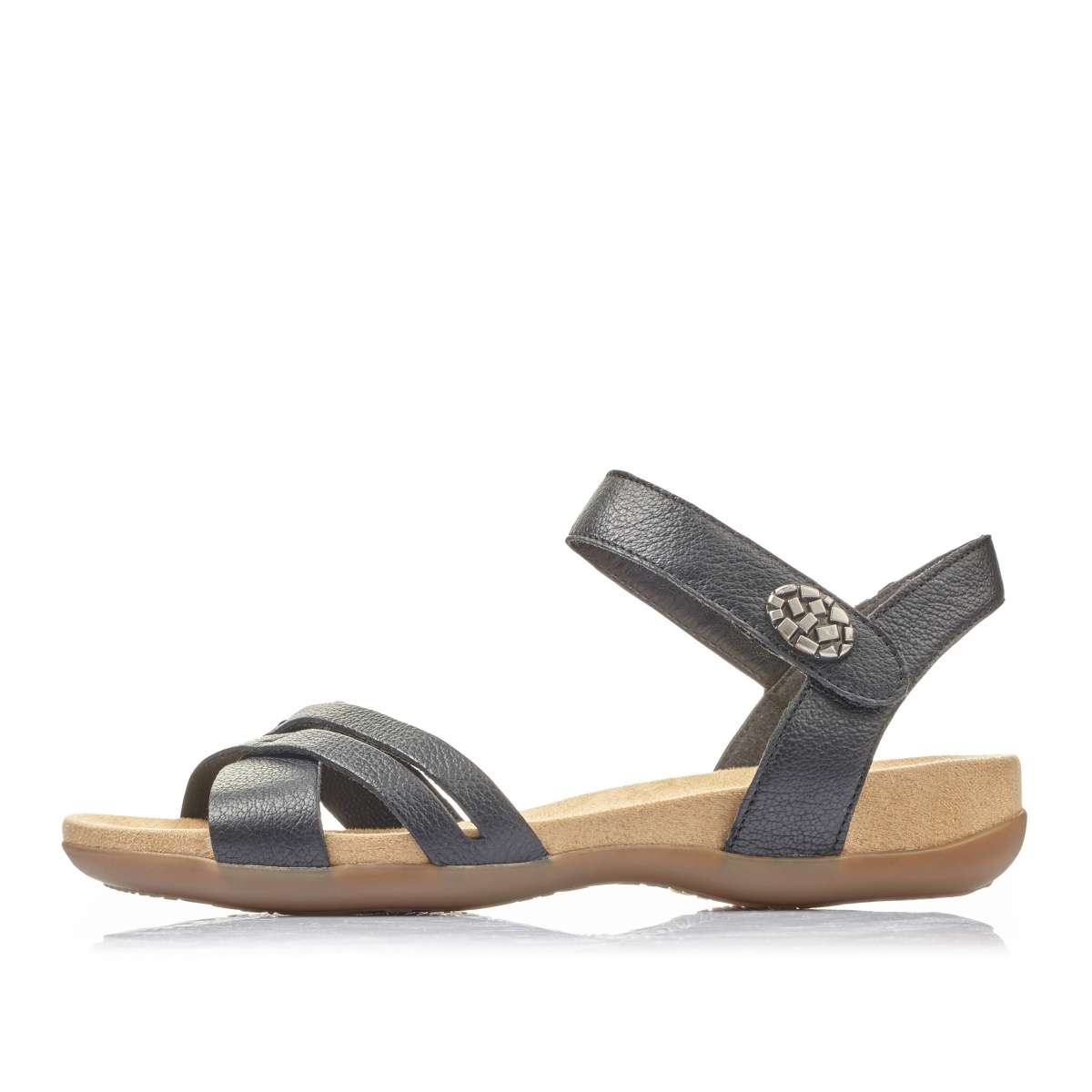 Dámské sandály značky RIEKER mají hladký povrch a kulatou špičku. Zdobené kovovou aplikací na vnější straně pásku kolem kotníku, kterým si botu díky suchému zipu přizpůsobíte dle svých požadavků. Pásky v oblasti špice jsou pevné a designově překřížené. Tento pohodlný a velice elegantní model unosíte na procházku městem, tak do práce.