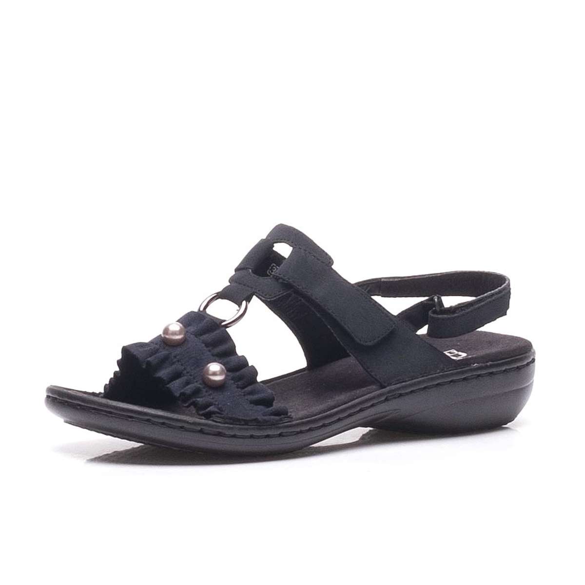 Dámské sandály v tmavě modré barvě s předním páskem zdobeným perlami, u kterých lze výšku v nártu upravit pomocí zapínání na suchý zip. Páskem kolem kotníku se zapínáním na suchý zip si zase můžete sandály přizpůsobit přímo na svou nohu. Obuv je vhodná na společenské akce, rodinné oslavy i každodenní procházky.