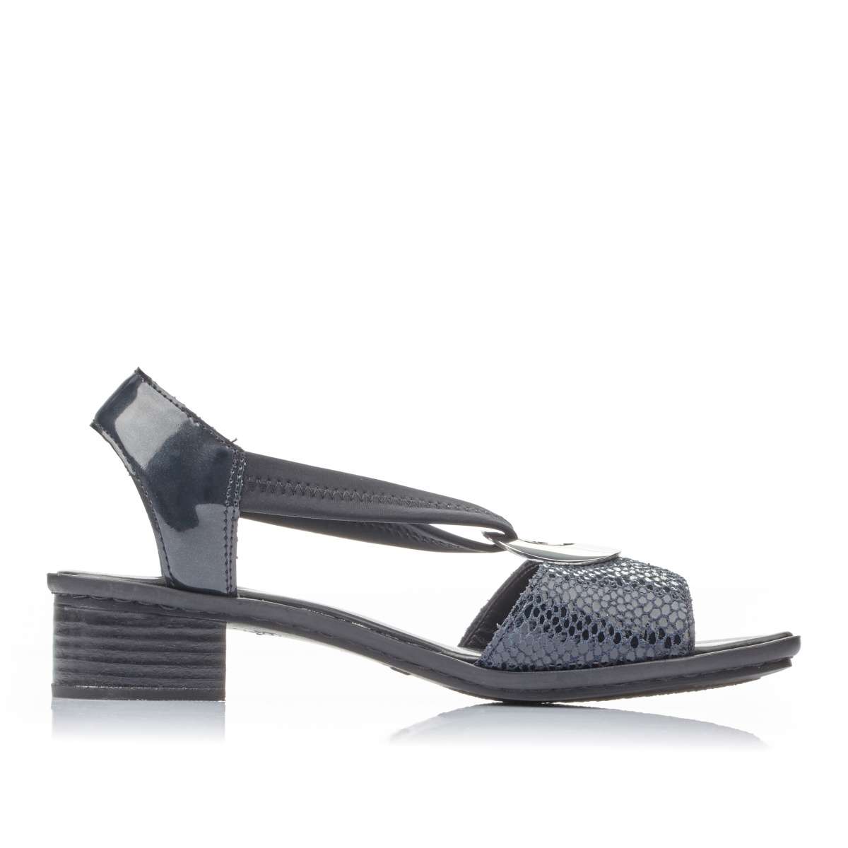 Dámské sandálky značky RIEKER, u kterých si na první pohled můžete všimnout velké kovové, zdobné spony na nártu s upevněnou gumou pro snadné nazutí.