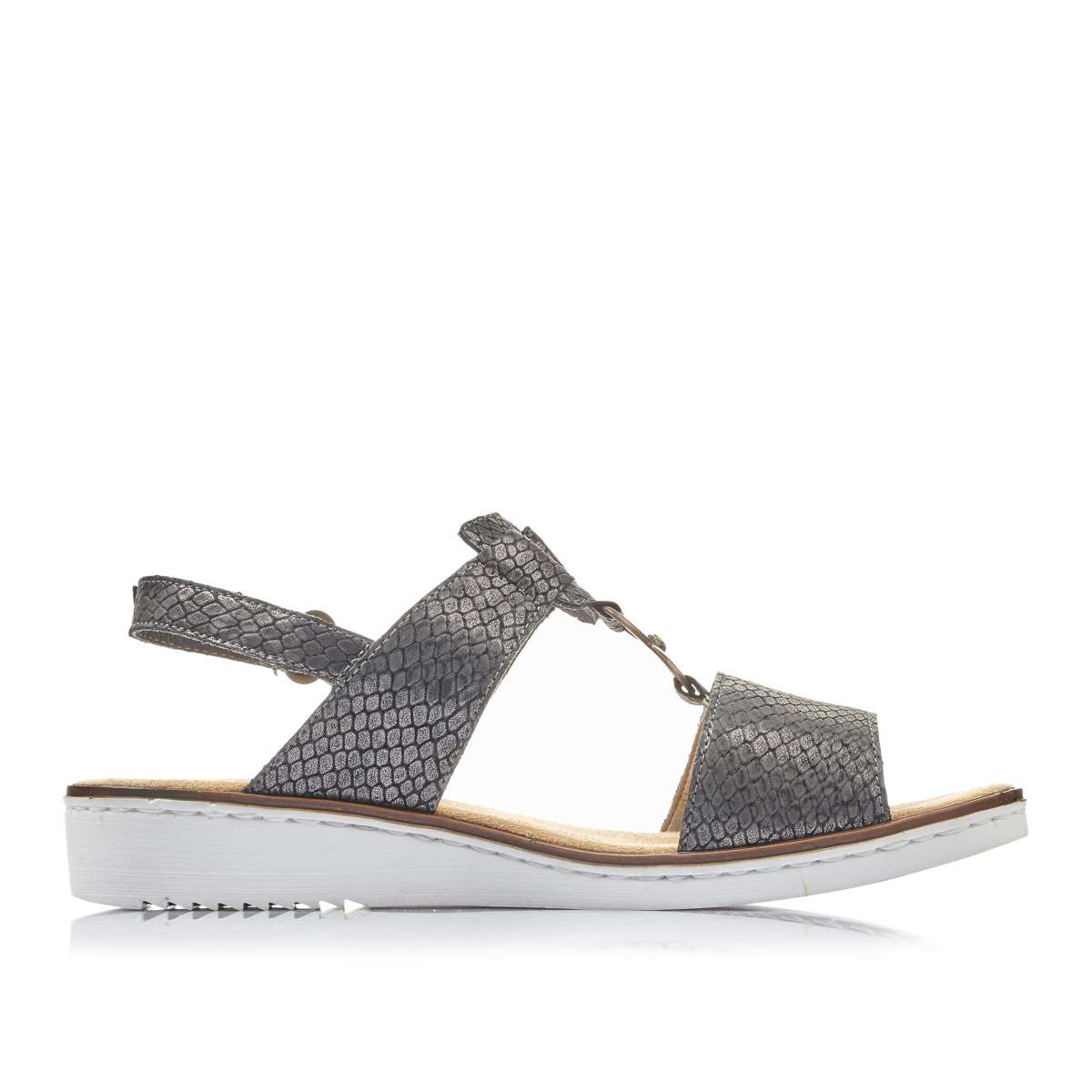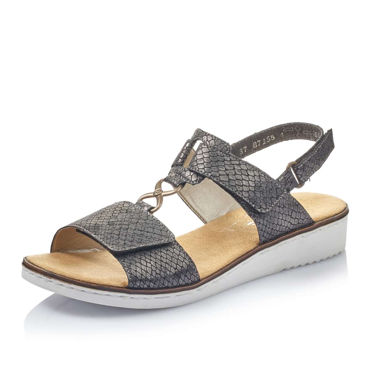 Dámské sandály značky RIEKER s metalickými odlesky a jednoduchým vzorem. Zdobná kovová spona spojuje vrchní a přední část svršku. U těchto bot na první pohled upoutají pozornost dva pásky na suchý zip, díky kterým můžete upravovat botu tak, že se přizpůsobí Vašim chodidlům. Tyto sandály spojují eleganci a stylovou jistotu. Obuv je skvělá hlavně v kombinaci s krátkými šaty, ale hodí se i k úzkým džínům.