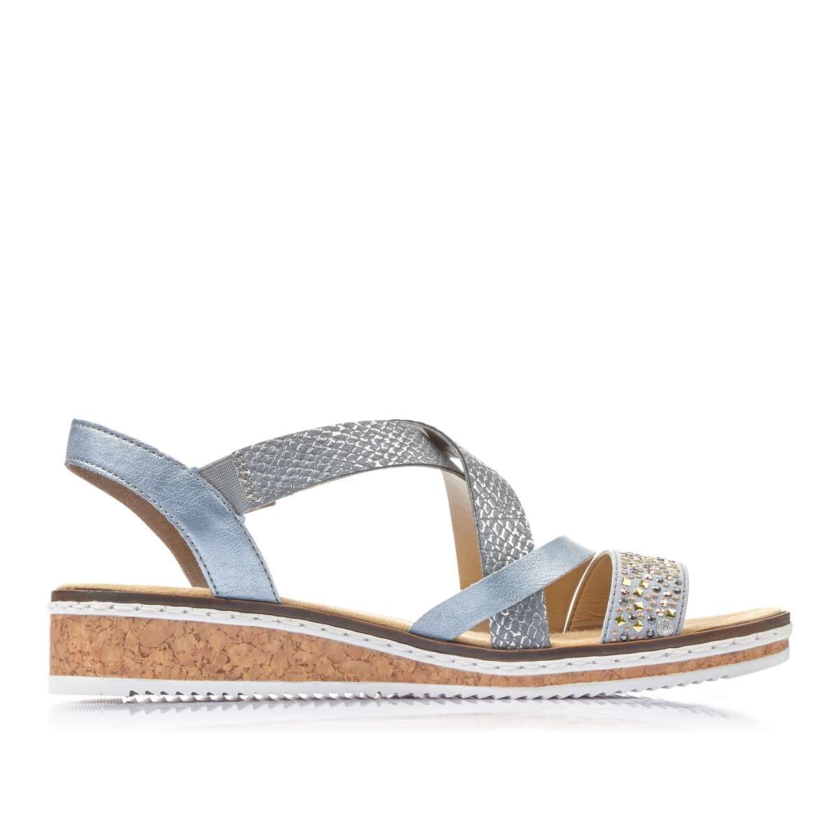 Dámské sandály s imitací korku na podešvi, jsou zdobené kamínky na pásku ve špici a metalickými odlesky pásku přes nárt i v patě. Pásek přes nárt má na vnější straně suchý zip, druhý pásek přes nárt má na vnitřní straně pružnou gumičku pro snadné obutí. Tento pohodlný a velice elegantní model unosíte jak ke kraťasům na procházku, tak k sukni do práce.