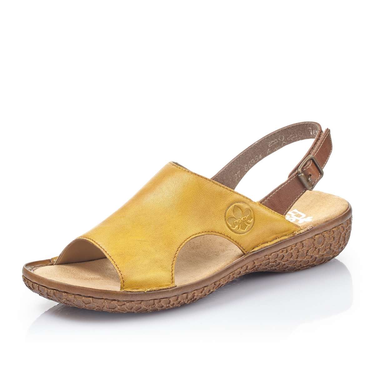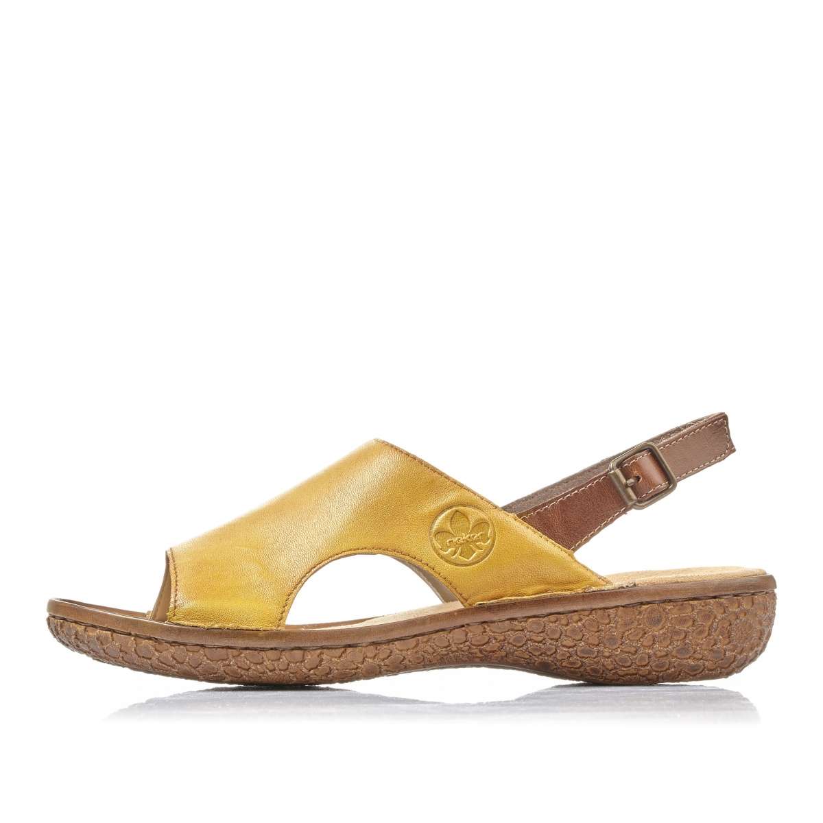 Dámské sandály šité z pravé kůže mají žlutou barvu a podešev se vzorem kytiček. Design udává dominantní svršek přes nárt s logem značky Rieker na vnější straně. Pásek kolem paty má na vnější straně zapínání přezkou pro úpravu boty přímo k Vaší noze. Úžasně pohodlný vzor nebudete chtít zout a vezmete jej ke všem outfitům.