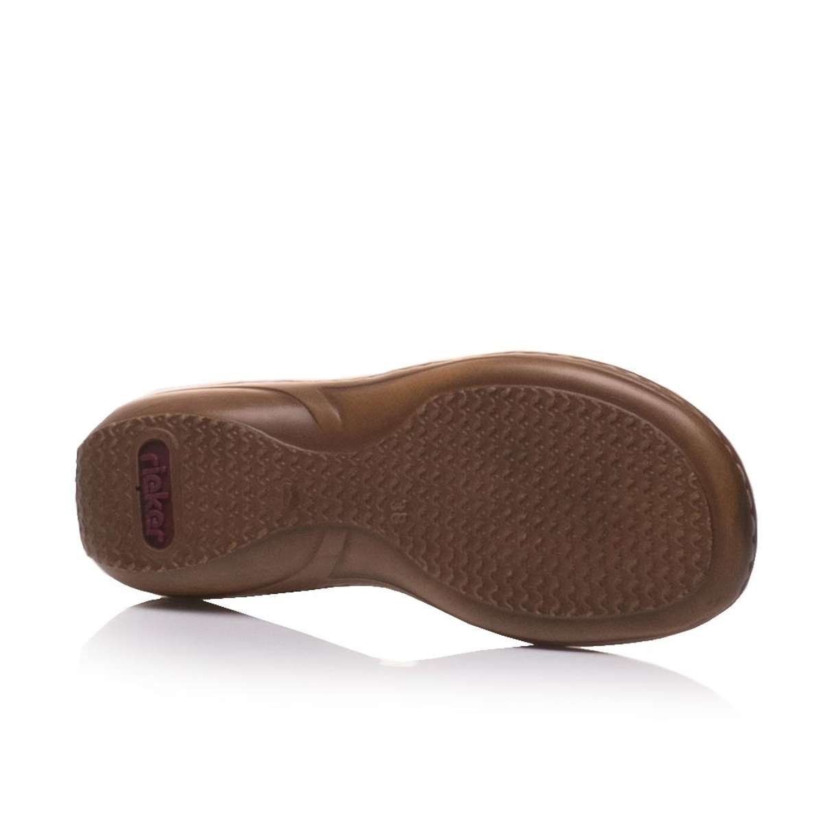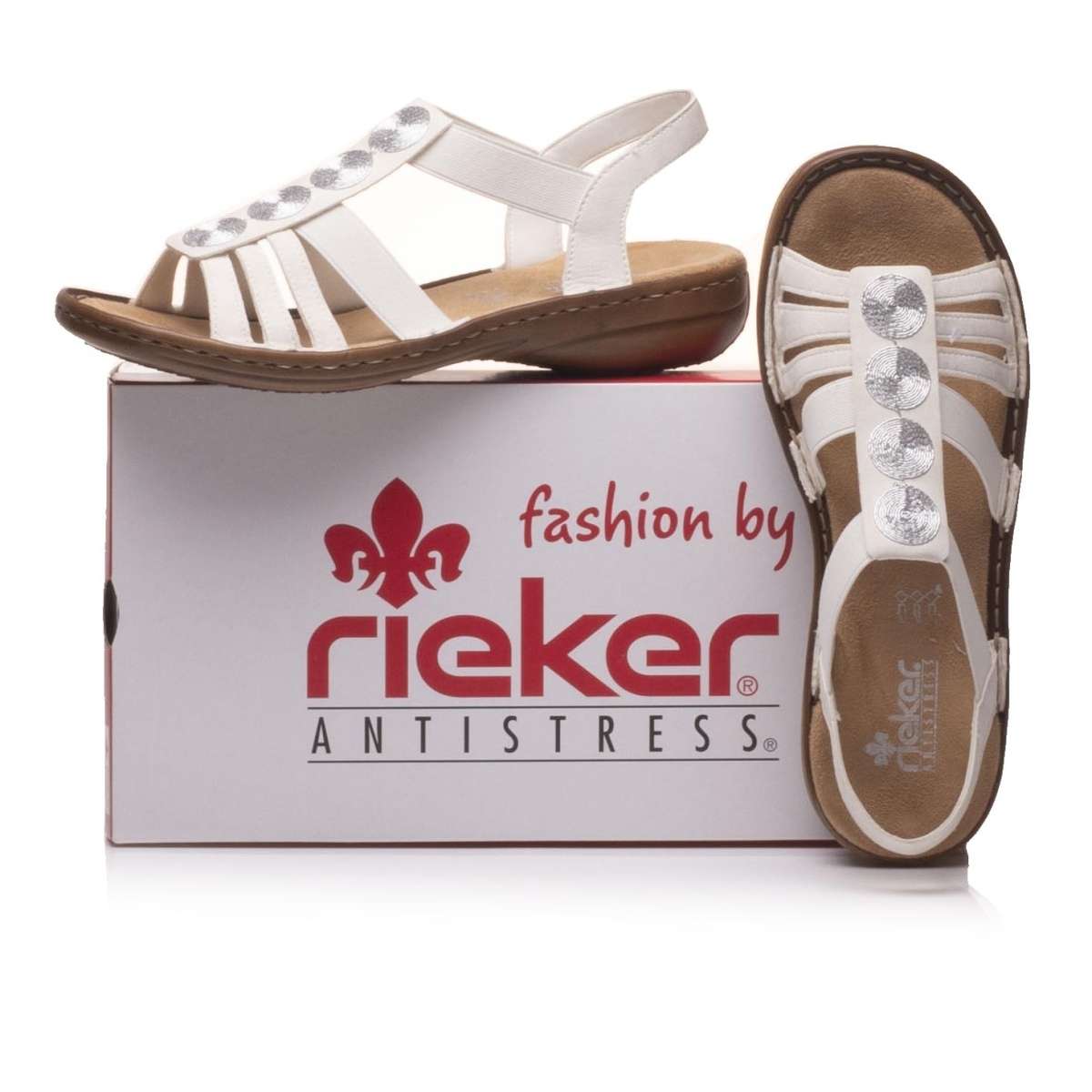 Velice originální sandály Rieker s páskami ve přední části a zdobným spojovacím prvkem. Pružná gumička Vám skvěle usnadní obutí, což jistě oceníte. Měkká stélka zajistí celodenní komfort a podešev o výšce cca 3,5 cm je vyrobena z velmi kvalitního syntetického materiálu. Tento model ve dvou barevných variantách si jednoduše zamilujete. Technologie: Antistress – podešev je díky této technologii lehká, flexibilní, absorbuje nárazy při došlapu a snadno se přizpůsobí každé noze.