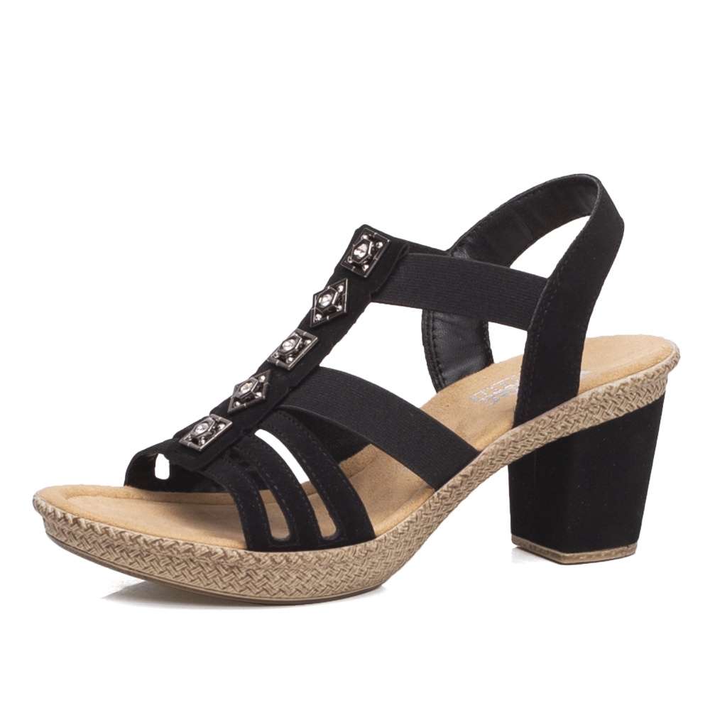 Dámské sandály černé barvy musíte mít ve Vašem botníku. Zdobené jsou středovým páskem tvořeným z pěti stejných ornamentů s kamínkovou aplikací. Střední pásky jsou šity z pružné gumičky pro snadné obutí i přizpůsobení přímo k Vaší noze. Designová podešev a podpatek potažený svrškovým materiálem doladí obuv k dokonalosti. Tento úžasně variabilní kousek unosíte jak od práce, na běžné pochůzky městem, tak na večeři s přáteli.