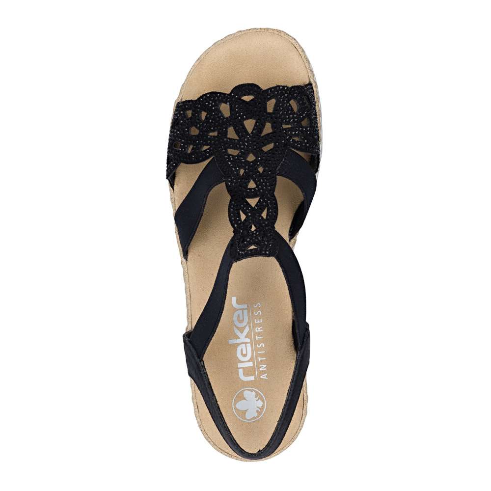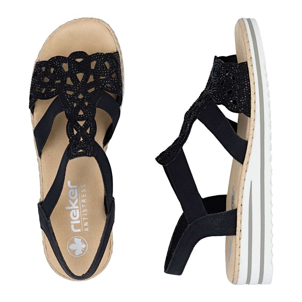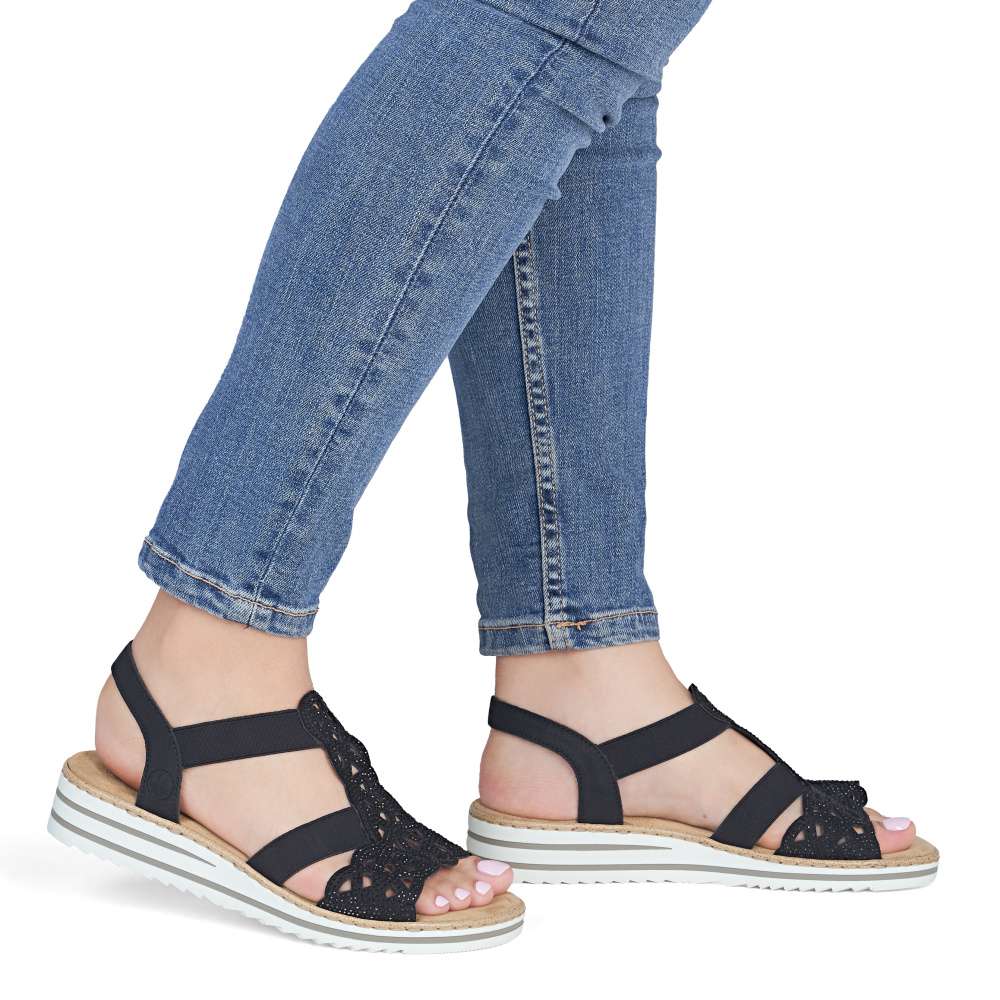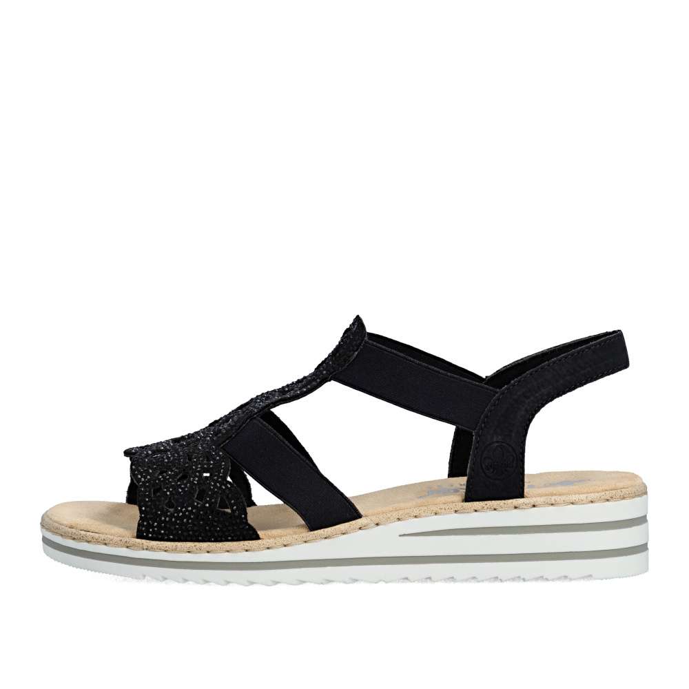 Půvabné sandály RIEKER zaujmou na první pohled svým elegantním zpracováním. Svršek je tvořen kombinací pevných a pružných pásků, které se krásně přizpůsobí noze a zajistí pohodlí při nošení. Výrazným dekoračním prvkem je perforovaný vzor doplněný drobnými kamínky, které dodávají sandálům jemný ženský šarm. Příjemná textilní stélka poskytuje komfort i během celodenního nošení, zatímco podešev účinně tlumí nárazy při chůzi. Ideální volba pro ženy, které touží po eleganci a pohodlí v jednom.