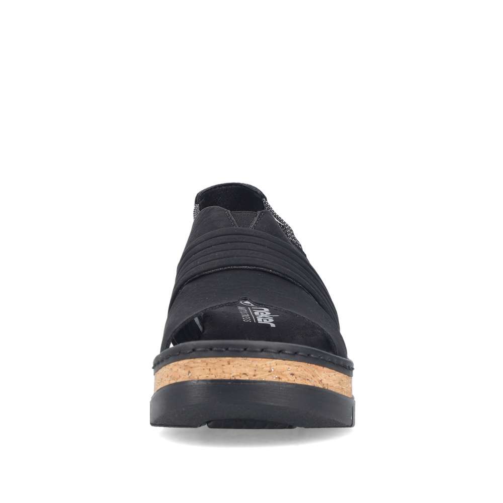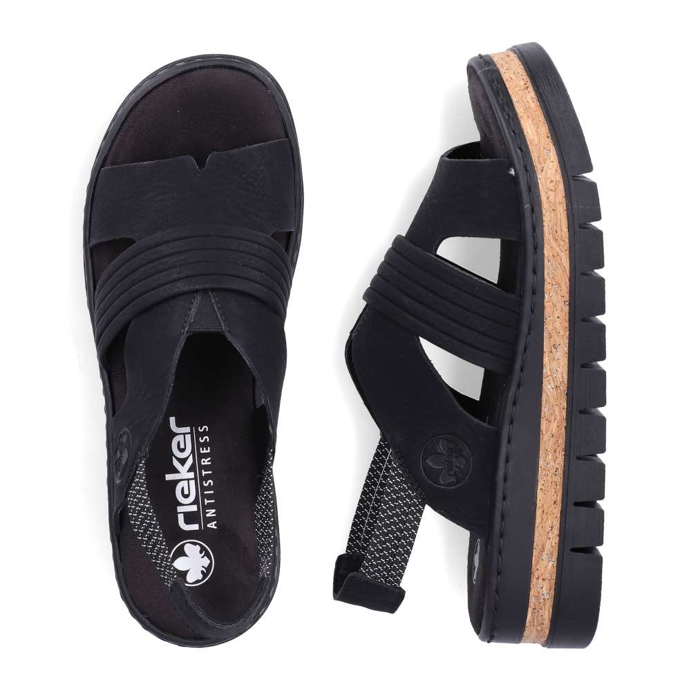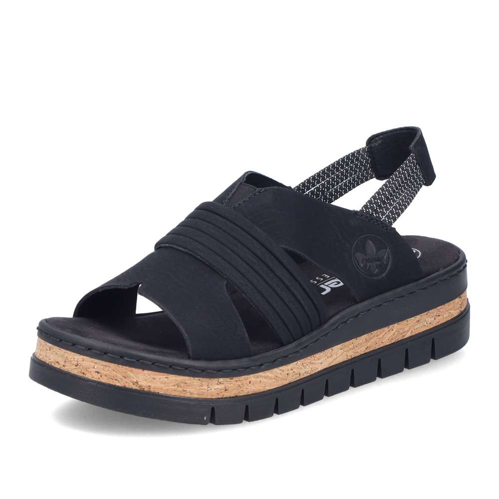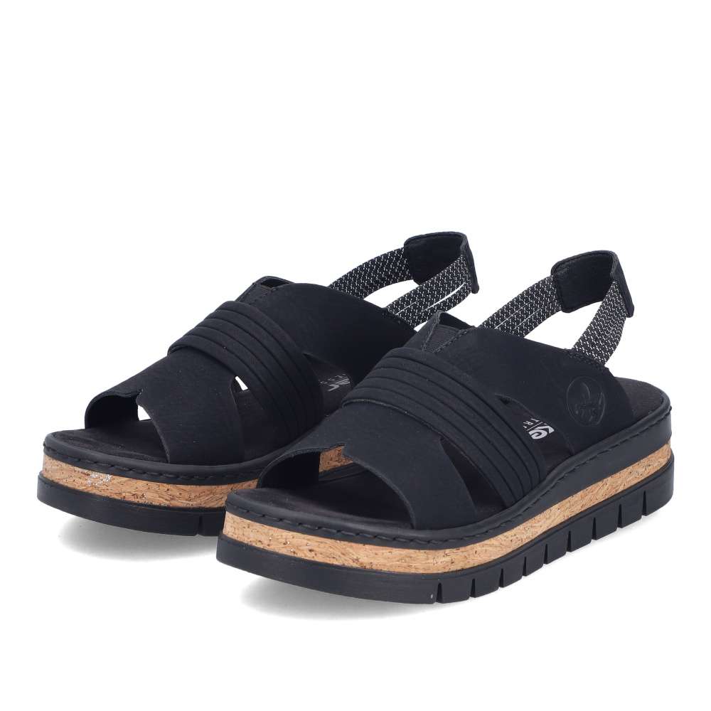 Černé sandály RIEKER okouzlí svou působivou skladbou elegantně poskládaných pásků, které přidají ženský šarm. Zadní pružné gumičky usnadní nazutí a přizpůsobí se vaší noze. Měkká textilní stélka rozmazlí vaše chodidla příjemným došlapem, zatímco vyšší podešev tlumí nárazy a dodává stabilitu, přičemž svým designem podtrhuje jedinečný charakter sandálů. Tyto sandály nejsou jen obuví – jsou výrazem vašeho stylu, sebevědomí a radosti z každého letního kroku.