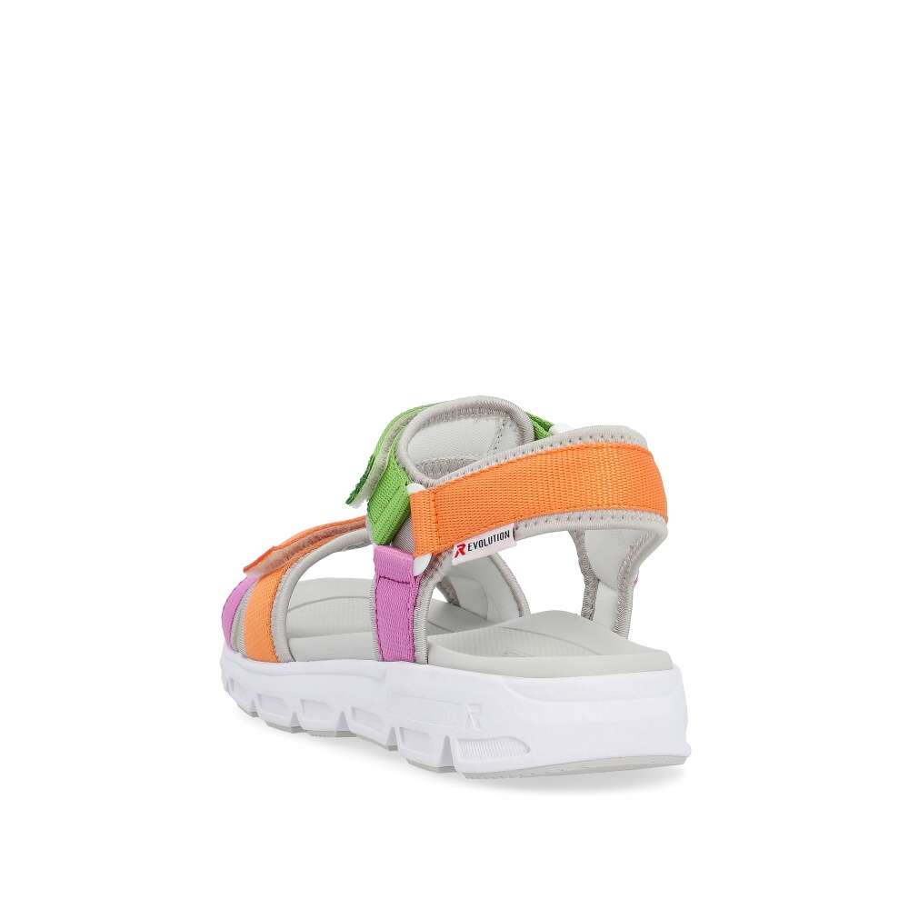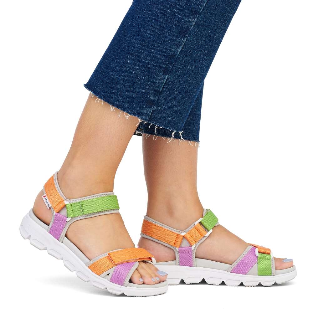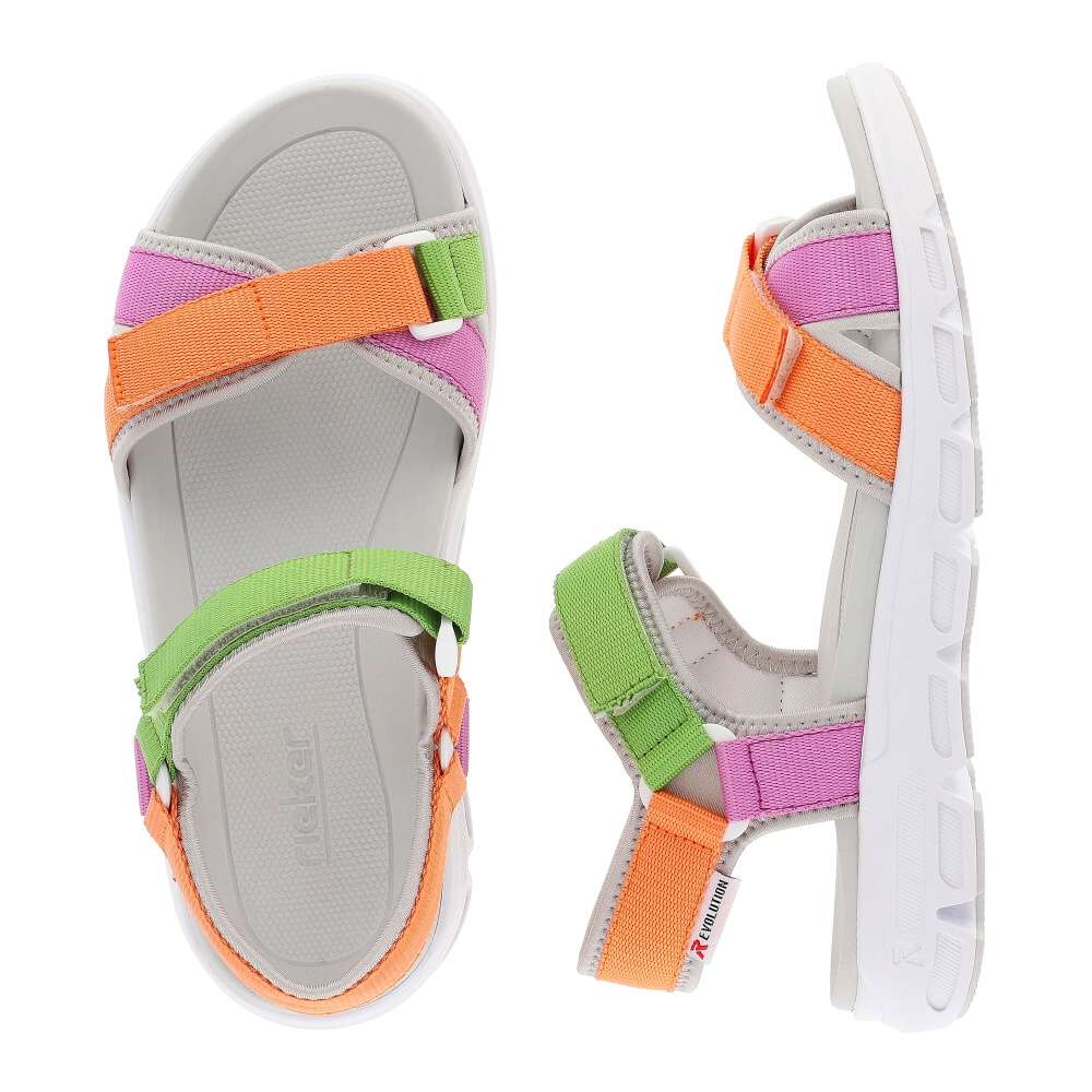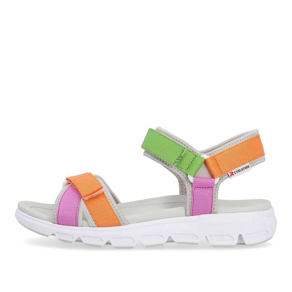 Rieker Revolution je nová řada moderní sportovní obuvi s obrovským důrazem na komfort a pohodlí i při celodenním nošení. Tyto dámské sandálky budou chtít nosit všechny ženy, které mají rády pestré barvy. Sandálky jsou velice pohodlné a pásky si můžete nastavit díky zapínání na suchý zip. Boty jsou vhodné jak ke kalhotám, tak k sukni nebo třeba k šatům. Tak neváhejte a vyrazte do města.