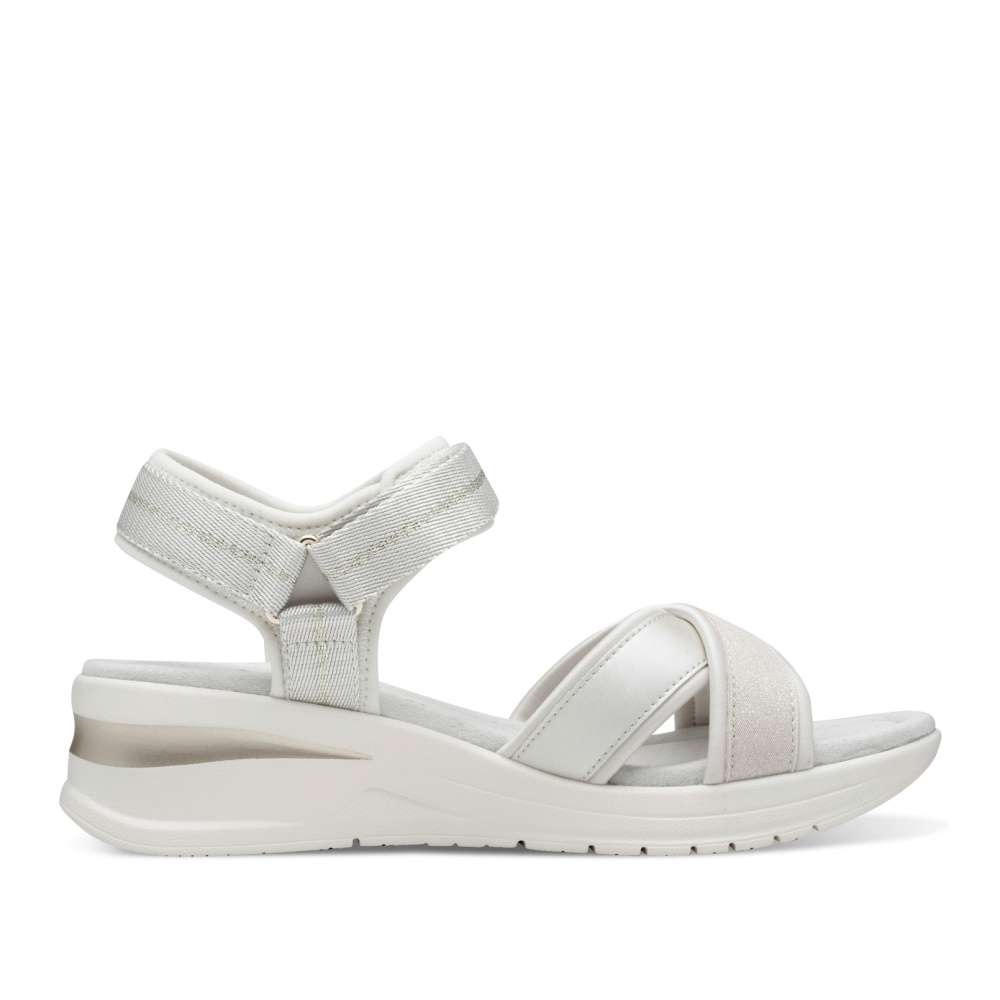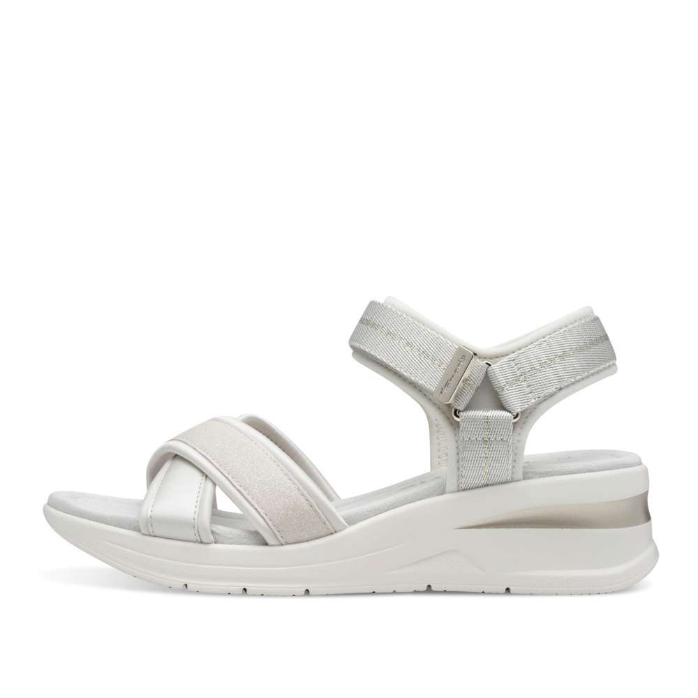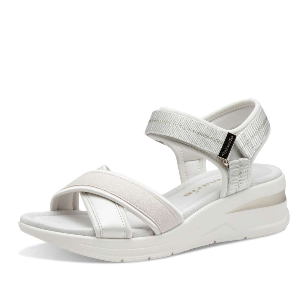 Sportovně-elegantní sandály značky Tamaris na vyvýšené platformě představují dokonalou kombinaci stylu a funkčnosti. Jejich design zaujme třpytivými detaily, které zdobí jak pásky, tak platformu, a dodávají obuvi moderní a svěží vzhled. Překřížené pásky přes prsty, vyrobené ve dvou různých designech, přidávají sandálům dynamiku a jedinečnost, zatímco pás kolem kotníku na suchý zip zajišťuje snadné obouvání a přizpůsobení noze. Díky tomu sandály perfektně sedí a poskytují maximální pohodlí. Tyto sandály jsou skvělou volbou pro ženy, které hledají stylovou obuv vhodnou jak pro každodenní nošení, tak pro volnočasové aktivity, kdy chtějí vypadat šik a zároveň se cítit pohodlně.