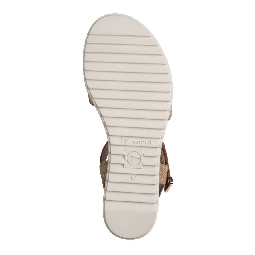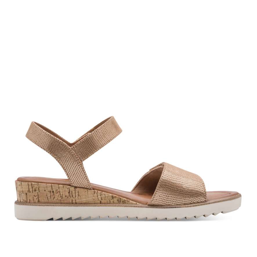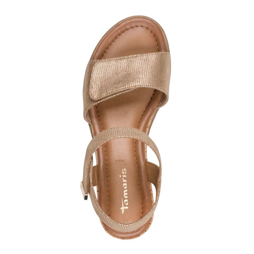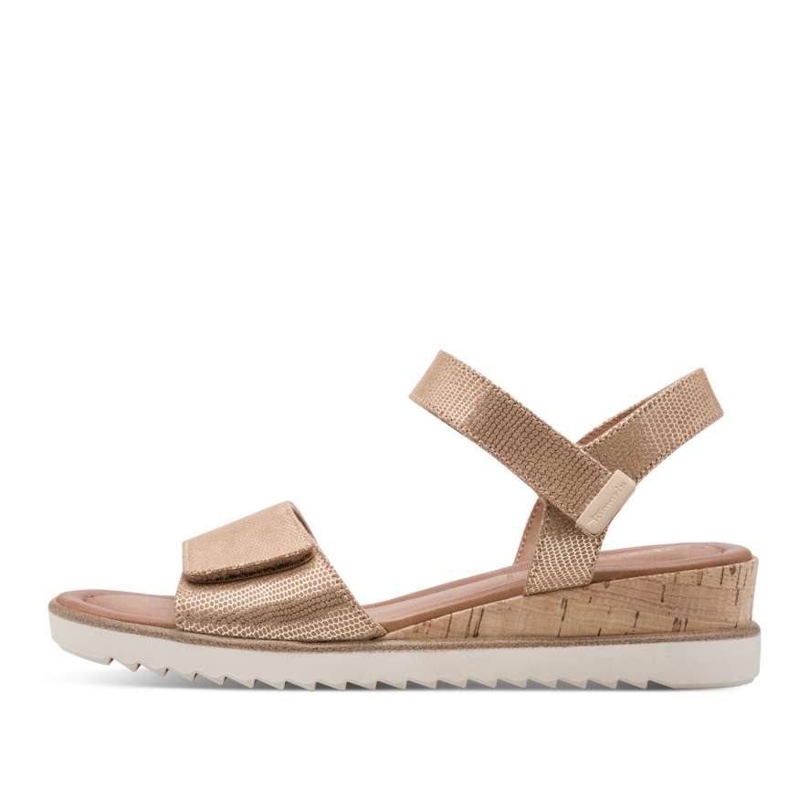 Dámské sandálky Tamaris na vyšším klínku spojují elegantní vzhled a maximální pohodlí. Stylový „korkový“ klínek dodává obuvi jedinečný vzhled, zatímco měkká stélka zajišťuje celodenní komfort při chůzi. Přední jednoduchý pásek přes prsty je vybaven suchým zipem pro snadné nastavení a perfektní přizpůsobení. Okolo kotníku najdete užší pásek na zip, který usnadňuje obouvání a pevně drží nohu. Ideální volba pro každodenní nošení i letní příležitosti.