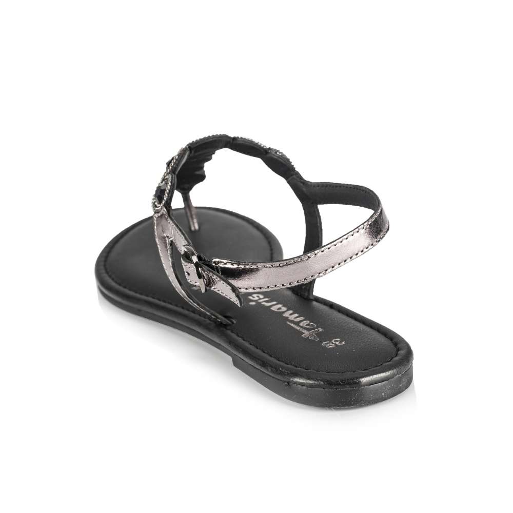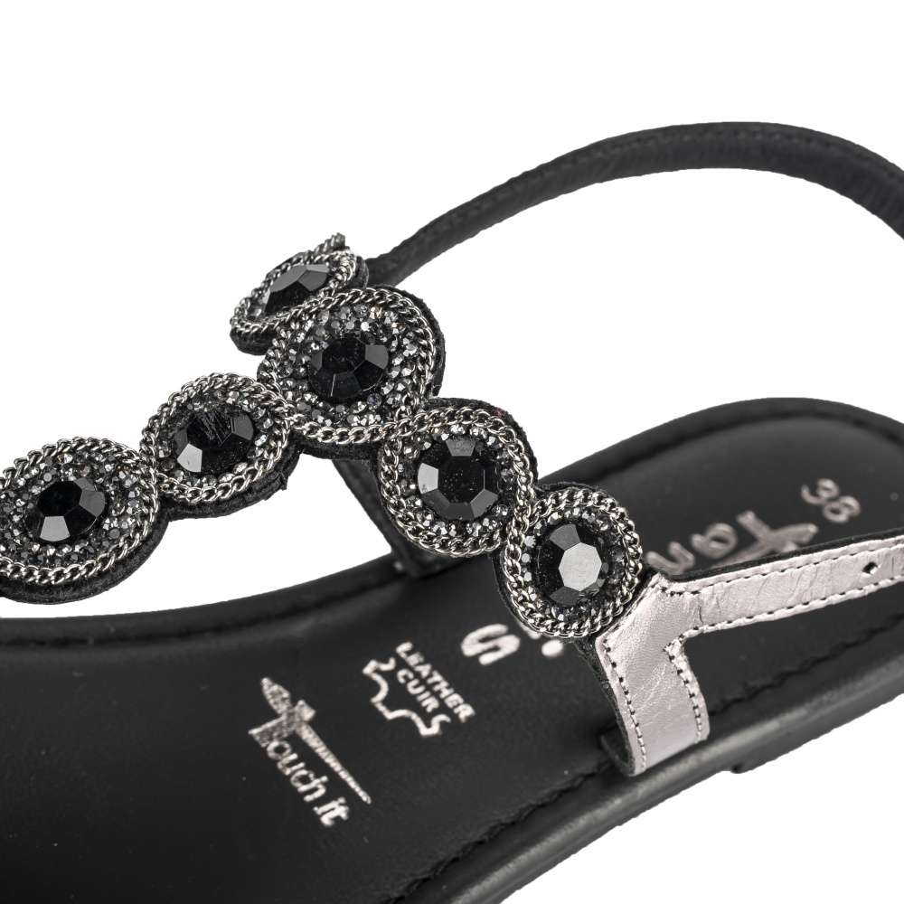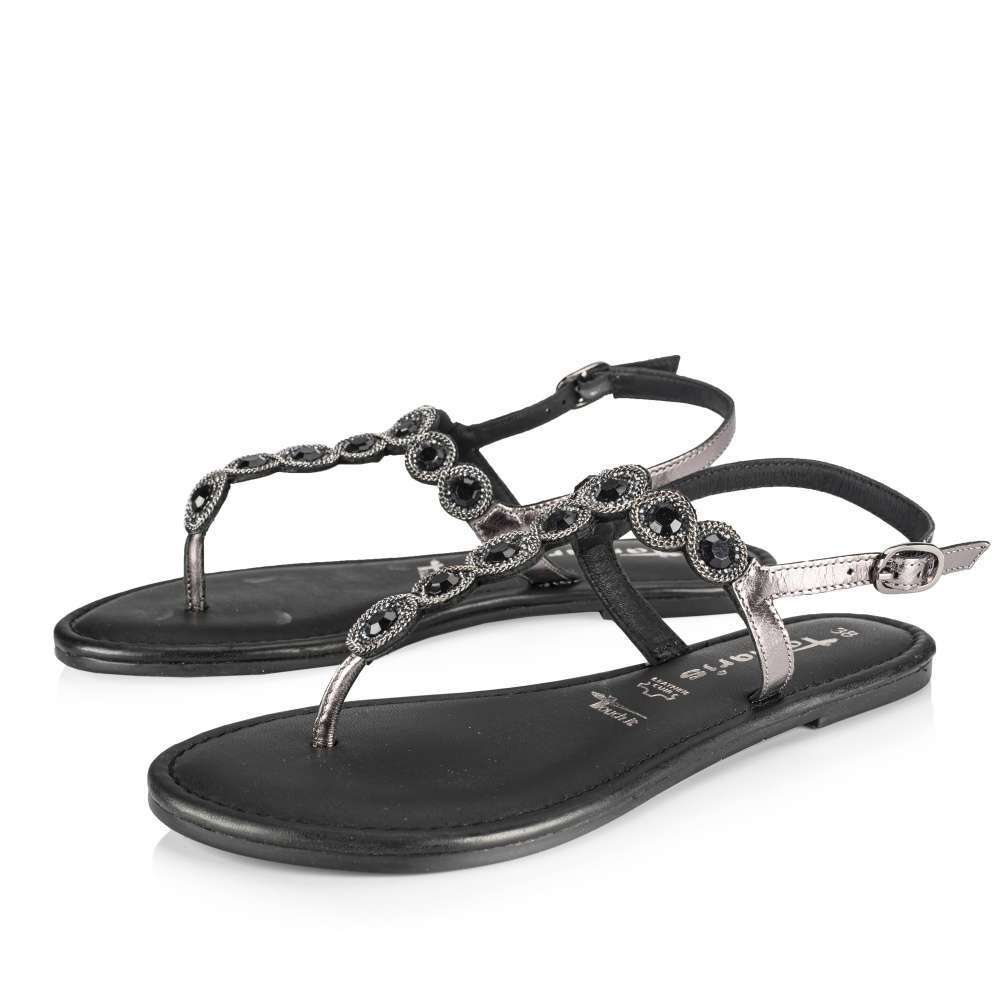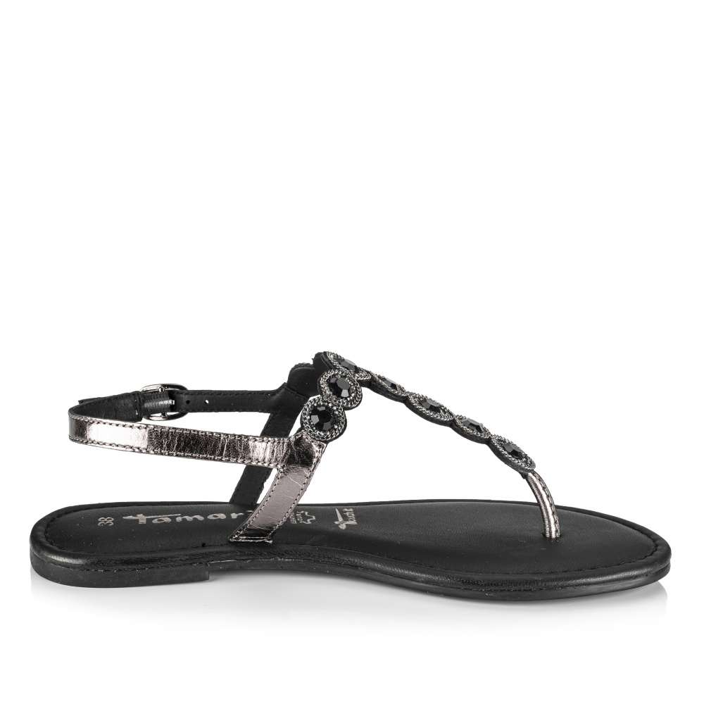 Detailní informace Tento dámský sandálek žabkového stylu od značky Tamaris je jasnou volbou na letní měsíce pro každou ženu. Zatímco Váš nárt obepne kožený pásek zdobený blýskavými kamínky a drobným řetízkem, bude Vaši patu jistit druhý nastavitelný pásek s funkční přezkou. Měkká stélka zajišťuje příjemné nošení po celý den a díky hladkému koženému povrchu se navíc velmi jednoduše udržuje. Sandálek bude skvělou volbou na výlet do města či na dovolenou u moře.
