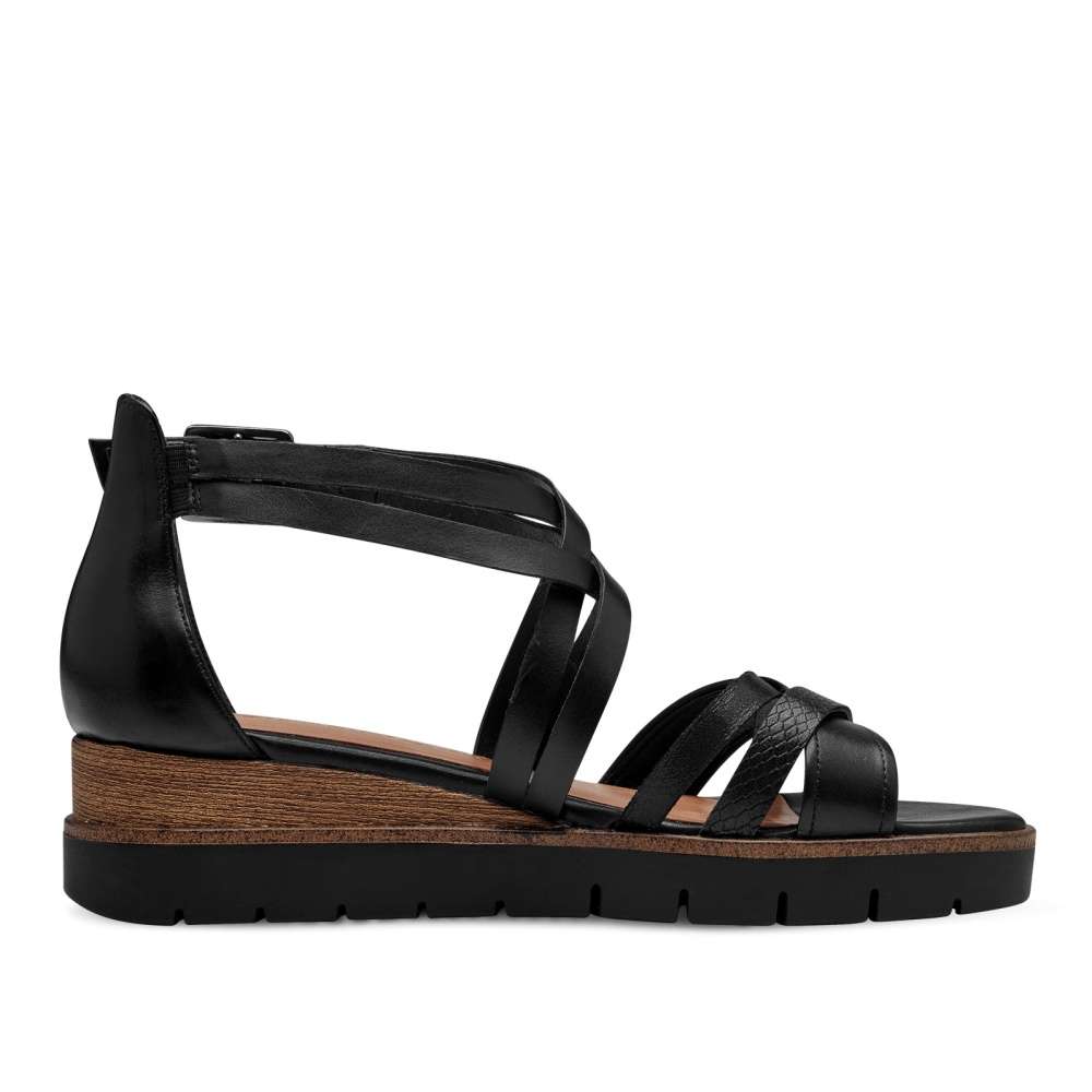 Tyto sandálky Tamaris vás nadchnou svým výjimečným designem. Pásky, důmyslně poskládané přes nárt, vytvářejí unikátní a poutavý vzhled, který okouzlí na první pohled. Vyšší barevně kombinovaná podrážka dodává sandálkům moderní prvek a zajistí potřebnou stabilitu. Spona u kotníku zajišťuje snadné obouvání, zatímco měkká stélka z paměťové pěny se postará o maximální pohodlí. Tyto černé sandálky jsou ideální volbou pro ty, kteří hledají elegantní a moderní obuv pro každý den. Technologie: Touch-it – měkká stélka, která se dokonale přizpůsobí tvaru nohy, a díky tomu při nošení zajišťuje optimální pohodlí.
