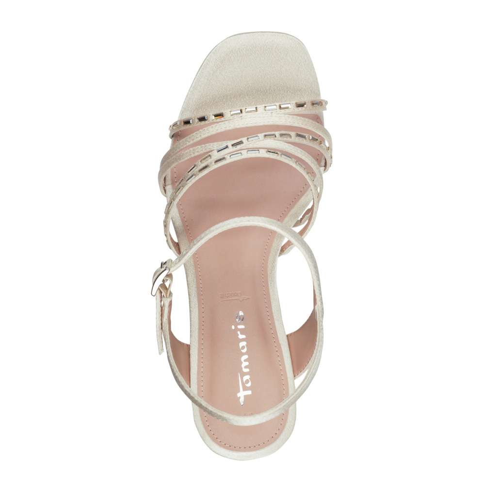 Staňte se nepřehlédnutelnou hvězdou každé události v těchto oslnivých sandálech Tamaris. Efektně poskládané pásky v přední části zdobí lesklé aplikace, které dodají vašemu vzhledu luxusní třpyt. Pásek u nártu s nastavitelnou sponou zajistí dokonalé přizpůsobení a pevné usazení na noze. Měkká stélka se postará o komfort, takže si můžete užívat eleganci bez nepohodlí. Vysoký široký podpatek prodlouží siluetu a dodá vám ladnost i stabilitu, zatímco protiskluzová úprava podpatku poskytne jistotu při každém kroku. Tyto sandále Tamaris zvýrazní Váš žensky půvab při každé příležitosti.