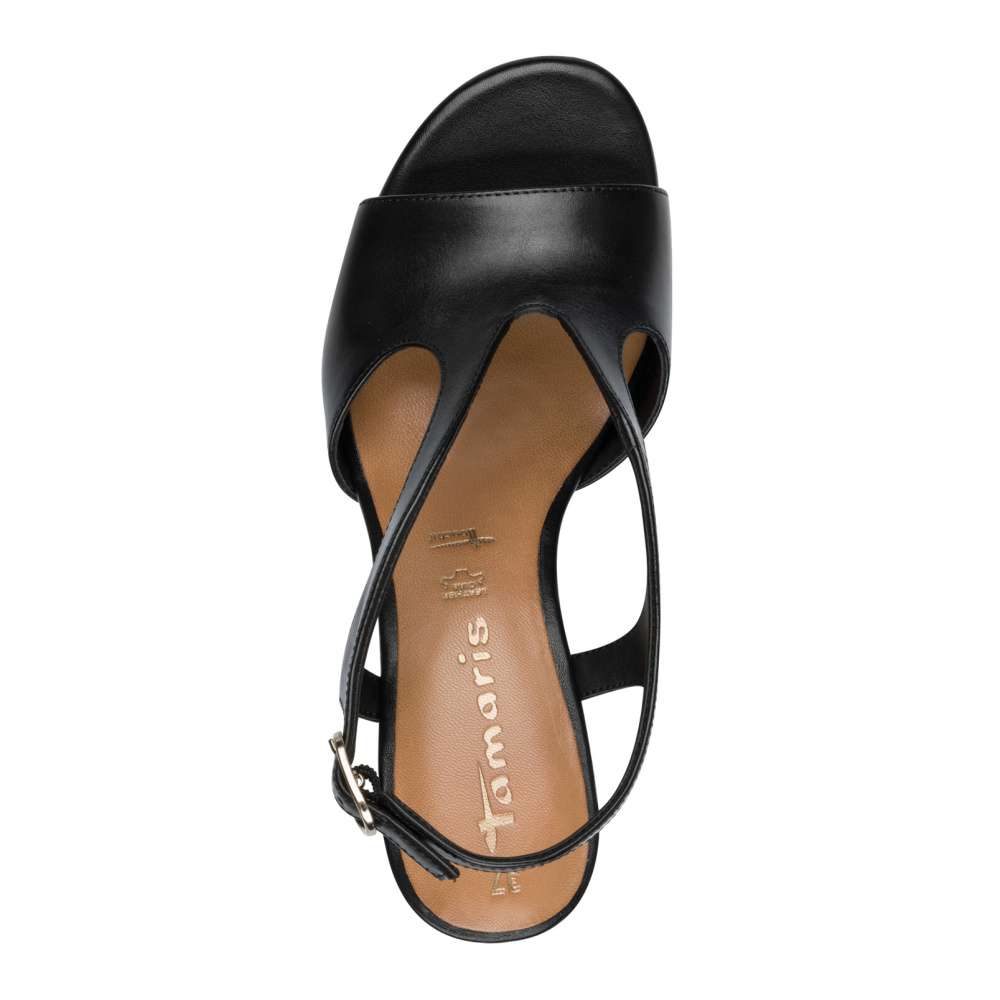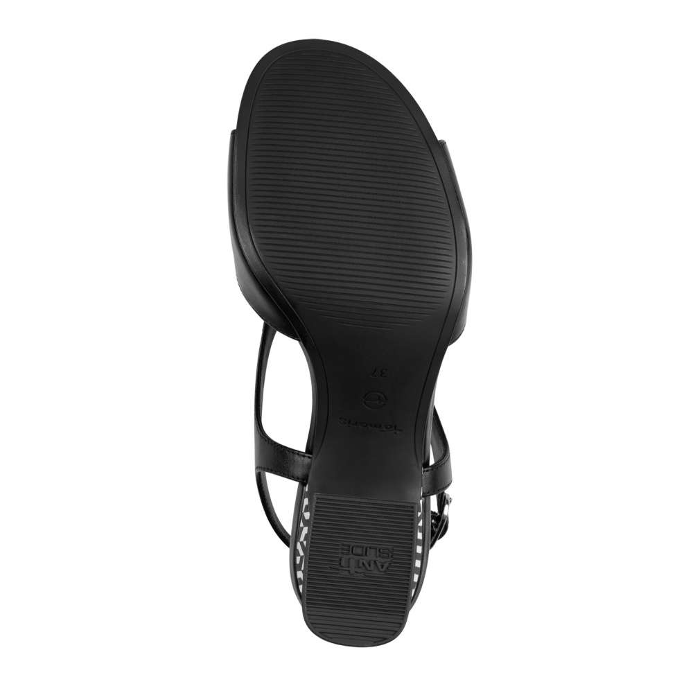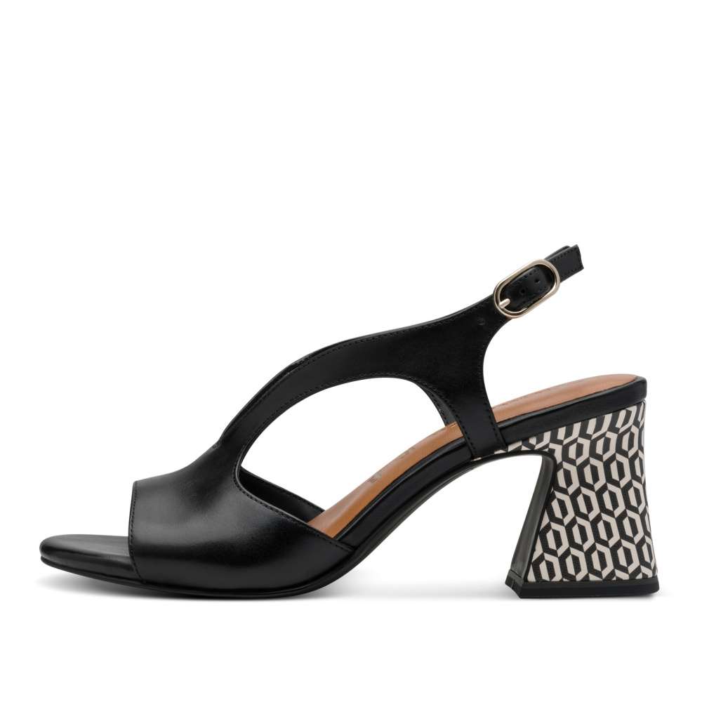 Těmto sandálkům TAMARIS v černém provedení nelze odolat! Kožený svršek s originálními výřezy dodává modelu jedinečný vzhled, zatímco nastavitelný pásek se sponou zajistí dokonalé přizpůsobení. Maximální pohodlí při chůzi zajistí měkká kožená stélka s paměťovou pěnou. Ženskou siluetu prodlouží širší podpatek s propracovanými liniemi a originálním designem, který je navíc vybavený protiskluzovým prvkem pro bezpečný každý krok. Styl a komfort v jednom – ideální volba pro vaše letní dny!