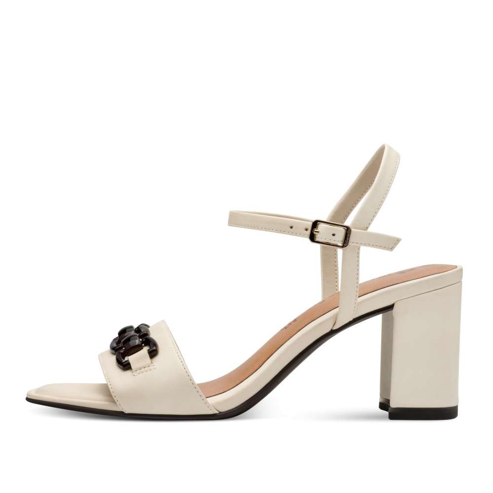 Detailní informace Stylové sandále Tamaris zaujmou elegantním béžovým koženým svrškem, který se snadno kombinuje s letními outfity. Přední pásek zdobí aplikace v podobě řetízku, která dodává obuvi jemný nádech luxusu a pásek u kotníku je vybaven nastavitelnou sponou, takže si sandály snadno přizpůsobíte přesně podle své nohy. Vyšší podpatek opticky prodlouží nohy a zvýrazní siluetu, přičemž díky protiskluzové technologii zajišťuje stabilitu při chůzi. Měkká kožená stélka s paměťovou pěnou přináší maximální pohodlí po celý den. Elegantní, pohodlné a dokonale ženské – sandále Tamaris budou ozdobou každého letního dne.