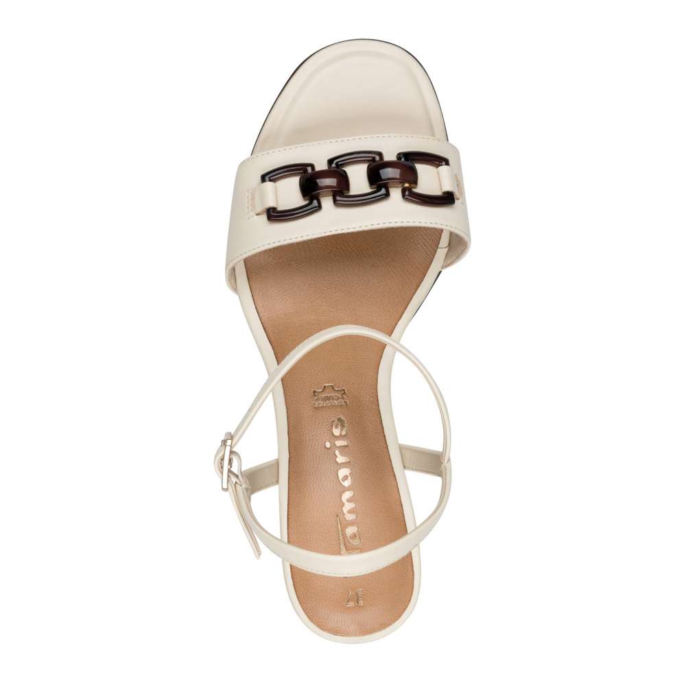 Stylové sandále Tamaris zaujmou elegantním béžovým koženým svrškem, který se snadno kombinuje s letními outfity. Přední pásek zdobí aplikace v podobě řetízku, která dodává obuvi jemný nádech luxusu a pásek u kotníku je vybaven nastavitelnou sponou, takže si sandály snadno přizpůsobíte přesně podle své nohy. Vyšší podpatek opticky prodlouží nohy a zvýrazní siluetu, přičemž díky protiskluzové technologii zajišťuje stabilitu při chůzi. Měkká kožená stélka s paměťovou pěnou přináší maximální pohodlí po celý den. Elegantní, pohodlné a dokonale ženské – sandále Tamaris budou ozdobou každého letního dne. Technologie: Touch-it – měkká stélka, která se dokonale přizpůsobí tvaru nohy, a díky tomu při nošení zajišťuje optimální pohodlí. ANTISLIDE – obuv s patentovaným protiskluzovým prvkem v podpatku, který výrazným způsobem snižuje riziko uklouznutí na kluzkém povrchu. ANTISHOKK – speciální odpružující prvek v podpatku, který tlumí nárazy a otřesy způsobené chůzí o cca 50 % a dlouhodobě tedy ulevuje celé partii zad.