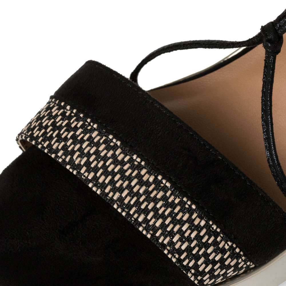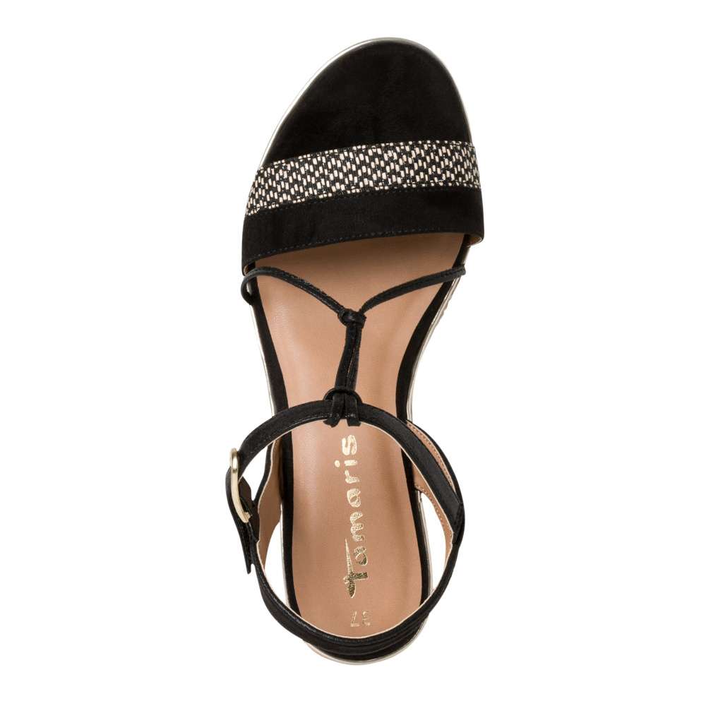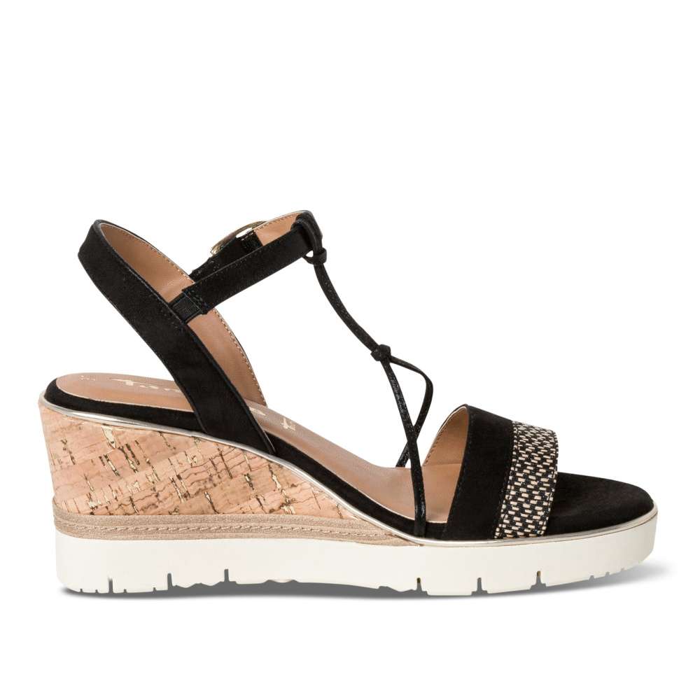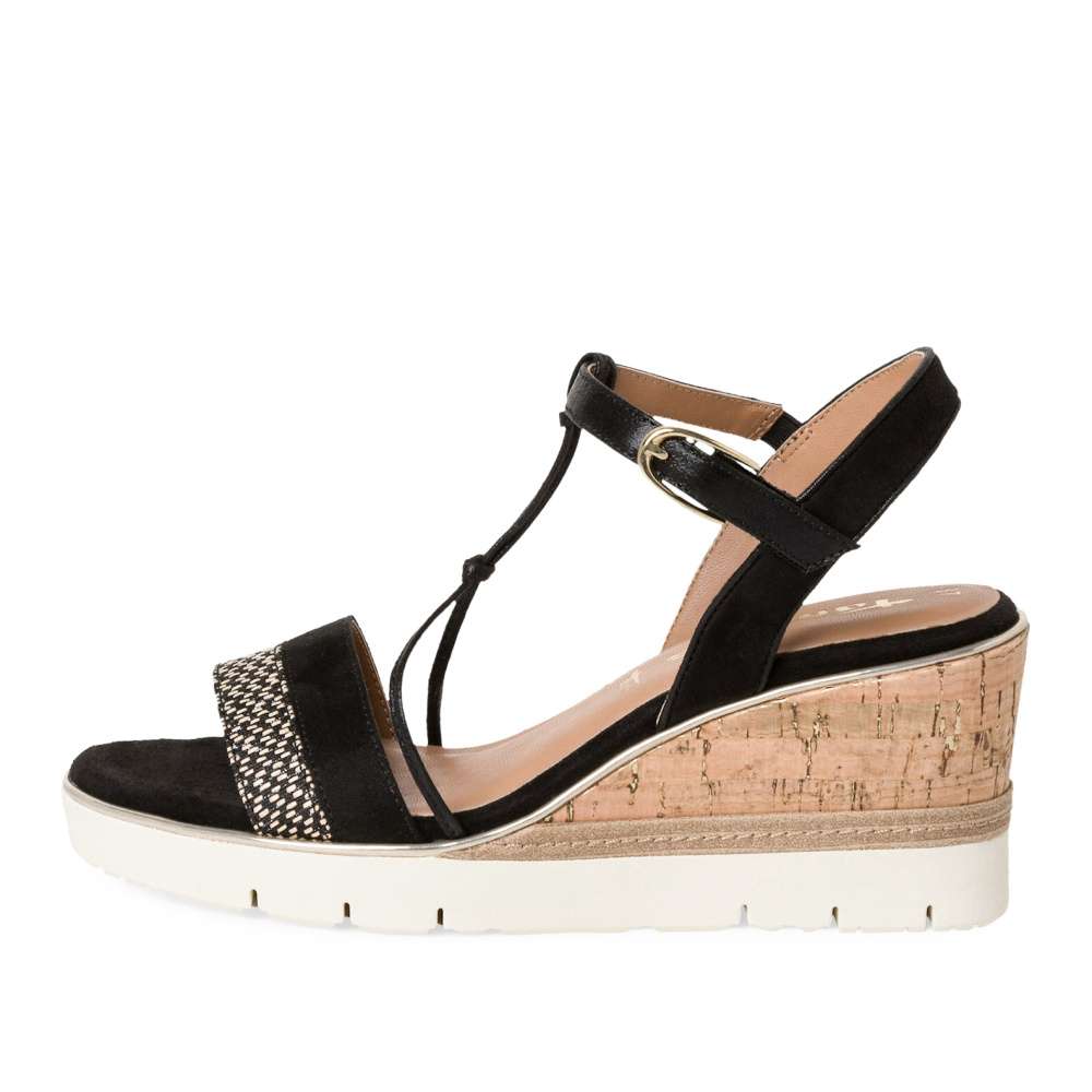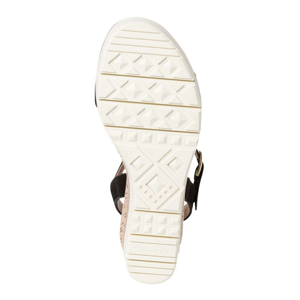 Stylové sandále značky Tamaris s vyšší platformou, která má korkový vzhled a kontrastní bílou část. Širší pásek na nártu je rozdělen na dvě části, což dodává sandálkům zajímavý vzhled. Úzký pásek spojuje nárt s kotníkovou částí, kde se nachází pásek se zlatou přezkou pro snadné přizpůsobení. Měkká stélka zajišťuje komfort při nošení, což dělá tyto sandálky ideální volbou pro pohodlný, ale stylový letní look.