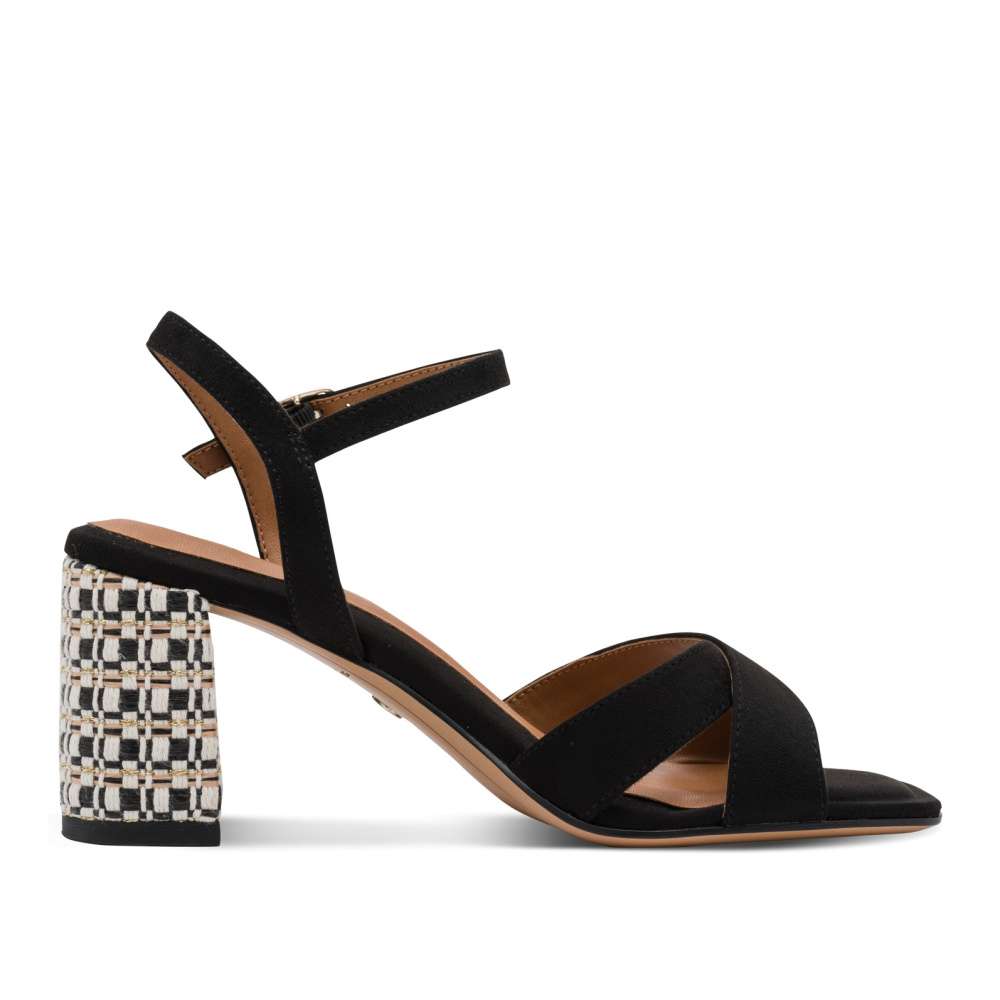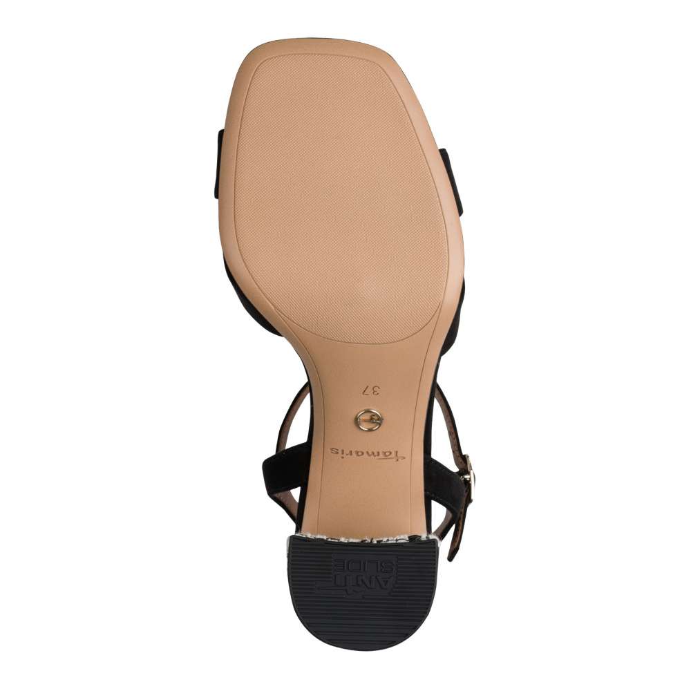 Objevte sandále, které nejsou jen obuví, ale skutečnou ozdobou vašich nohou. Působivě poskládané pásky černého svršku atraktivitu vzhledu. Pásek u kotníku je vybaven nastavitelnou sponou, takže si sandále dokonale přizpůsobíte svému chodidlu a jednoduše je nazujete. Uvnitř sandálů vás čeká příjemně měkká stélka, která zajišťuje komfort i při delším nošení. Vyšší a širší podpatek s protiskluzovou úpravou a jemným odpružením poskytuje stabilitu, ale zároveň dodává chůzi lehkost a elegantní ladnost. Navíc svým atraktivním provedením zvýrazní jedinečnost tohoto modelu. Sandále Tamaris kombinují módní styl a komfort, stanou se nezbytnou součástí vaší garderoby pro chvíle, kdy chcete zvýraznit svou jedinečnost.