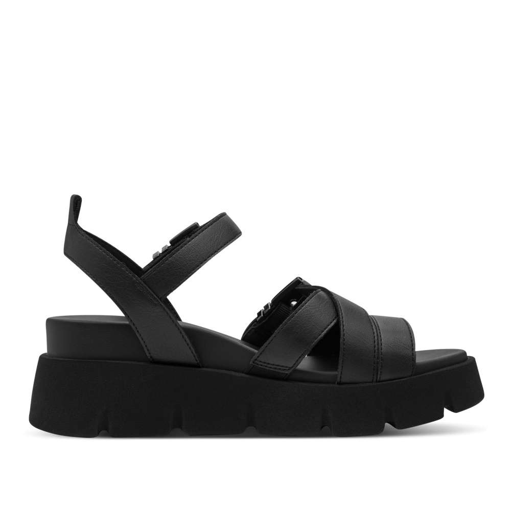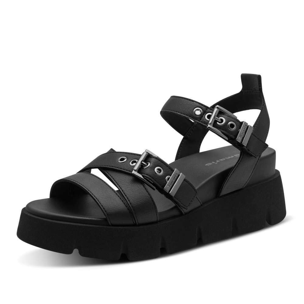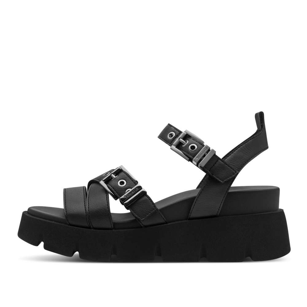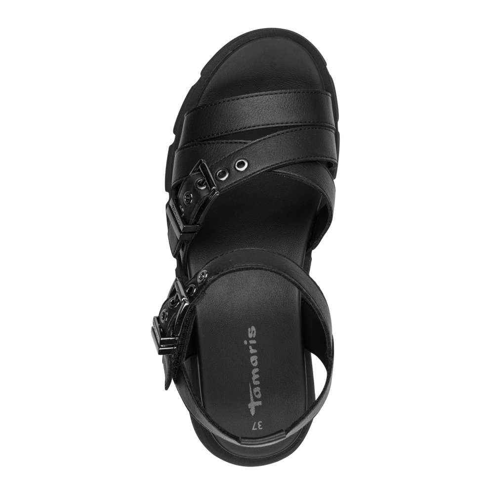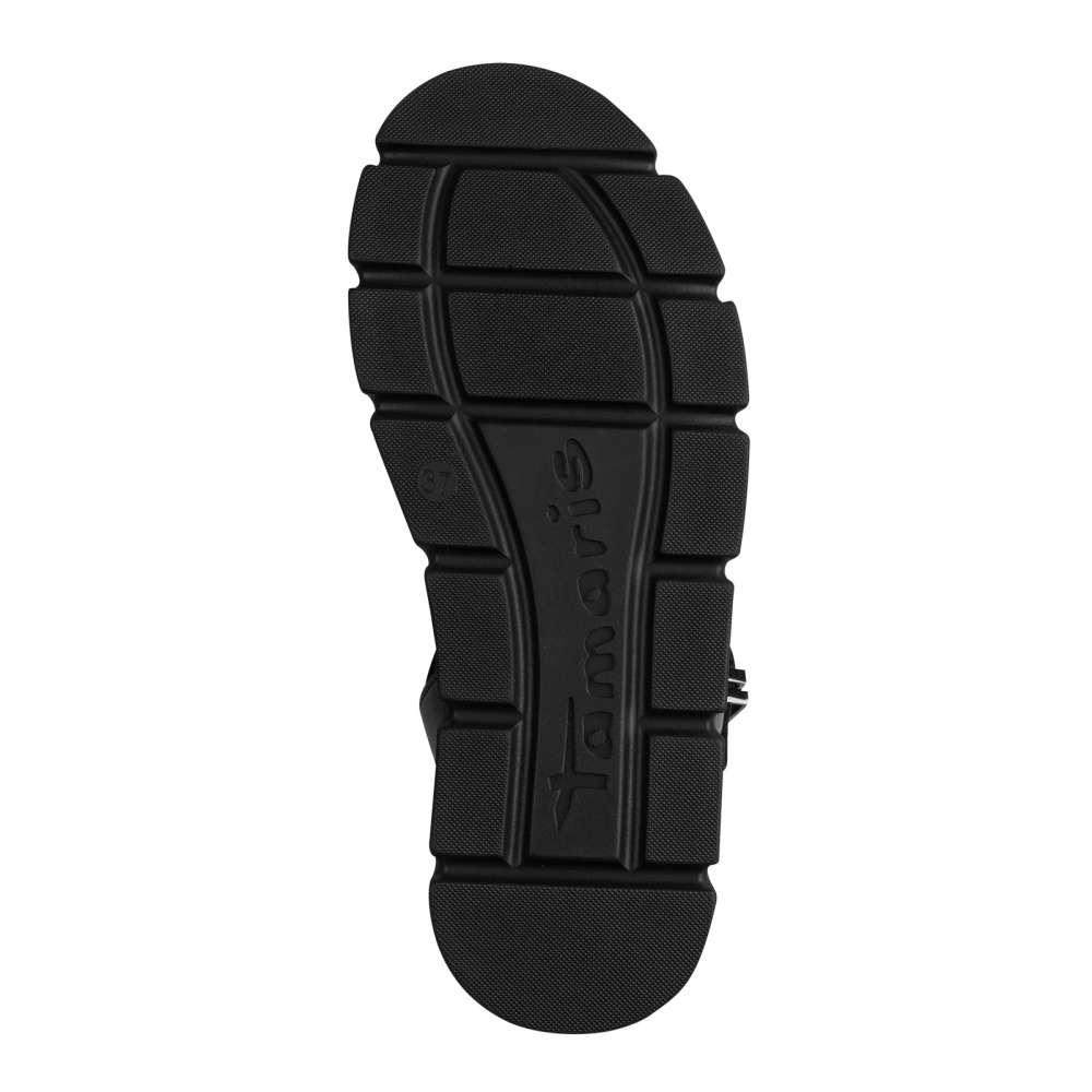 Tyto sandále značky Tamaris v klasickém černém odstínu kombinují nadčasový styl s moderním designem. Pásky svršku jsou efektně poskládané a zdobené dekorativními aplikacemi, které dodávají botám stylový vzhled. Navíc jsou pásky nastavitelné, aby se sandále dokonale přizpůsobily tvaru vaší nohy, a pásek u kotníku je vybaven praktickým suchým zipem pro jednoduché nazutí. Mohutná podešev zajišťuje stabilitu a jistotu každého kroku, zatímco příjemná stélka poskytuje maximální pohodlí i při delším nošení. Tyto sandále jsou ideální kombinací stylu, komfortu a praktičnosti, díky čemuž se stanou skvělým doplňkem pro každodenní nošení i speciální příležitosti.