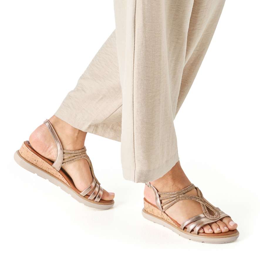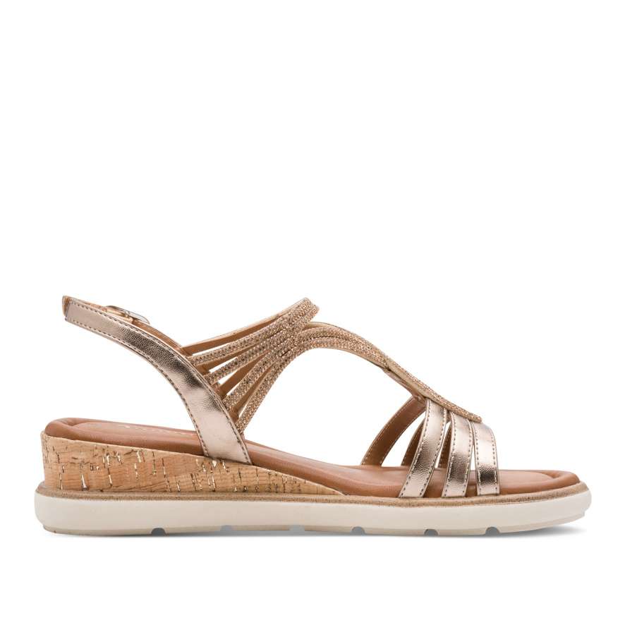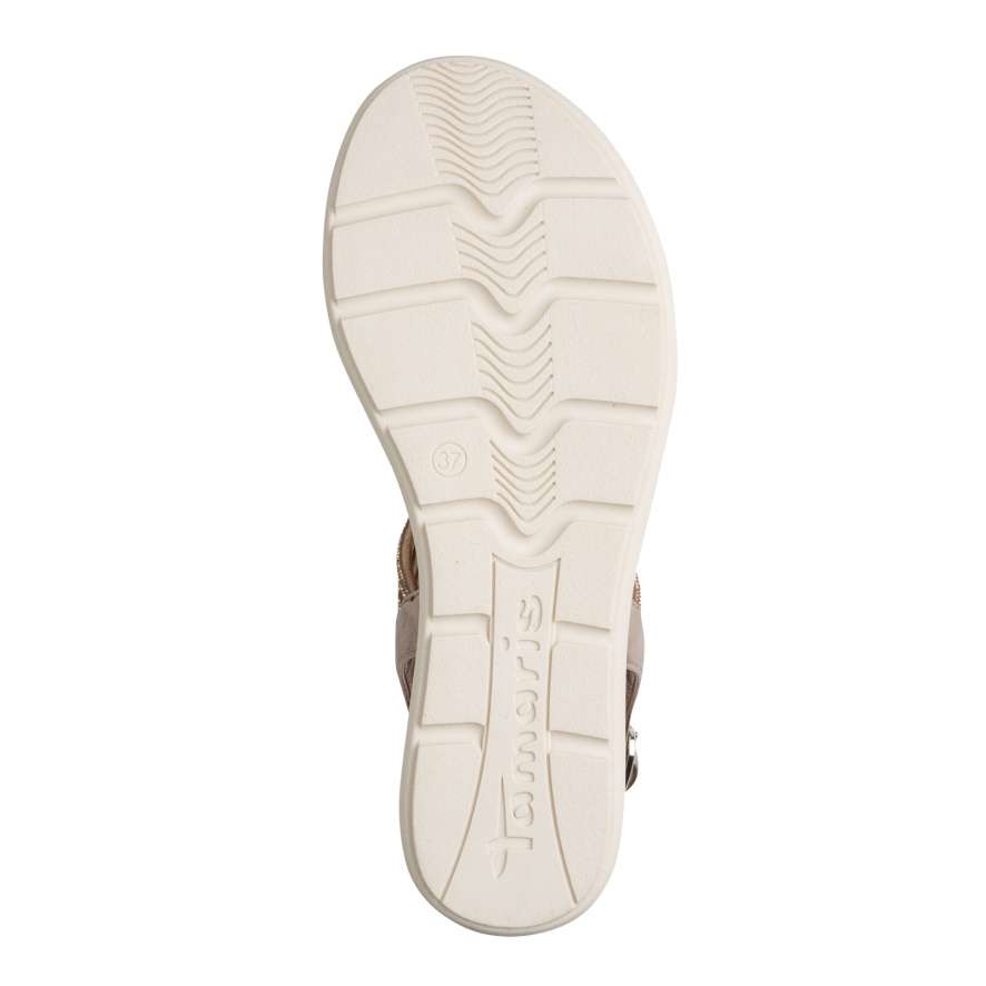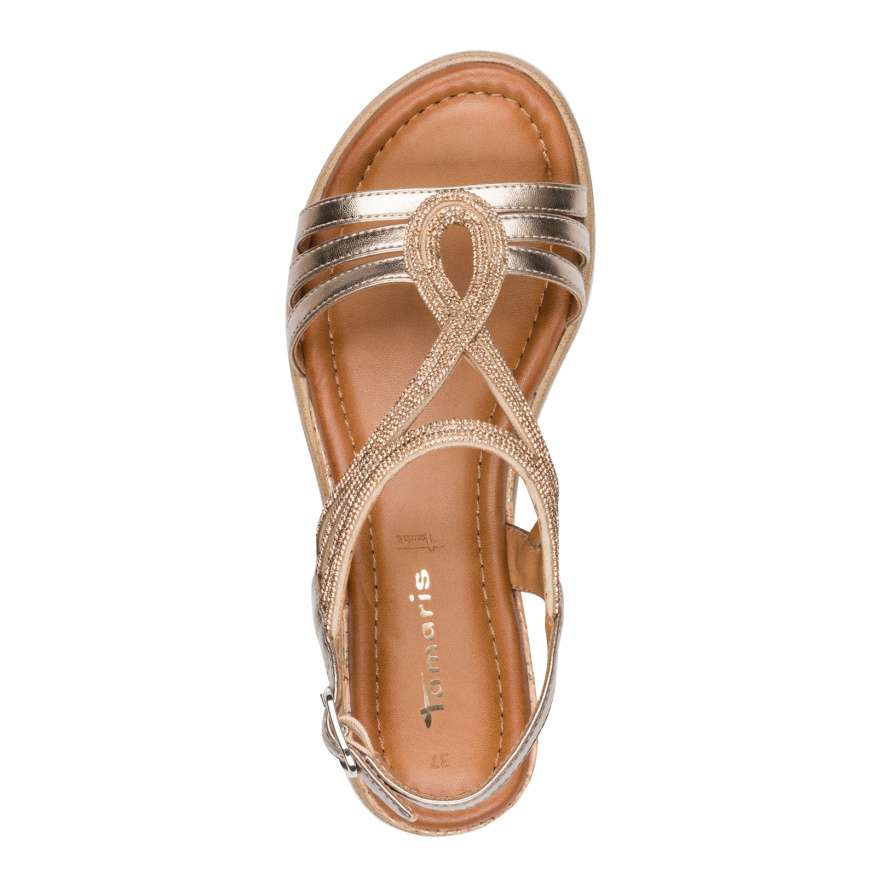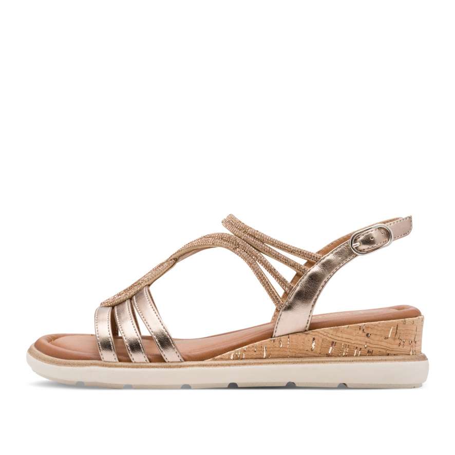 Sandále Tamaris ozdobí vaše nohy jako šperk a dodají vašemu kroku nádech elegance. Precizně poskládané pásky s působivými odlesky a drobnými třpytivými kamínky vytvářejí okouzlující vzhled, který upoutá pozornost při každém kroku. Zadní pásek s nastavitelnou sponou umožňuje snadné obutí a perfektní přizpůsobení noze, takže se můžete cítit jistě a pohodlně po celý den. Měkká stélka vás bude hýčkat při každém došlapu a vyšší klínový podpatek dodá vaší postavě ladnost, zároveň poskytne potřebnou oporu a stabilitu. Tyto sandále Tamaris jsou ideální volbou pro chvíle, kdy chcete zazářit, cítit se výjimečně a zároveň si dopřát pohodlí bez kompromisů.