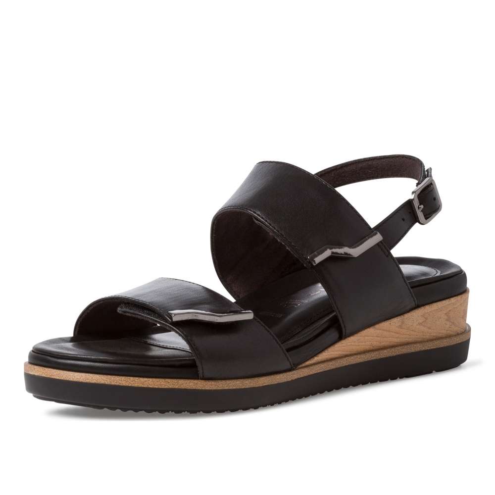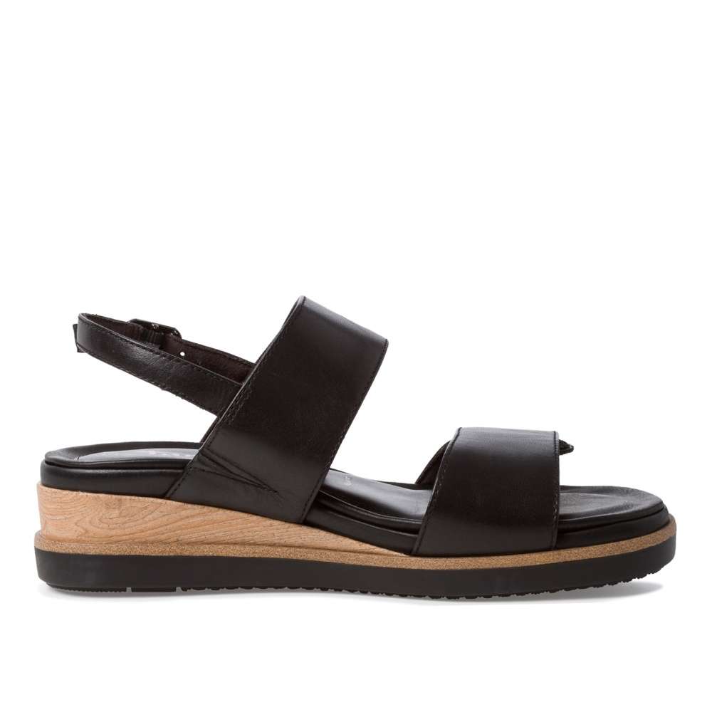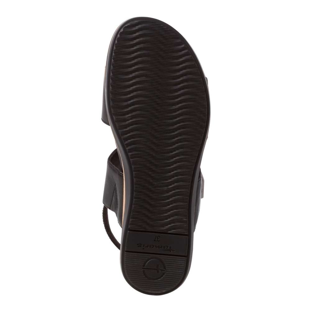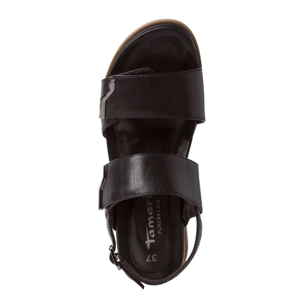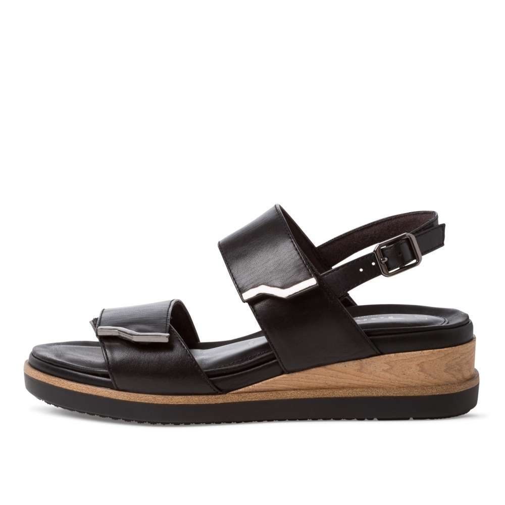 Tento model sandálků v černé či bílé barvě značky Tamaris si zamilujete na první pohled. Kožený svršek je tvořen dvěma pásky přes prsty a nárt, které zaručí, že v nich bude noha pevně držet. Ty jsou variabilní pomocí suchých zipů, a jejich konce jsou zdobeny kovovými detaily. Zapínání obuvi se nachází na pásku okolo kotníku, a je tvořeno malou přezkou. Kvalitní podešev na vyšším klínku je zdobena částí s dekorem dřeva. Sandály jsou vhodné k nošení s šaty, sukní, i elegantními kalhoty.