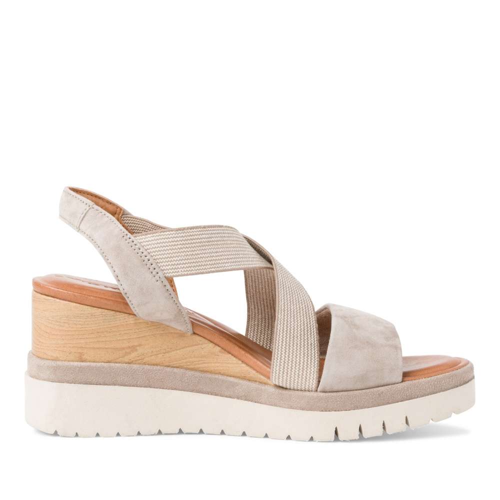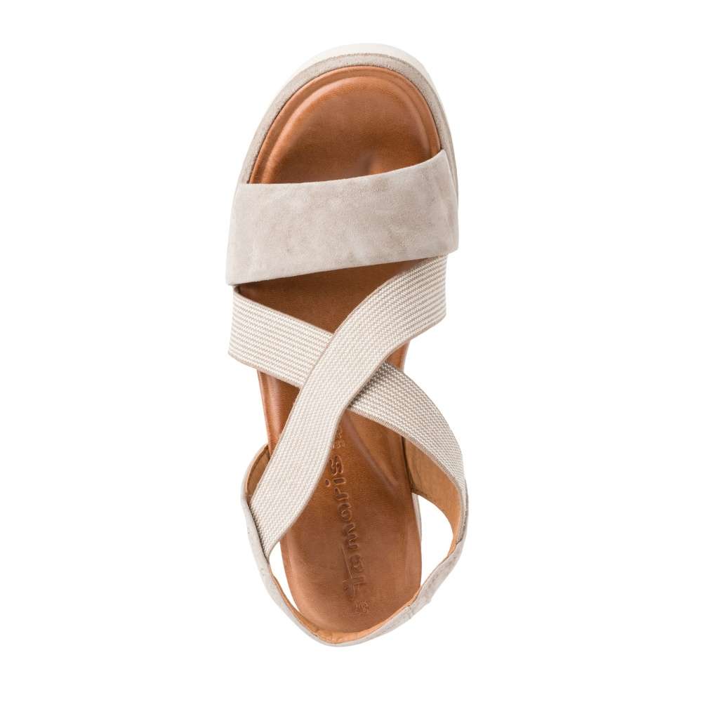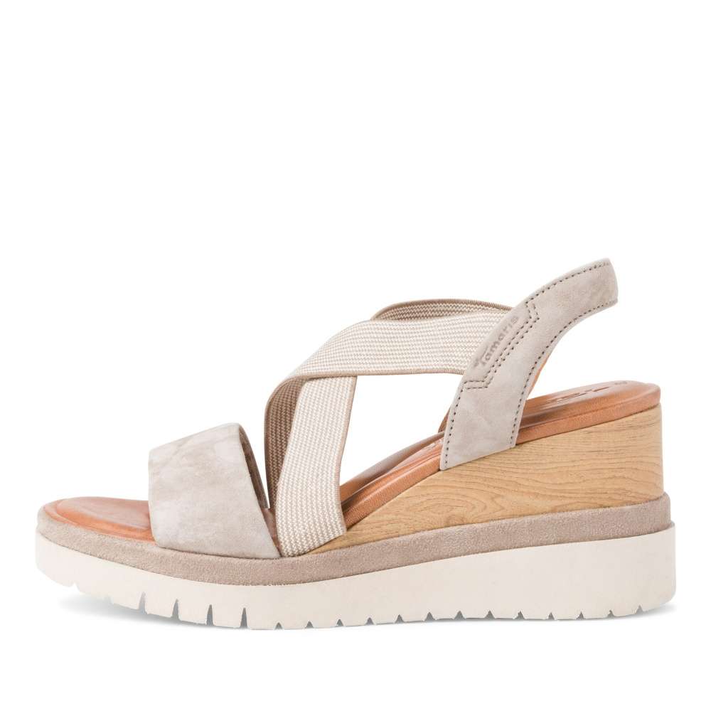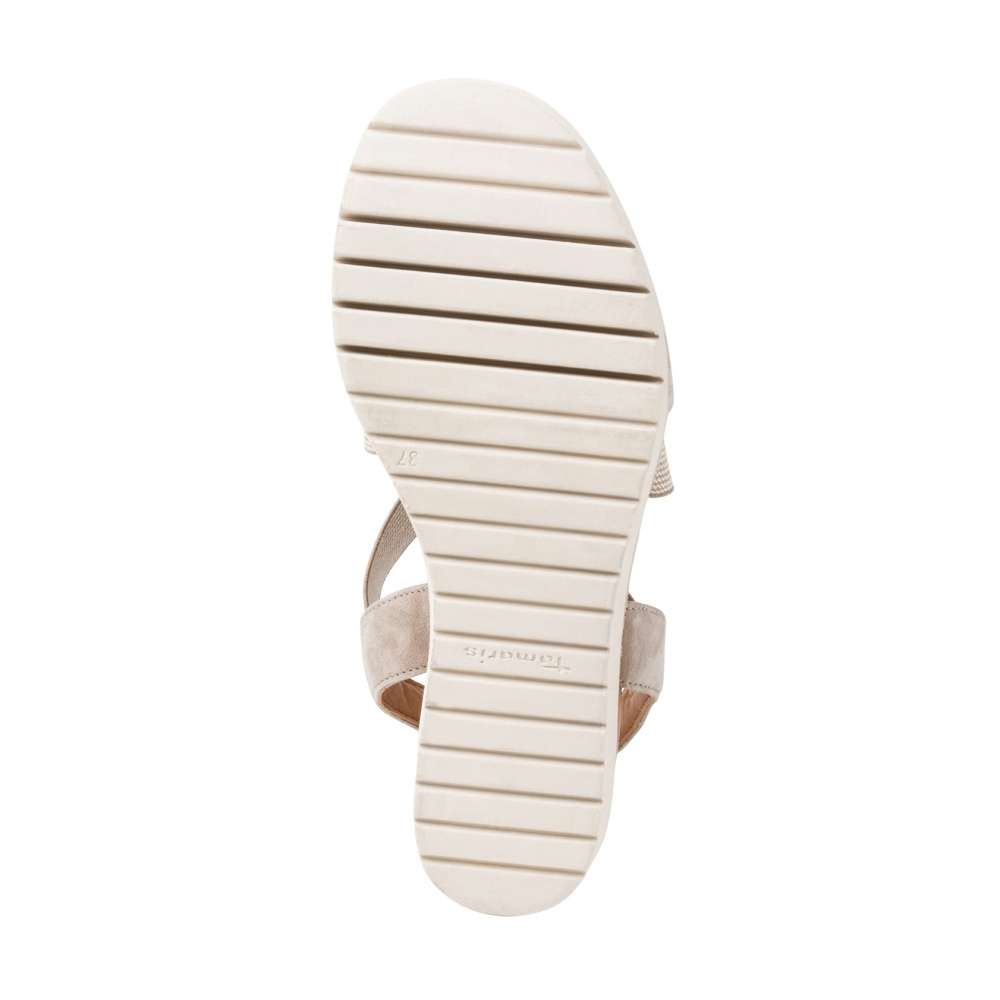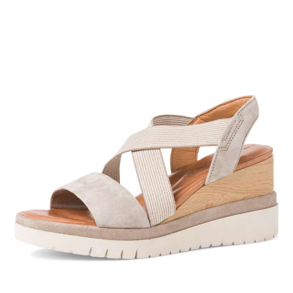 Tyto moderní sandály na klínku značky Tamaris Vás zaujmou na první pohled svým vzhledem, dokonale hodícím se do horkého léta. Díky své neutrální barvě a koženému svršku je dokážete snadno sladit ke každému outfitu. Pásky přes prsty a kolem paty udrží obuv na noze pohodlně nazutou. Gumičky okolo nártu usnadní jejich nazutí. Módní hrubá podešev je doplněna o vysoký klínek, který je dekorován motivem dřeva. Měkká stélka vyrobena z kůže je doplněna o speciální technologii Touch-it, která při chůzi zajišťuje optimální pohodlí. Technologie: Stélka Touch-it – měkká stélka, která se dokonale přizpůsobí tvaru nohy, a díky tomu při nošení zajišťuje optimální pohodlí