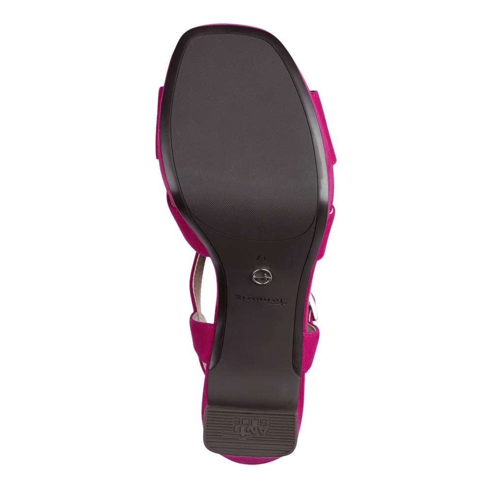 Tyto jedinečné růžové sandálky značky Tamaris budou výrazným doplňkem v botníku každé z nás. Kožený hladký svršek zvládne spolehlivě doplnit každý outfit k dokonalosti. Jednoduché zapínání kolem kotníku zajistí, že budou boty na noze perfektně držet a pohodlí při chůzi zajistí měkká stélka vyrobená z paměťové pěny. Eleganci chůzi dodá vyšší podpatek s protiskluzovým prvkem, který oceníte při nejedné protancované noci.