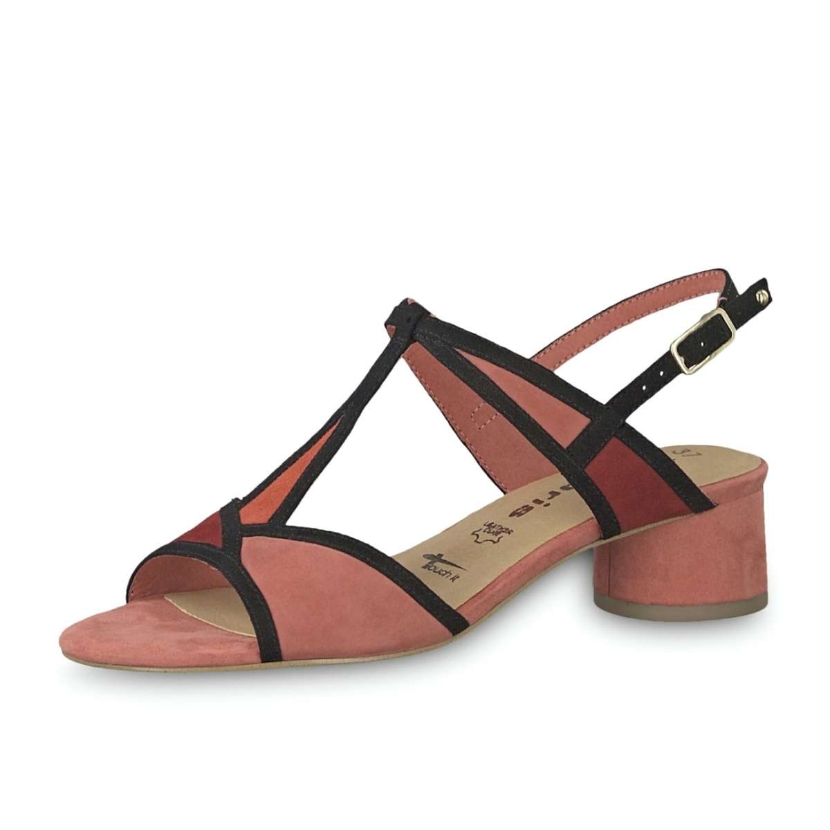 Dámské sandály jsou zdobené prolínajícími se odstíny červené barvy lemované černou. Mají semišový vzhled a kulatou špičku. Pásek kolem nártu je na vnitřní straně doplněn o pružnou gumičku pro snadné obutí a přizpůsobení přímo k Vaší noze. Pásek kolem paty má pak zapínání přezkou s pružnou gumičkou. Tento model vynikne se sukní i s kalhotami.