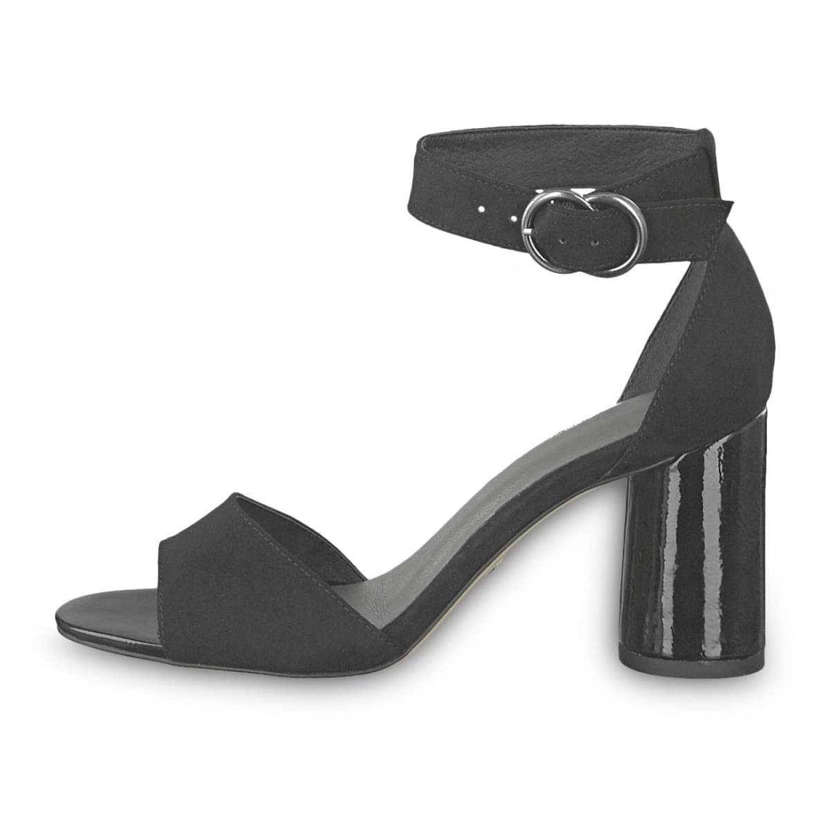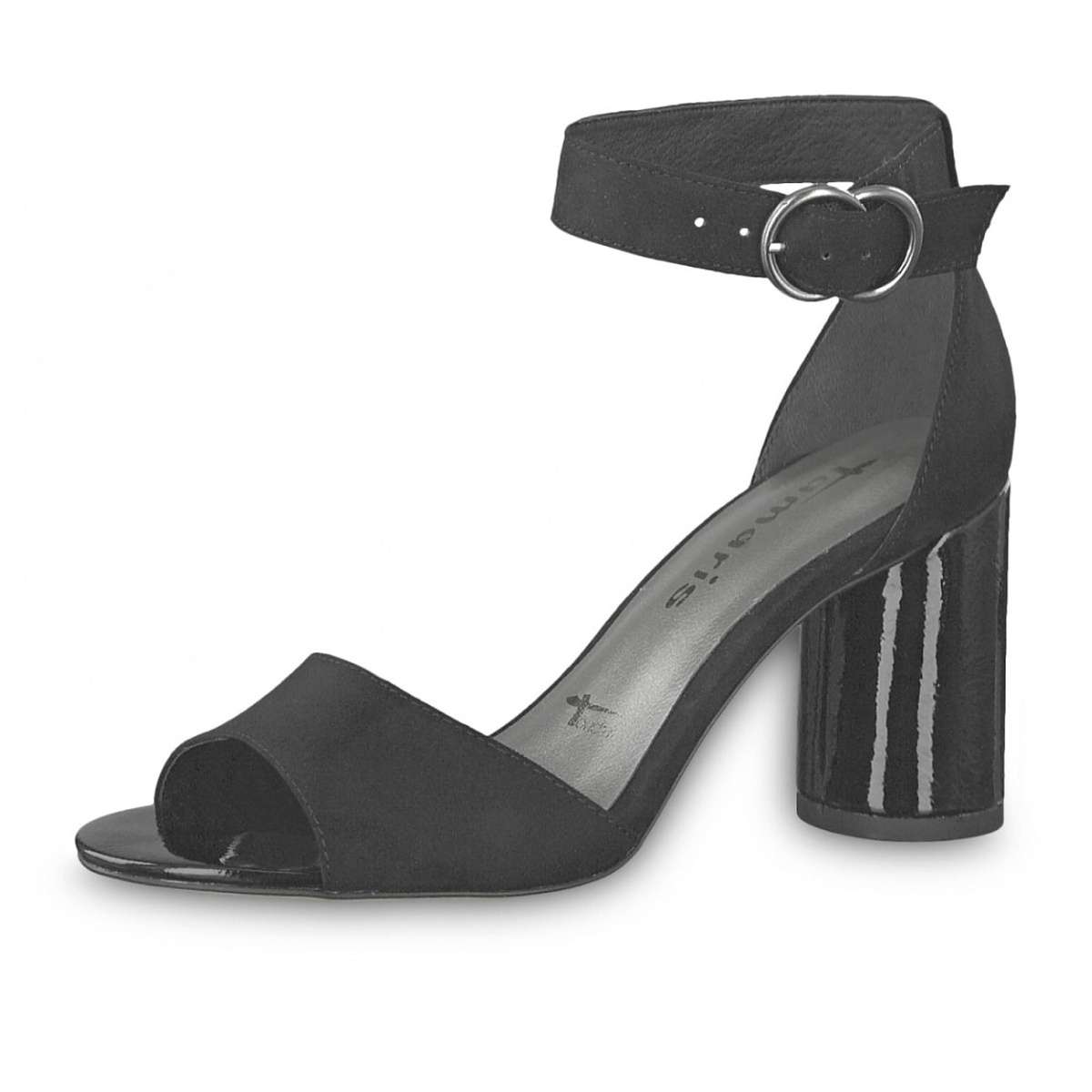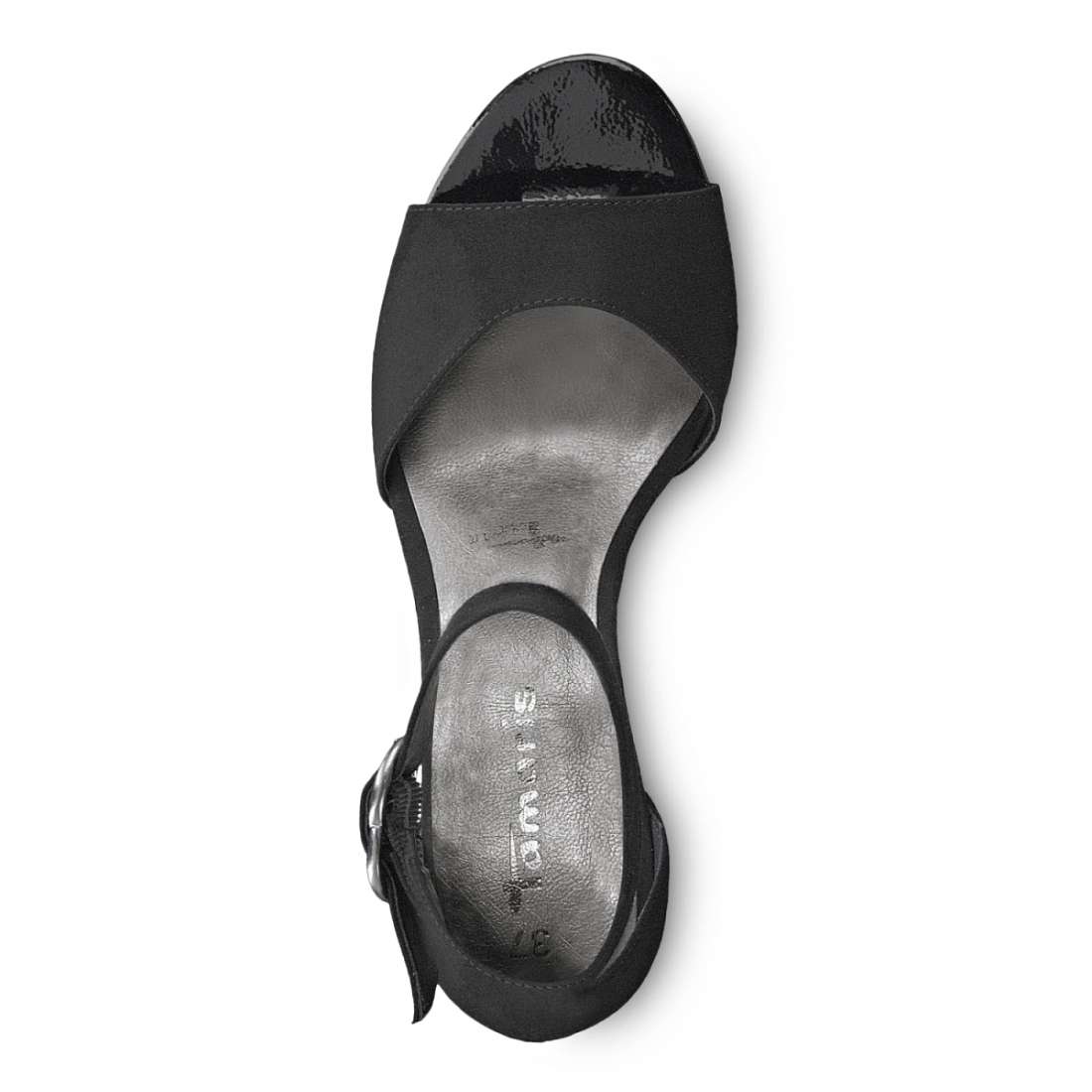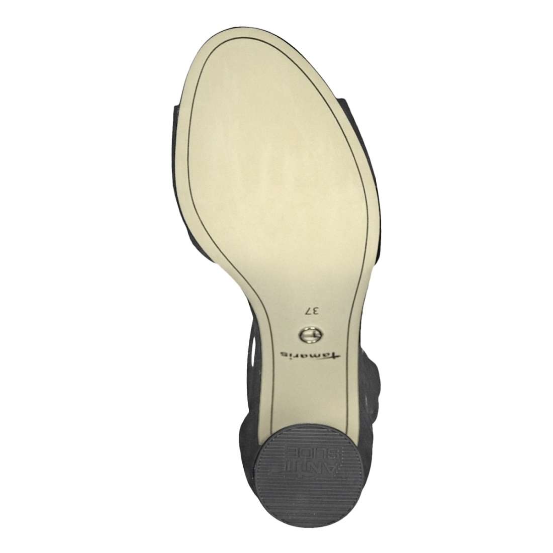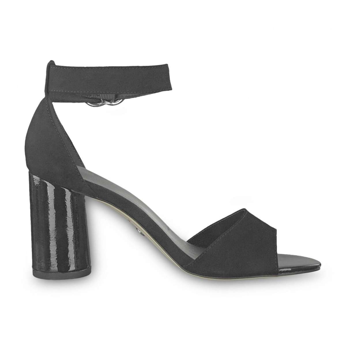 Dámské sandály černé barvy mají semišový vzhled a kulatou špičku. Obuv má otevřenou špičku a plnou patu, zapínatelná je přezkou na pásku kolem nártu. Lodičky jsou vhodné na různé společenské akce jako například ples či oslavy.
