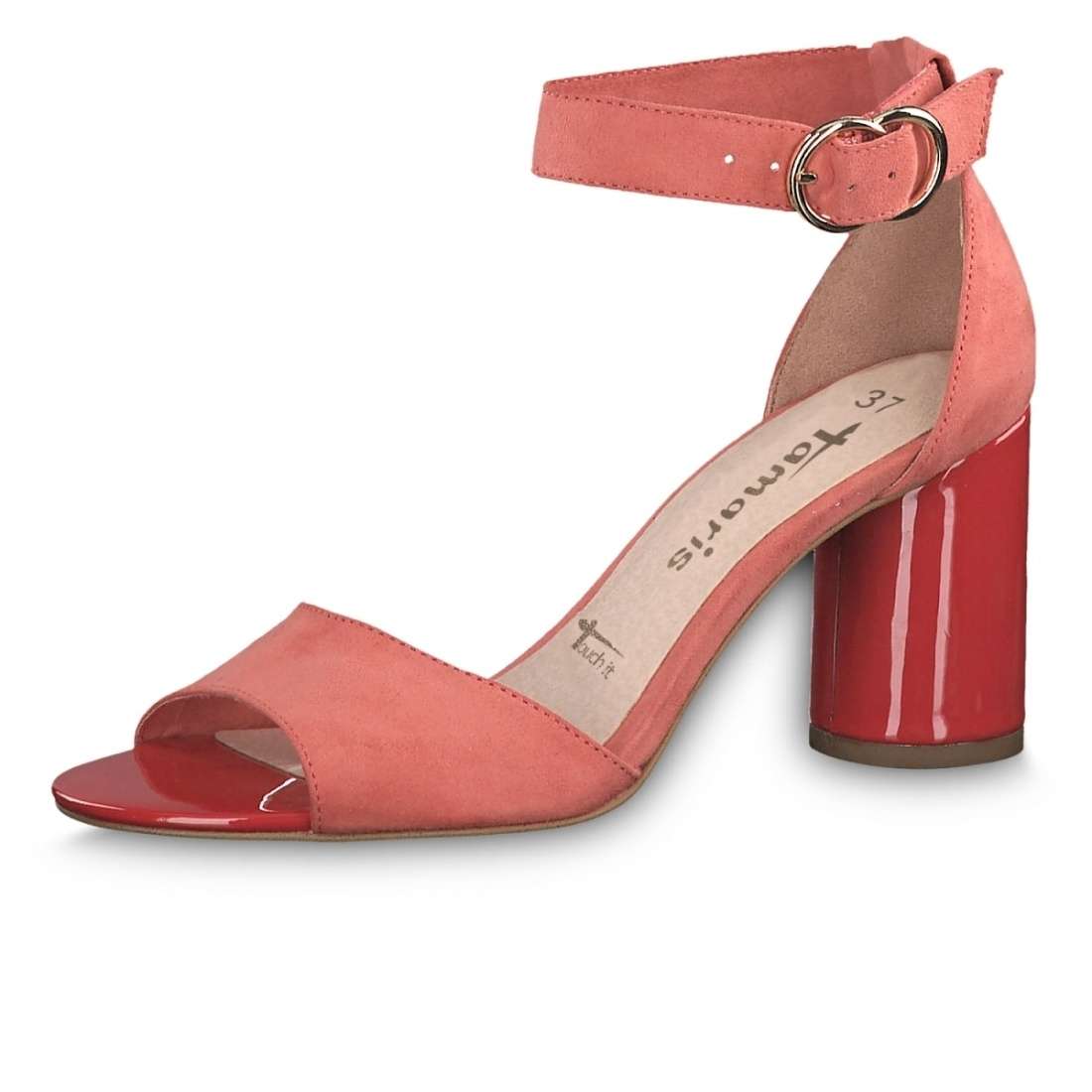 Dámské lodičky červené barvy mají semišový vzhled a kulatou špičku. Obuv má otevřenou špičku a plnou patu, zapínatelná je přezkou na pásku kolem nártu. Lodičky jsou vhodné na různé společenské akce jako například ples či oslavy.