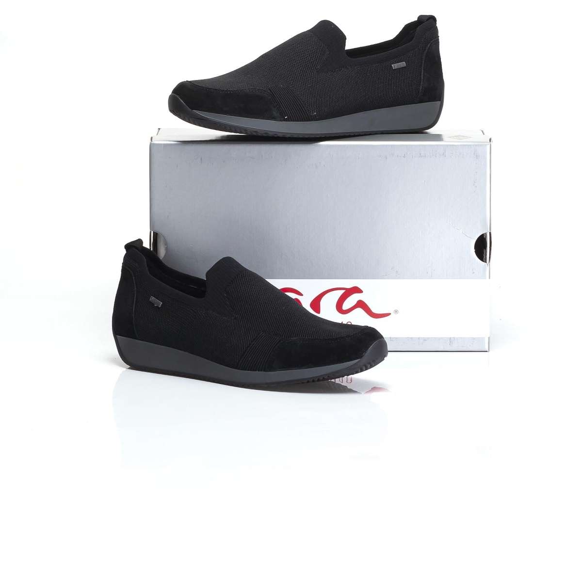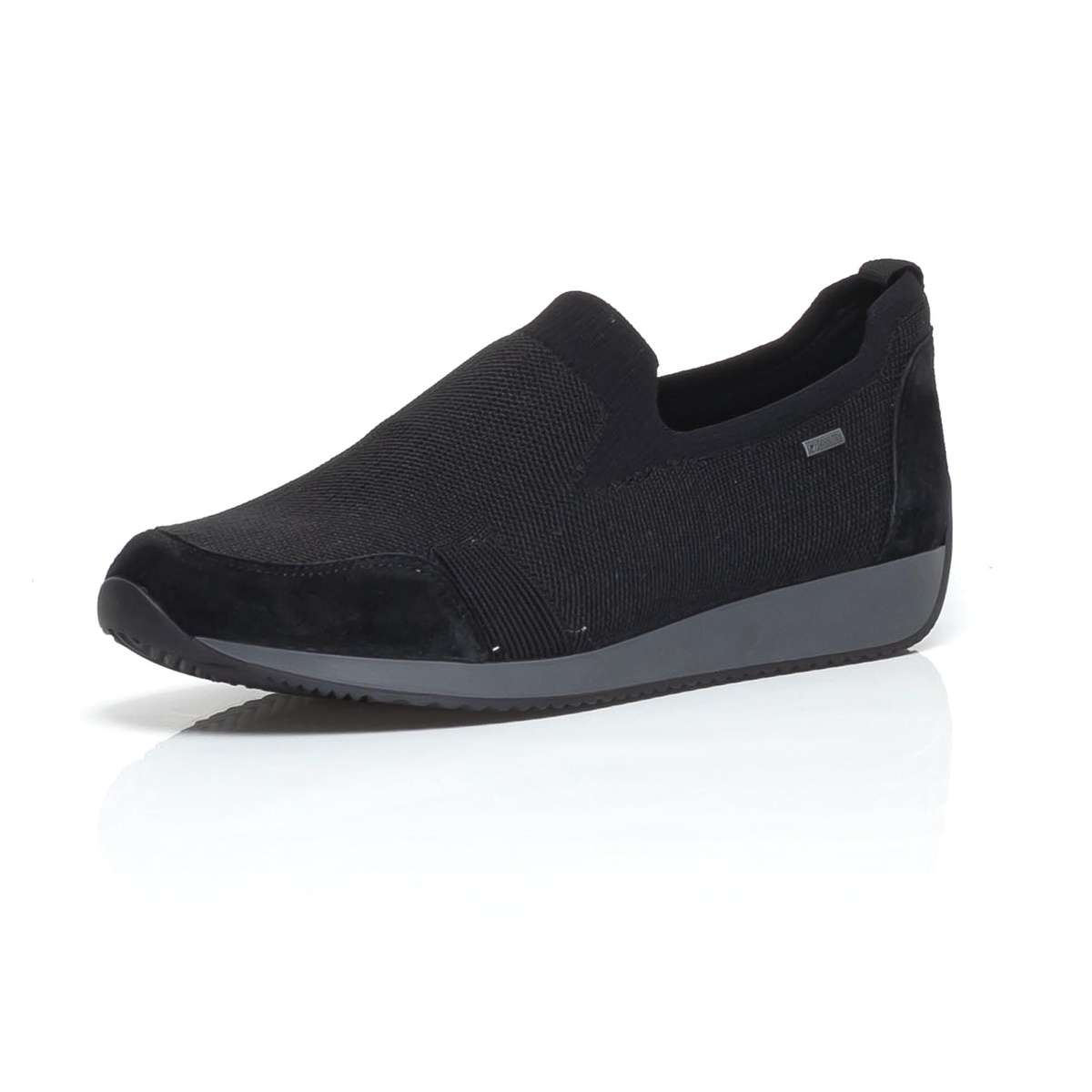 Sportovní teniska pro dámy v černé barvě značky ARA. Svršek je v kombinaci kůže a kvalitního neprodyšného textilu. Podšívka je textilní včetně stélky, která je vyjímatelná a tvarovaná. Tato bota má šířku -G a odpovídá normalizované normální šířce. Lehká podešev, která má v nejvyšším místě pod patou 2 cm, Vám zajistí pohodlnou chůzi díky protiskluzové gumové podrážce po celý den. Pružný materiál umožňuje optimální přizpůsobení boty k chodidlu. Díky membráně ORIGINAL GoreTex je tato bota 100% vodotěsná, větru odolná a prodyšná.