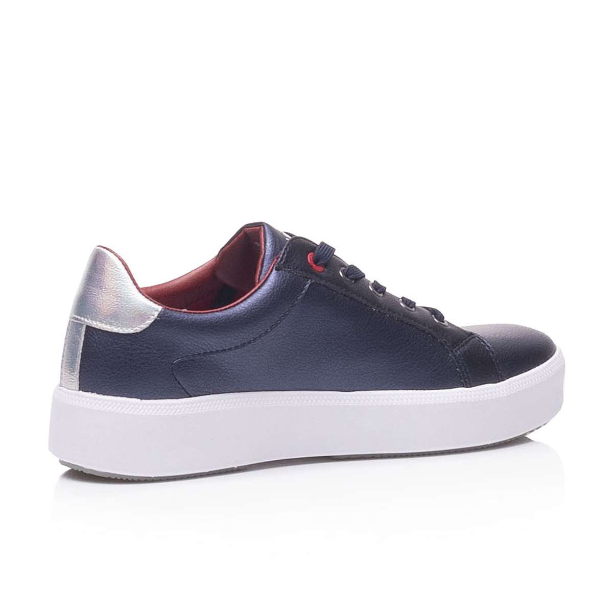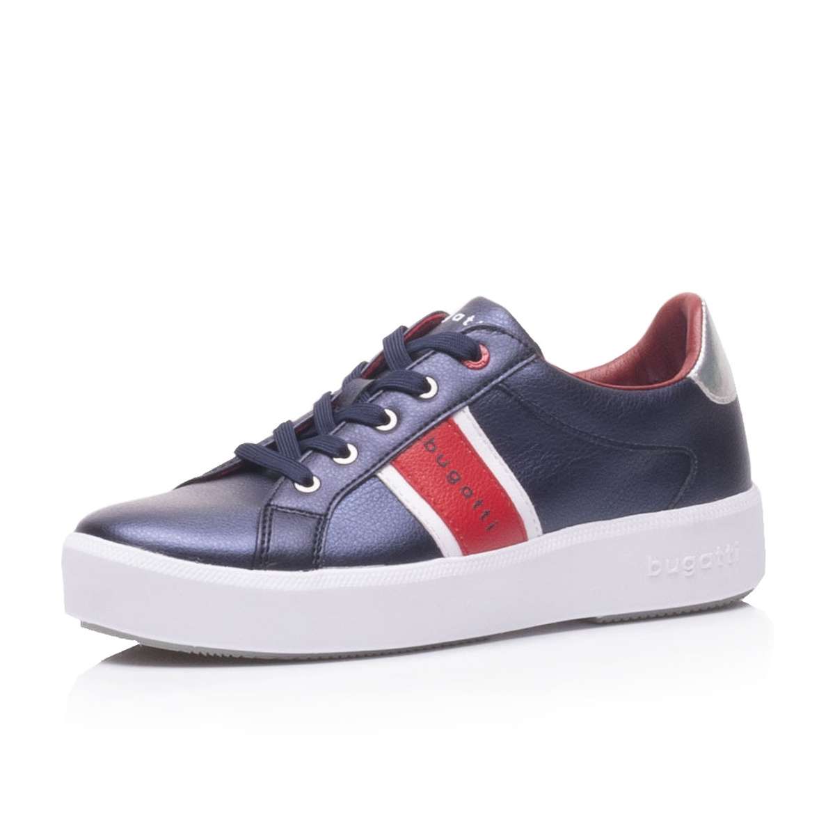 Tyto designové tenisky značky Bugatti zaručeně okouzlí Vás i Vaše okolí. Svršek je na straně ozdoben červeným pruhem s nápisem a na patě stříbrnou částí. Šněrováním si obuv nastavíte dle svých požadavků. Tento model je velmi pohodlný a dobře kombinovatelný s jakýmkoliv outfitem.