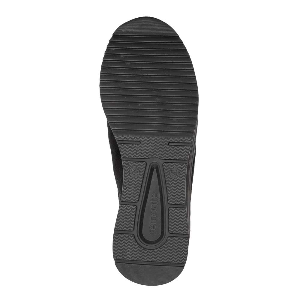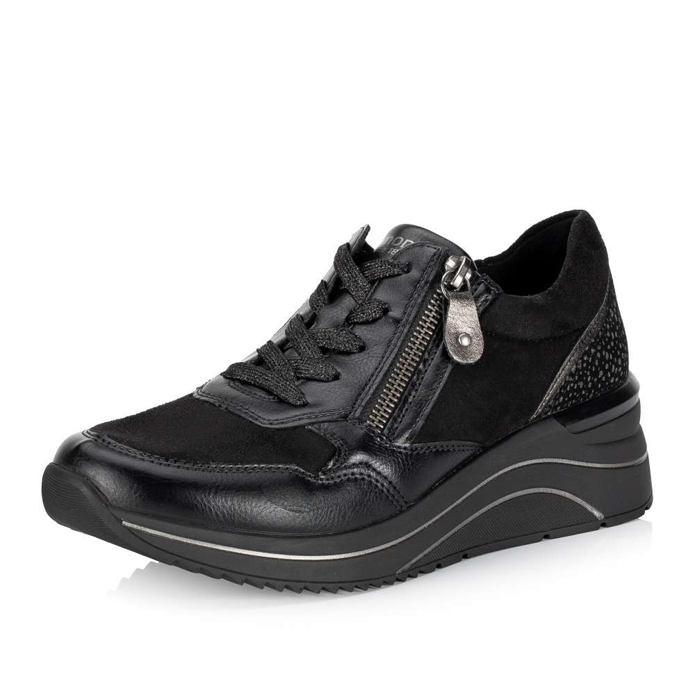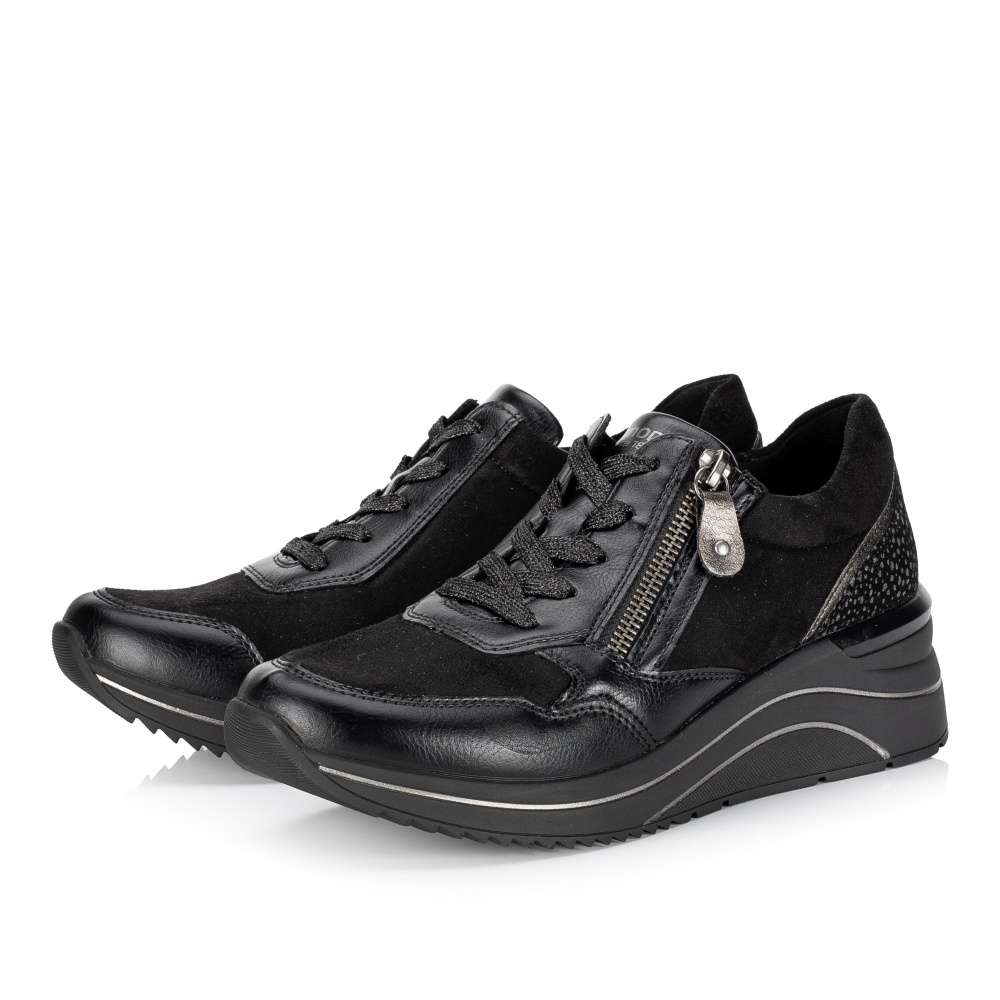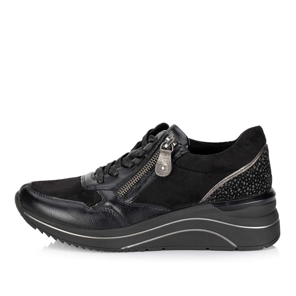 Obuv REMONTE je vyšší řadou značky RIEKER, obuv se vyznačuje kvalitou použitých materiálů. Super stylové, super in! To jsou tyto tenisky REMONTE, které jsou vyšší řadou značky RIEKER a vyznačují se kvalitou použitých materiálů. Černý svršek je v oblasti paty doplněn metalickými tečkami a lemováním, které utvářejí dokonalý vzhled této obuvi. Snadné nazouvání Vám zajistí funkční zip spolu se šněrováním a díky speciální podrážce je bota super lehká. Teď už je jen na Vás kam si tento originální kousek obujete.