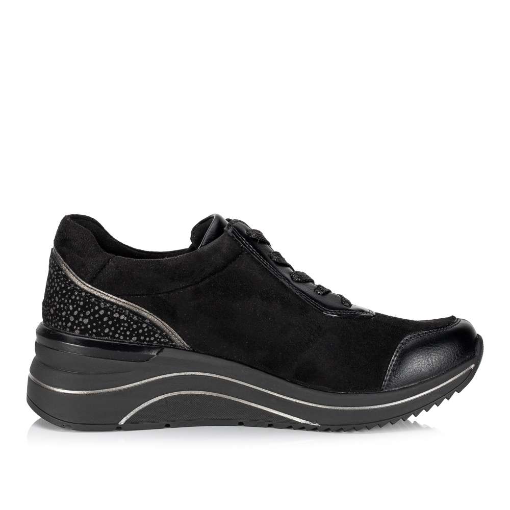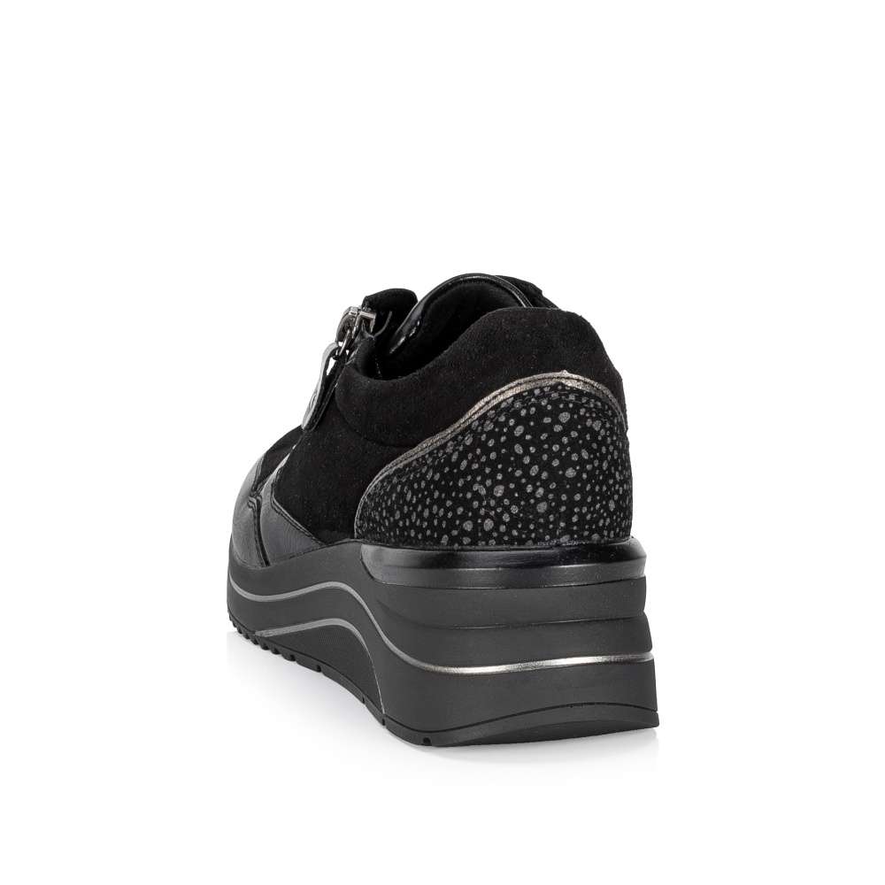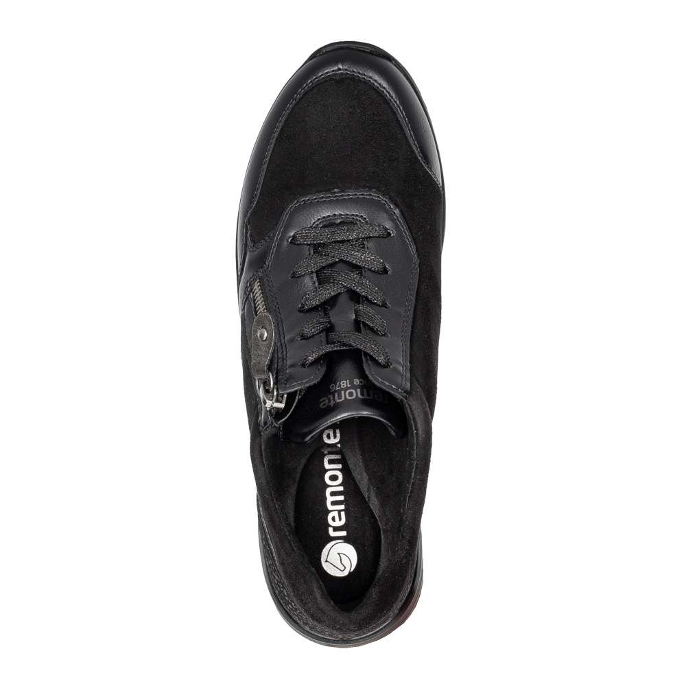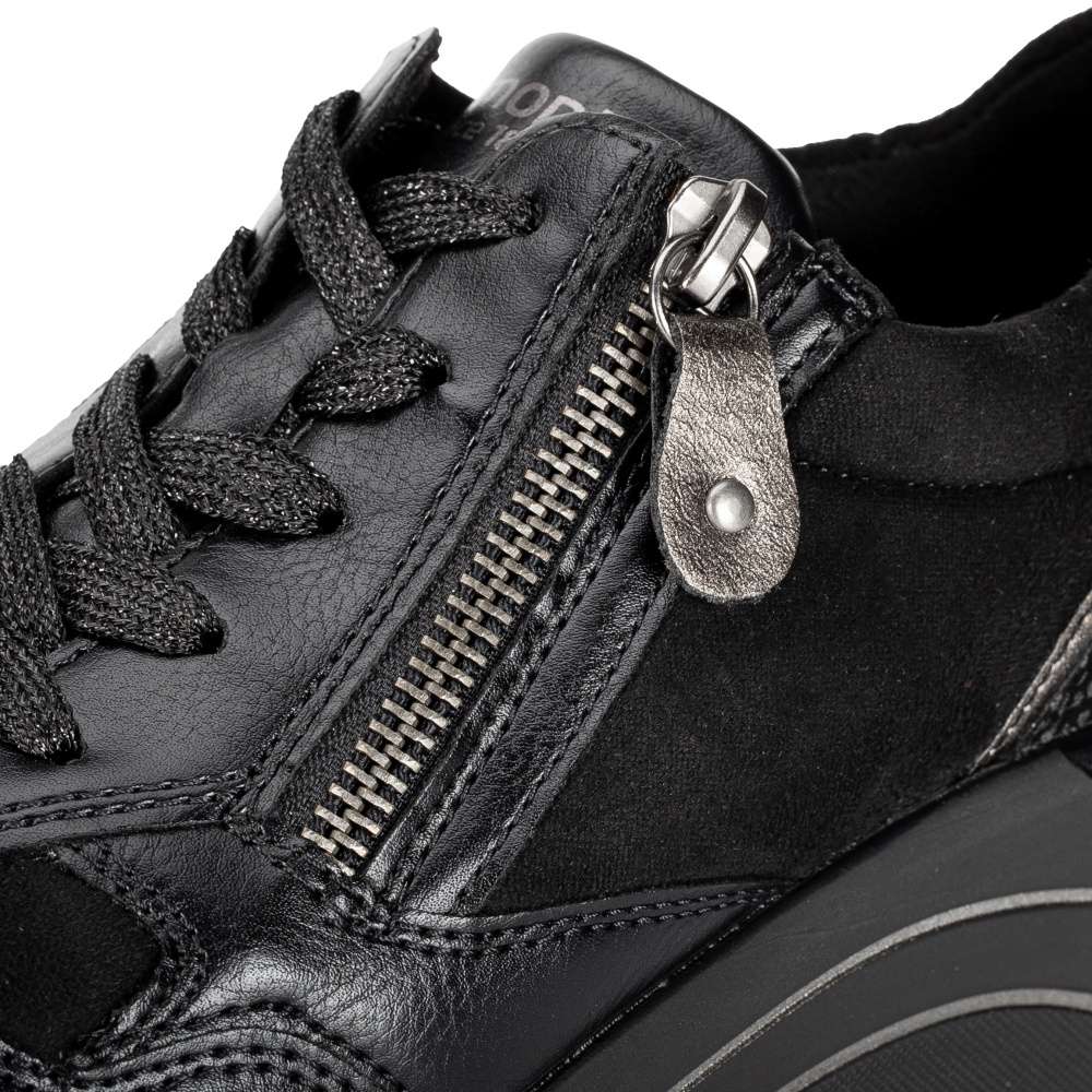 Obuv REMONTE je vyšší řadou značky RIEKER, obuv se vyznačuje kvalitou použitých materiálů. Super stylové, super in! To jsou tyto tenisky REMONTE, které jsou vyšší řadou značky RIEKER a vyznačují se kvalitou použitých materiálů. Černý svršek je v oblasti paty doplněn metalickými tečkami a lemováním, které utvářejí dokonalý vzhled této obuvi. Snadné nazouvání Vám zajistí funkční zip spolu se šněrováním a díky speciální podrážce je bota super lehká. Teď už je jen na Vás kam si tento originální kousek obujete.
