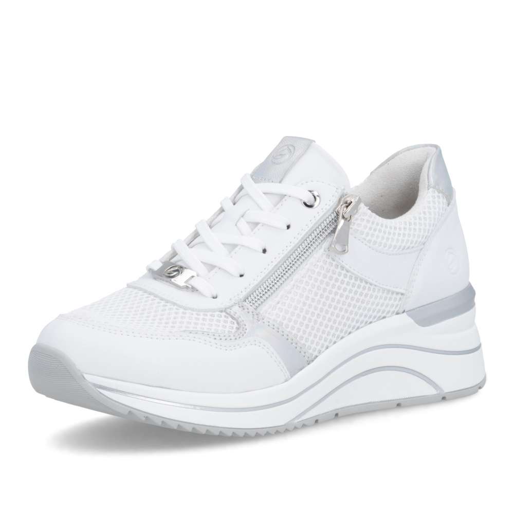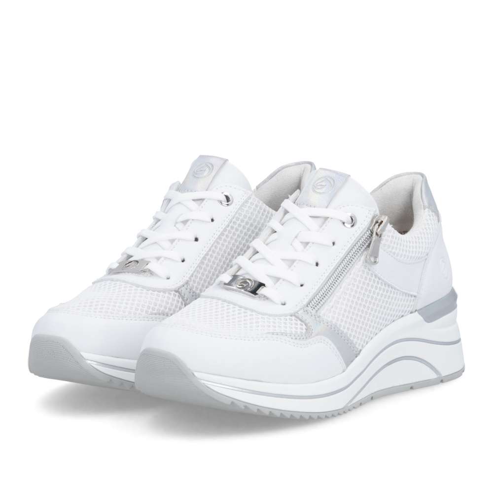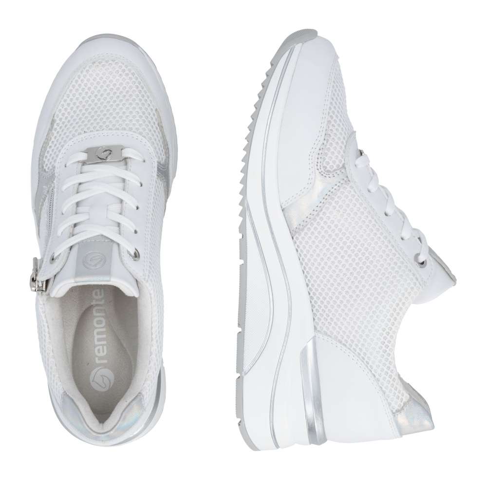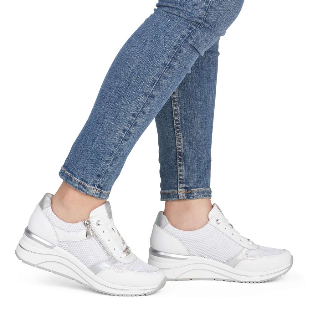 Obuv REMONTE představuje prémiovou řadu značky RIEKER, která se vyznačuje vysokou kvalitou použitých materiálů a precizním zpracováním. Tyto tenisky jsou ideální volbou pro moderní ženy, které milují kombinaci komfortu a trendového designu. Jejich svršek je vytvořen z kombinace kvalitních materiálů s různými texturami, včetně jemného lesku a vizuálně atraktivních detailů, což vytváří zajímavou hloubku. Praktičnost je u těchto tenisek stejně důležitá jako jejich styl. Šněrování a zip na nártu umožňují snadné a rychlé nazutí, přesné přizpůsobení boty tvaru nohy a pohodlné uchycení. Vyjímatelná stélka je měkká, tvarovaná a přizpůsobí se chodidlu, čímž poskytuje maximální pohodlí. Podešev je vyšší a poskytuje stabilitu při chůzi, její originální zpracování a vizuální detaily zároveň doplňují celkový design tenisek. Tyto tenisky jsou navrženy pro ženy, které nechtějí dělat kompromisy mezi komfortem a módním vzhledem, budou ideálním doplňkem pro každodenní nošení, procházky, cestování či volný čas, přičemž zachovává stylový vzhled a vizuální atraktivitu při každé příležitosti.