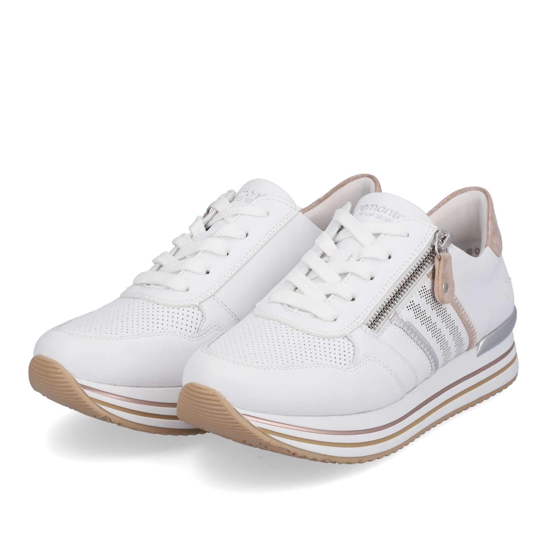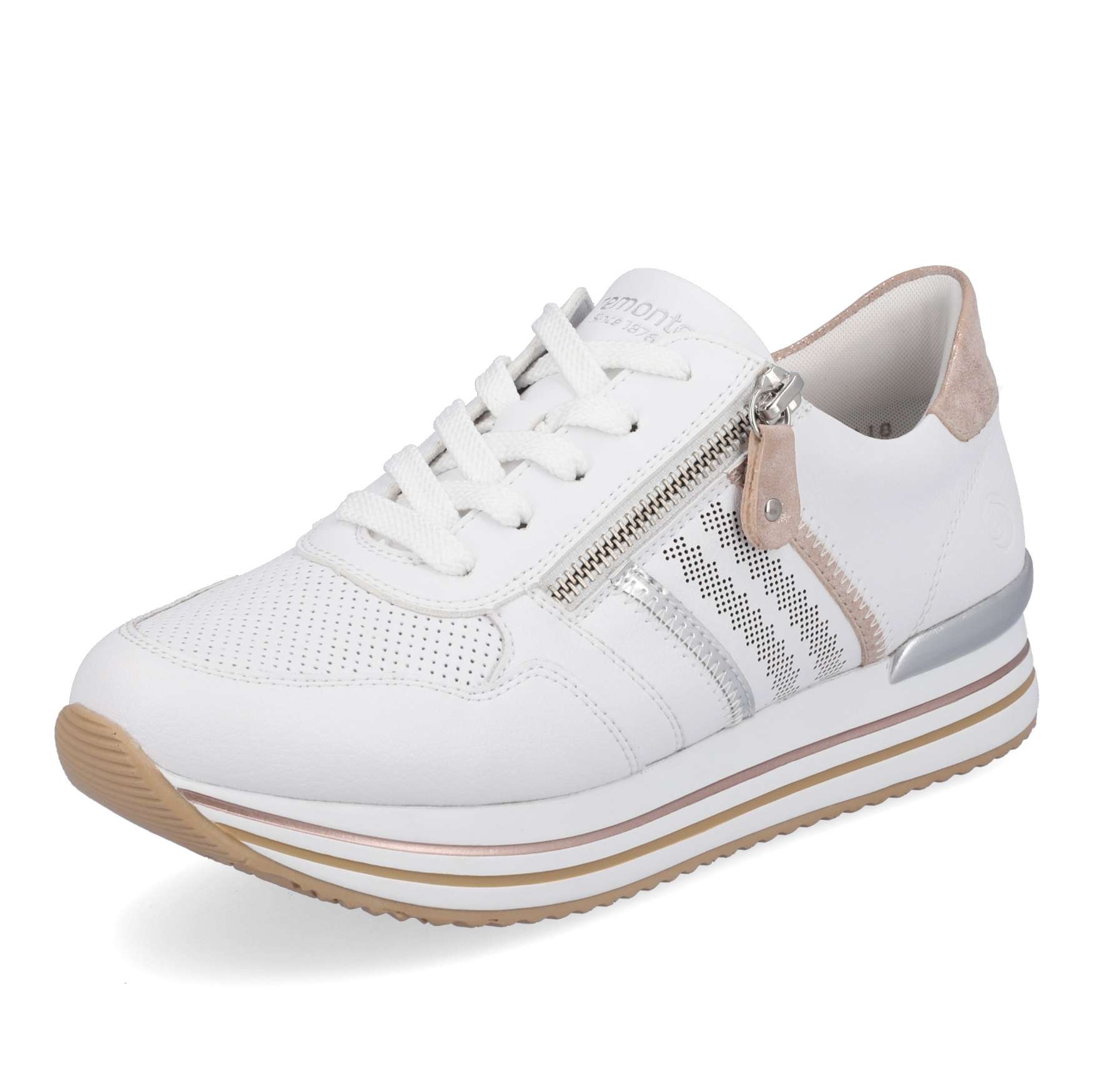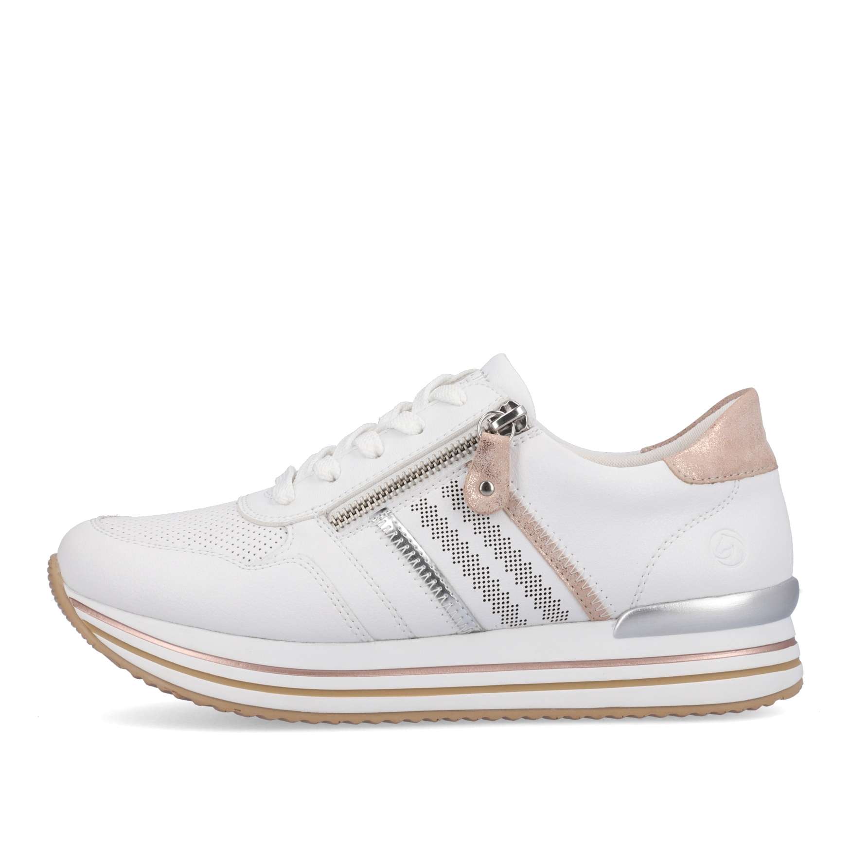 Detailní informace Obuv REMONTE je vyšší řadou značky RIEKER, obuv se vyznačuje kvalitou použitých materiálů. Tato dámská teniska Vás zaujme na první pohled svým svrškem bílé barvy s metalickými prvky a jemnou perforací z vnější strany. Díky šněrování a funkčnímu zipu na nártu se boty snadno obouvají a přizpůsobí se Vašemu chodidlu. Pro Vaše pohodlí na každém kroku je zde měkká stélka, která je zároveň i vyjímatelná. Tato obuv bude dobře vypadat s jakýmkoli oblečením z Vašeho šatníku.