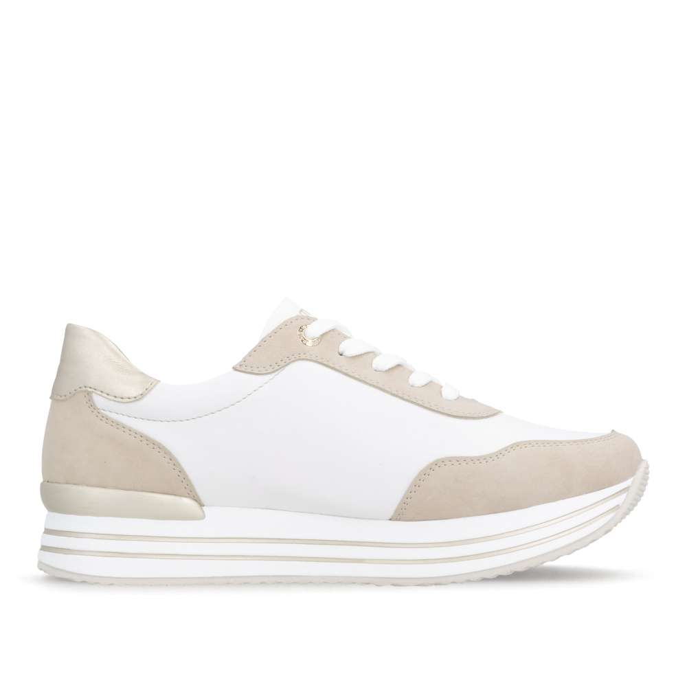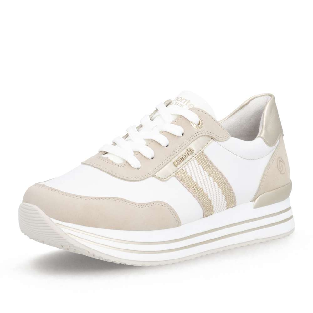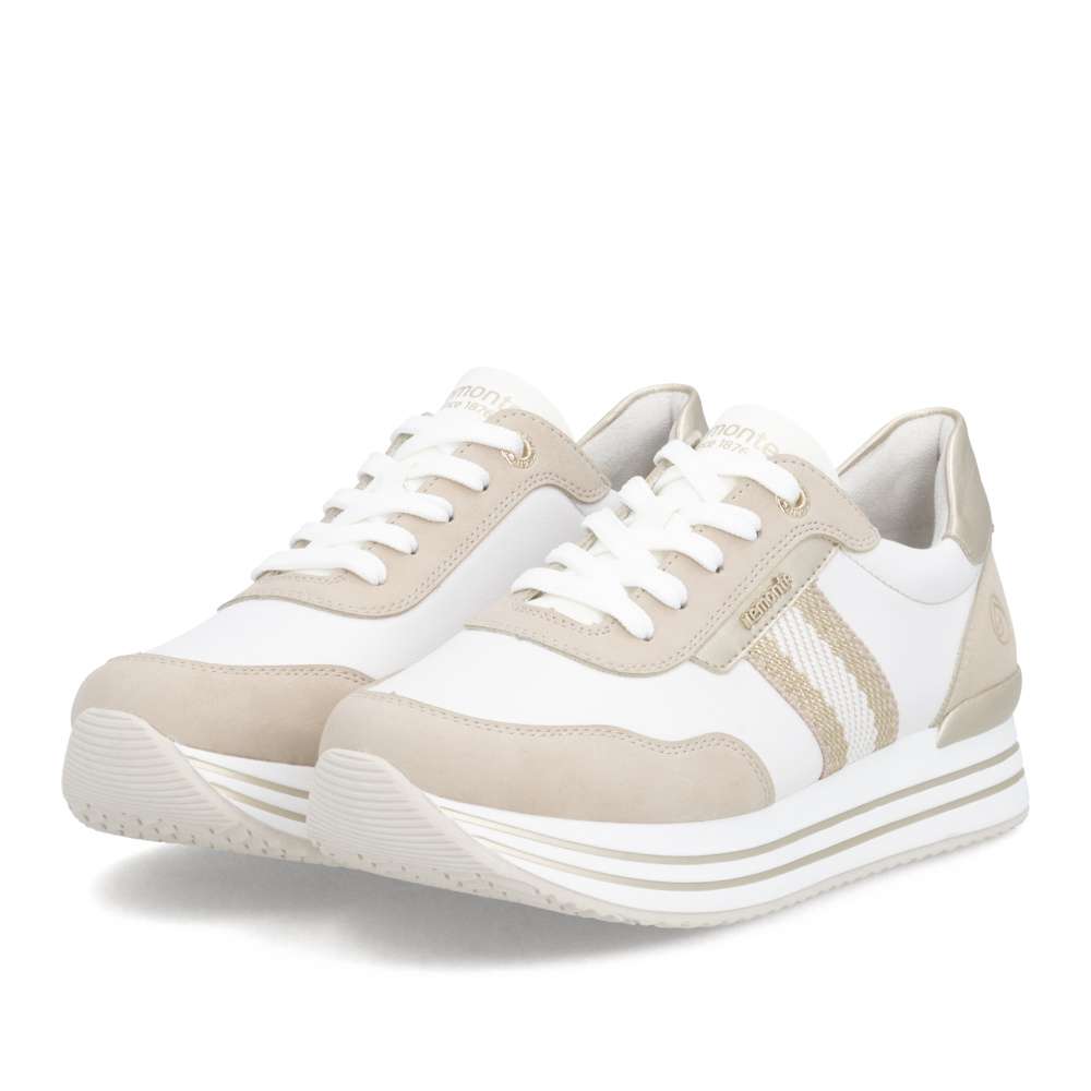Obuv REMONTE představuje prémiovou řadu značky RIEKER, která se vyznačuje vysokou kvalitou použitých materiálů a precizním zpracováním. Moderní design a komfort při nošení se dokonale pojí v těchto teniskách, které vnesou do vašeho šatníku svěží nádech. Svršek v kombinaci bílé barvy, béžového odstínu a lesklých aplikací působí atraktivně. Šněrování umožňuje pohodlné nazouvání a přesné přizpůsobení tvaru chodidla, což zaručuje stabilitu a přirozený, plynulý pohyb při každém kroku. Vyjímatelná měkká stélka poskytuje výjimečný komfort během celého dne, příjemně tlumí došlap a zároveň umožňuje snadné čištění či výměnu dle potřeby. Promyšlená konstrukce podešve doplněná lesklým lemováním vytváří atraktivní kontrast a současně poskytuje optimální oporu při chůzi. Tyto tenisky RIEKER představují ideální volbu pro ženy, které hledají naprosto vyvážené spojení stylu, komfortu a kvalitního zpracování. Technologie: Remonte Soft – unikátní stélka vyrobená z prodyšného materiálu, která svým tvarem a materiálem zajistí pocit pohodlí při celodenním nošení. Tato obuv je vybavena vyjímatelnou stélkou. Vegan - pro zodpovědný životní styl bez živočišných materiálů.