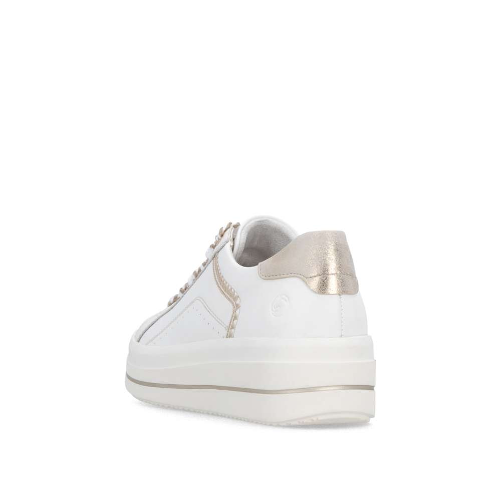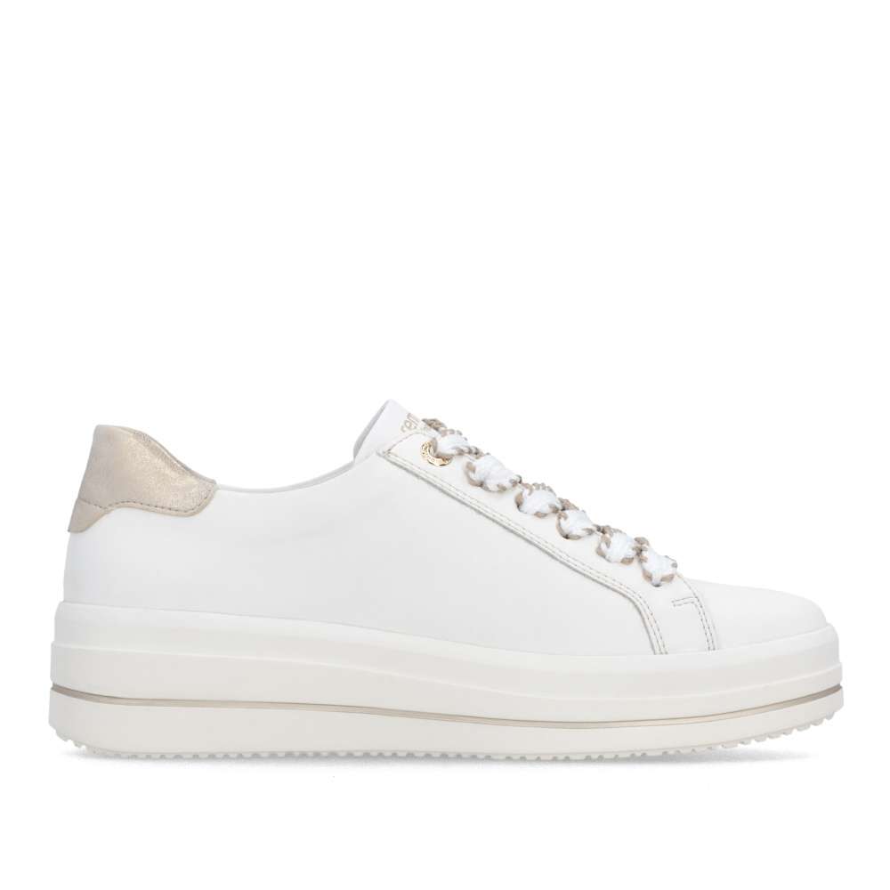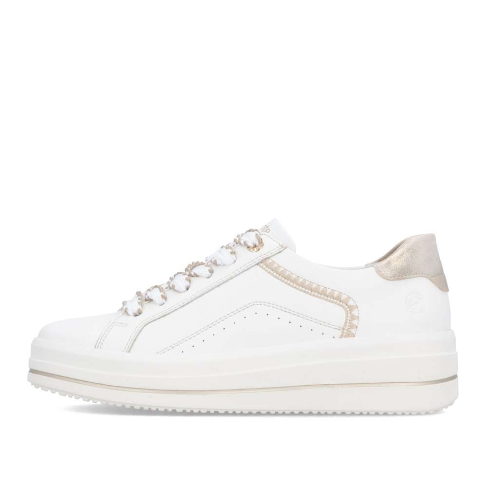 Obuv REMONTE představuje prémiovou řadu značky RIEKER, která se vyznačuje vysokou kvalitou použitých materiálů a precizním zpracováním. Tyto bílé tenisky jsou dokonalým vyjádřením nadčasového designu v módním stylu značky RIEKER. Jejich kožený svršek působí čistě, přičemž jej oživuje atraktivní šitý vzor a metalický detail v oblasti paty, který dodává modelu nádech luxusu. Díky praktickému šněrování s vizuálně působivou šňůrkou si tenisky snadno přizpůsobíte přesně podle tvaru svého chodidla, což zaručí pohodlné nošení během celého dne. Měkká, vyjímatelná stélka se přizpůsobí vašim potřebám – poskytne dokonalé pohodlí a v případě potřeby ji můžete nahradit vlastními stélkami. Vyšší podešev s decentním lesklým lemováním nejen zvýrazní celkový vzhled obuvi, ale také přispívá ke stabilitě při chůzi. Tenisky tak nejen skvěle vypadají, ale zároveň nabízí i vysoký komfort. Pokud hledáte obuv, která kombinuje styl, kvalitu a pohodlí, tyto tenisky jsou ideální volbou, díky které budete vypadat skvěle a cítit se ještě lépe.
