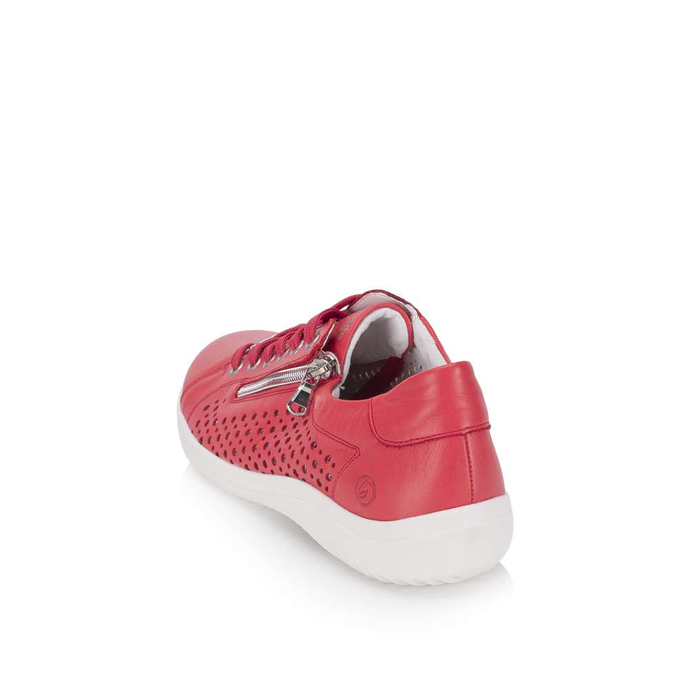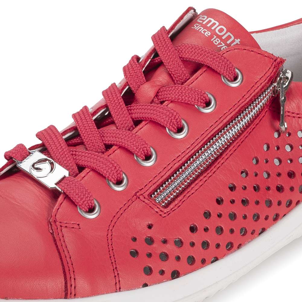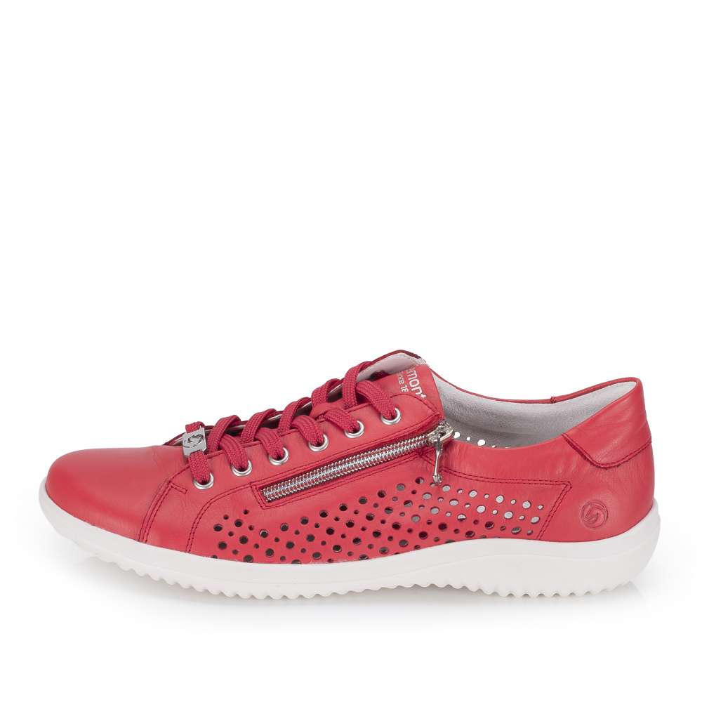 Obuv REMONTE představuje prémiovou řadu značky RIEKER, která se vyznačuje vysokou kvalitou použitých materiálů a precizním zpracováním. Tyto tenisky výrazné červené barvy okamžitě upoutají pozornost a dodají vašemu outfitu svěží a energický nádech. Boční strany koženého svršku jsou ozdobeny působivým perforovaným vzorem, který nejen přidává stylový detail, ale zároveň zlepšuje prodyšnost a komfort při nošení. Praktické detaily jsou promyšleně umístěny pro maximální komfort a funkčnost. Zip na nártu a klasické šněrování umožňují snadné obouvání a zároveň dokonalé přizpůsobení tvaru nohy. Vnitřní stélka je vyjímatelná, příjemně měkká a poskytuje pohodlí i při delším nošení. Flexibilní podešev se dokonale přizpůsobuje pohybu nohy, zajišťuje stabilitu a komfort na různých površích, čímž činí tyto tenisky ideálními pro každodenní nošení, procházky, volný čas i aktivní životní styl.