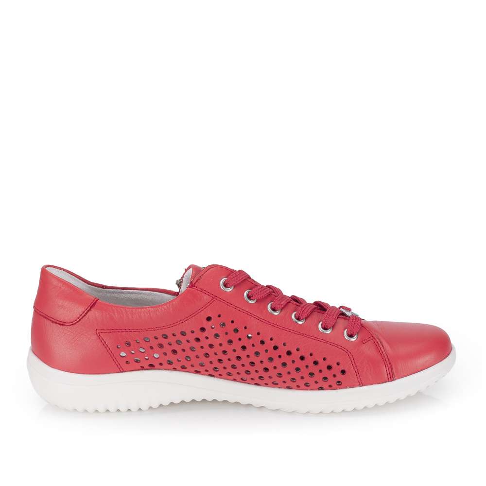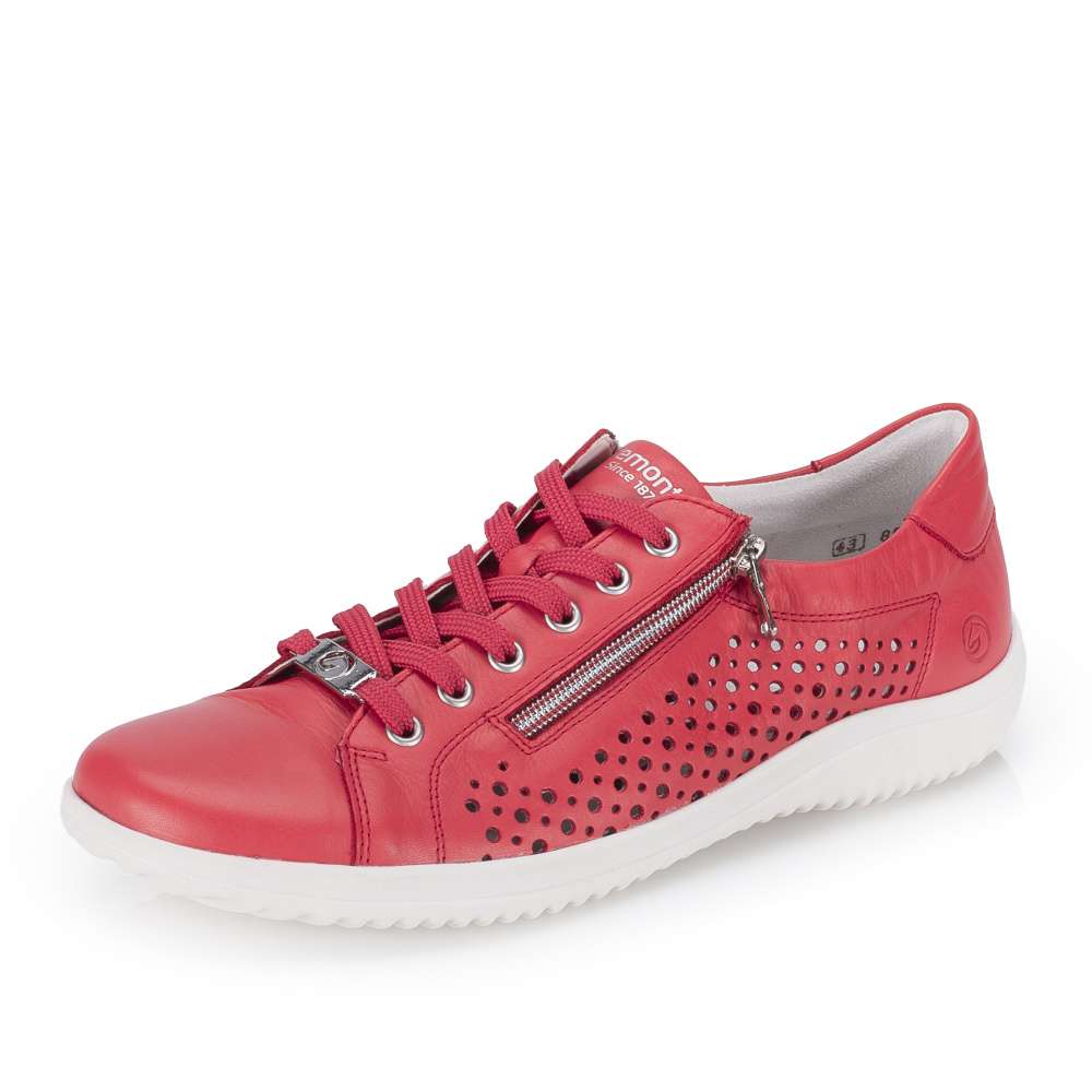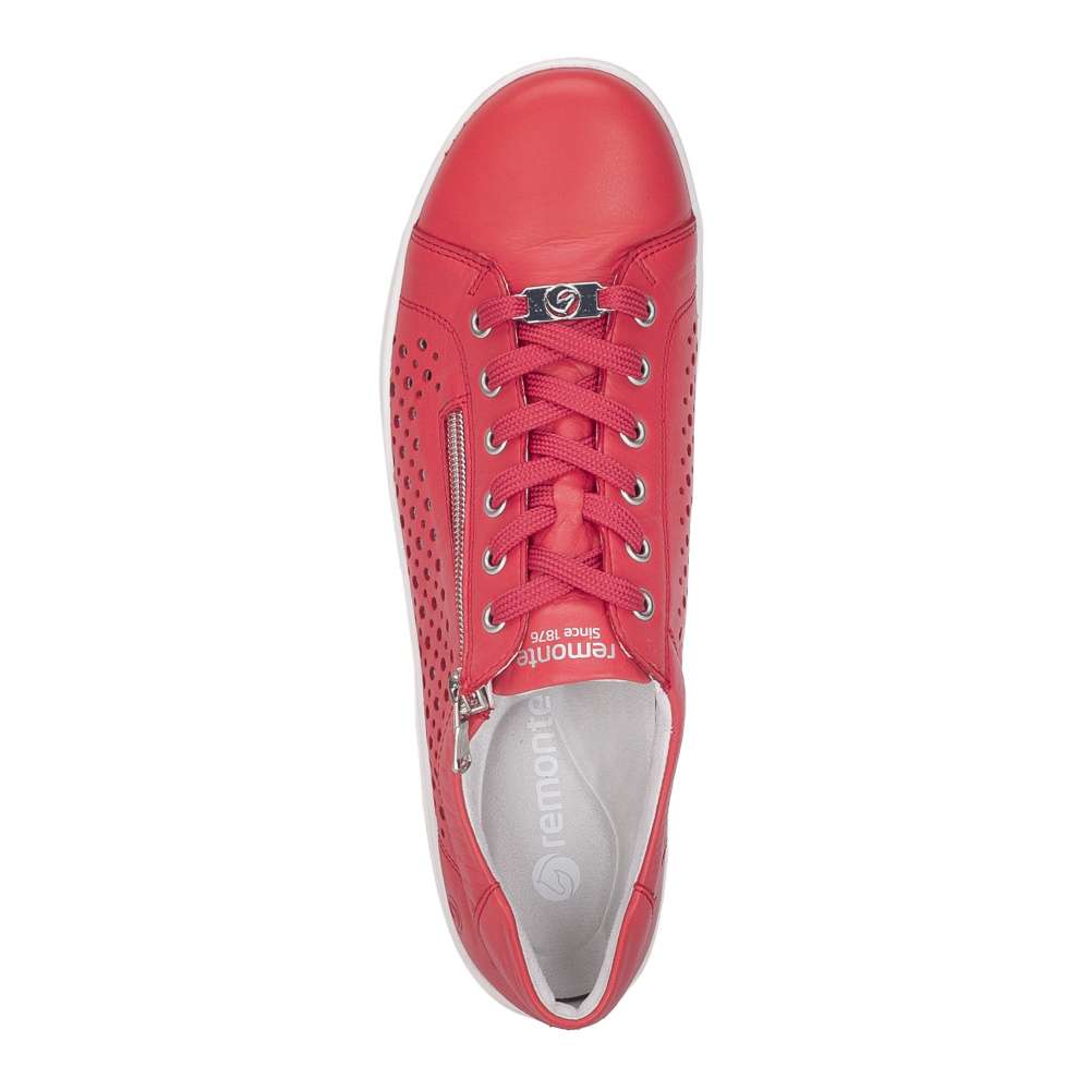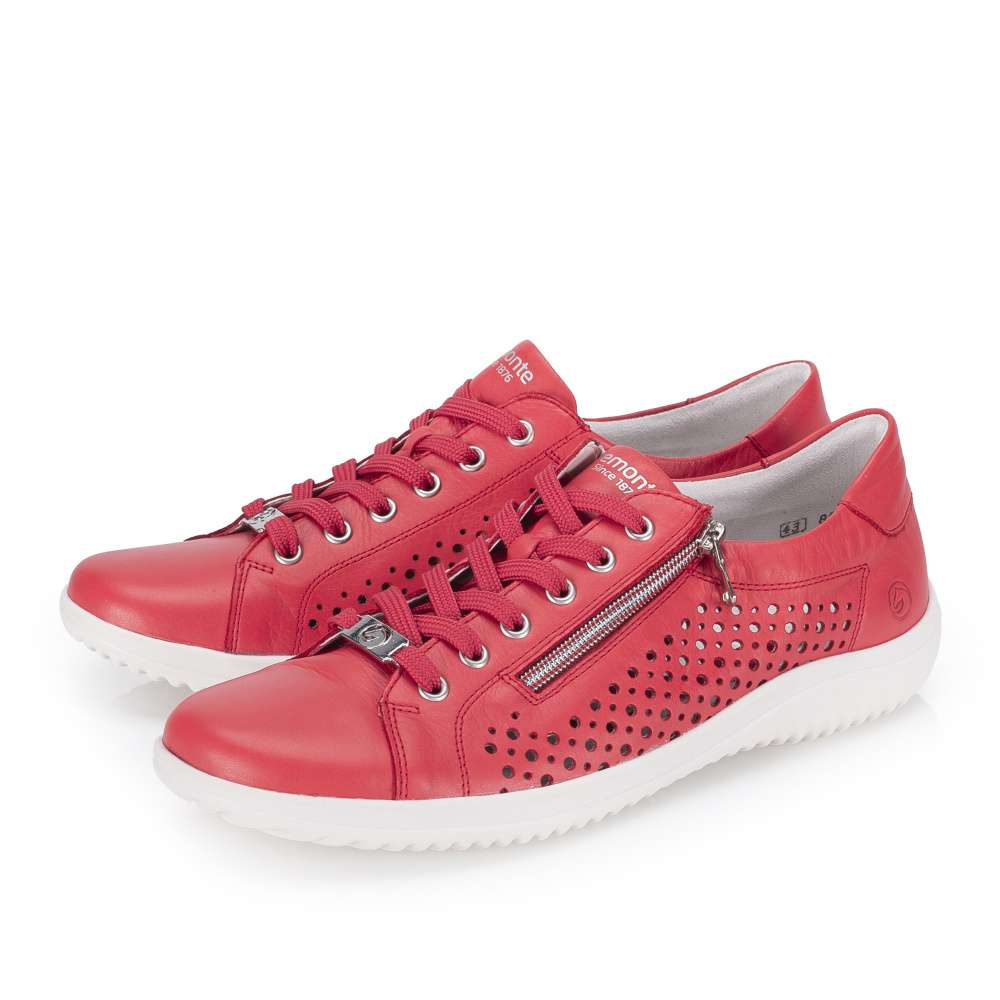 Obuv REMONTE představuje prémiovou řadu značky RIEKER, která se vyznačuje vysokou kvalitou použitých materiálů a precizním zpracováním. Tyto tenisky výrazné červené barvy okamžitě upoutají pozornost a dodají vašemu outfitu svěží a energický nádech. Boční strany koženého svršku jsou ozdobeny působivým perforovaným vzorem, který nejen přidává stylový detail, ale zároveň zlepšuje prodyšnost a komfort při nošení. Praktické detaily jsou promyšleně umístěny pro maximální komfort a funkčnost. Zip na nártu a klasické šněrování umožňují snadné obouvání a zároveň dokonalé přizpůsobení tvaru nohy. Vnitřní stélka je vyjímatelná, příjemně měkká a poskytuje pohodlí i při delším nošení. Flexibilní podešev se dokonale přizpůsobuje pohybu nohy, zajišťuje stabilitu a komfort na různých površích, čímž činí tyto tenisky ideálními pro každodenní nošení, procházky, volný čas i aktivní životní styl.