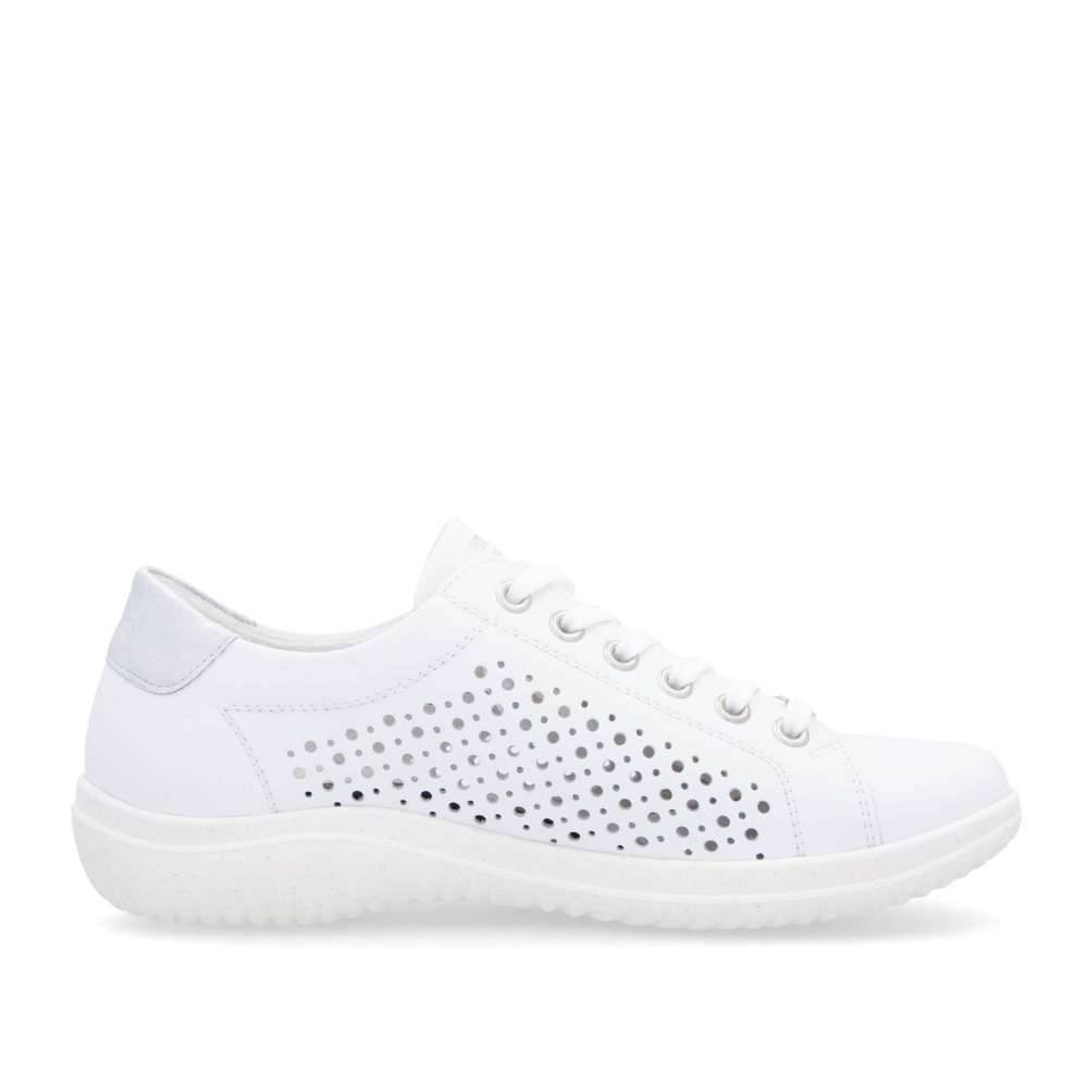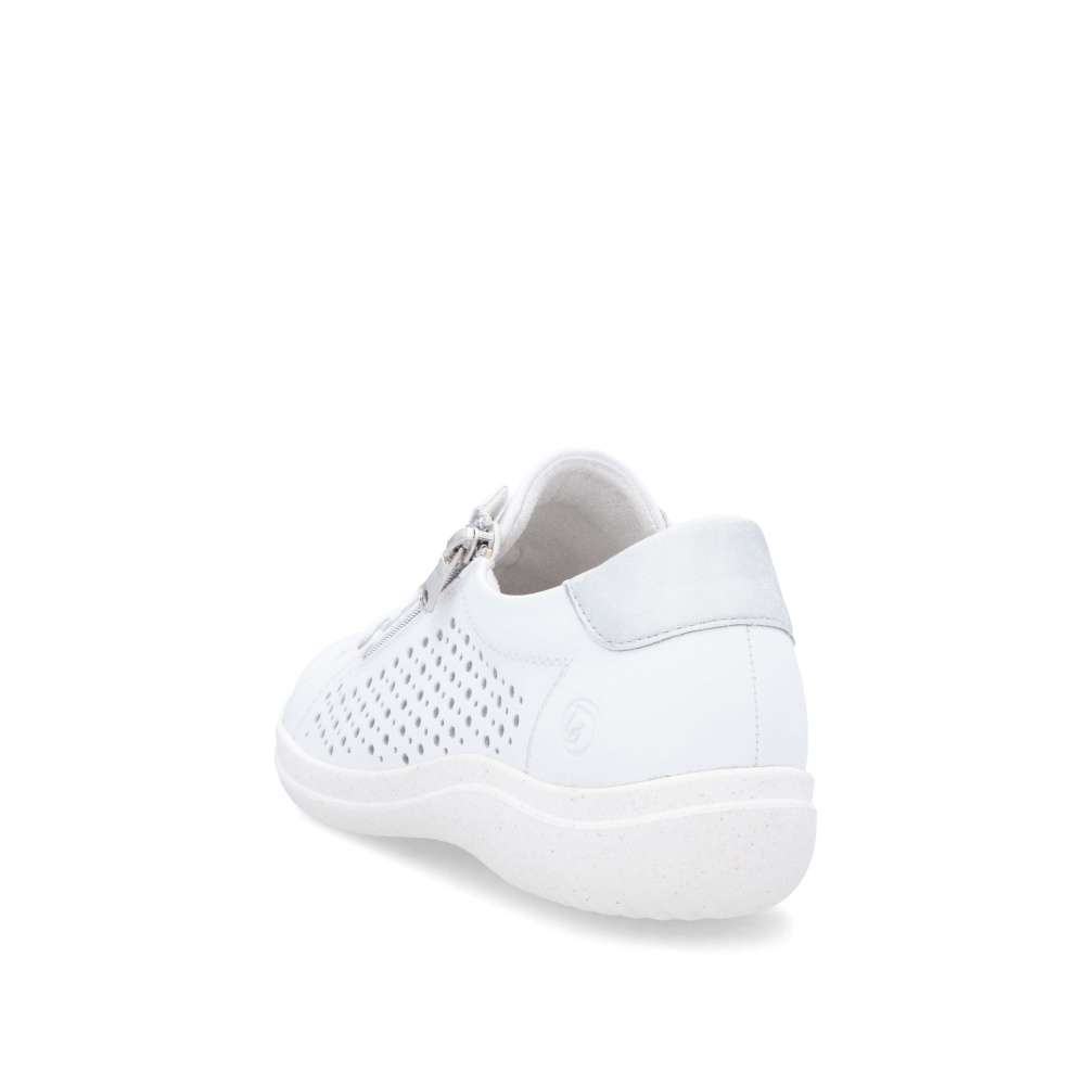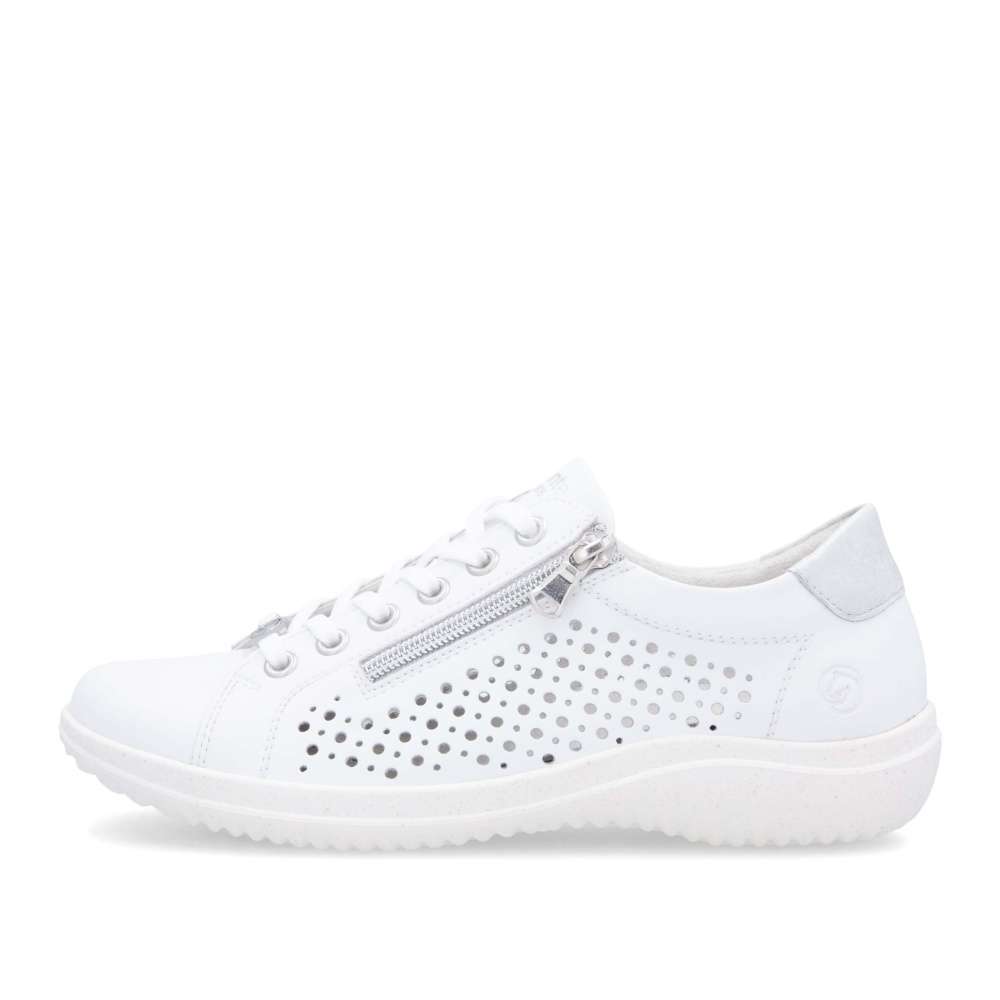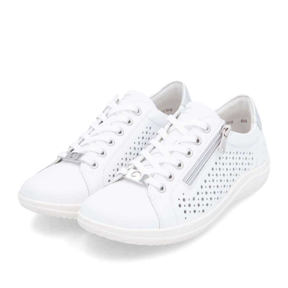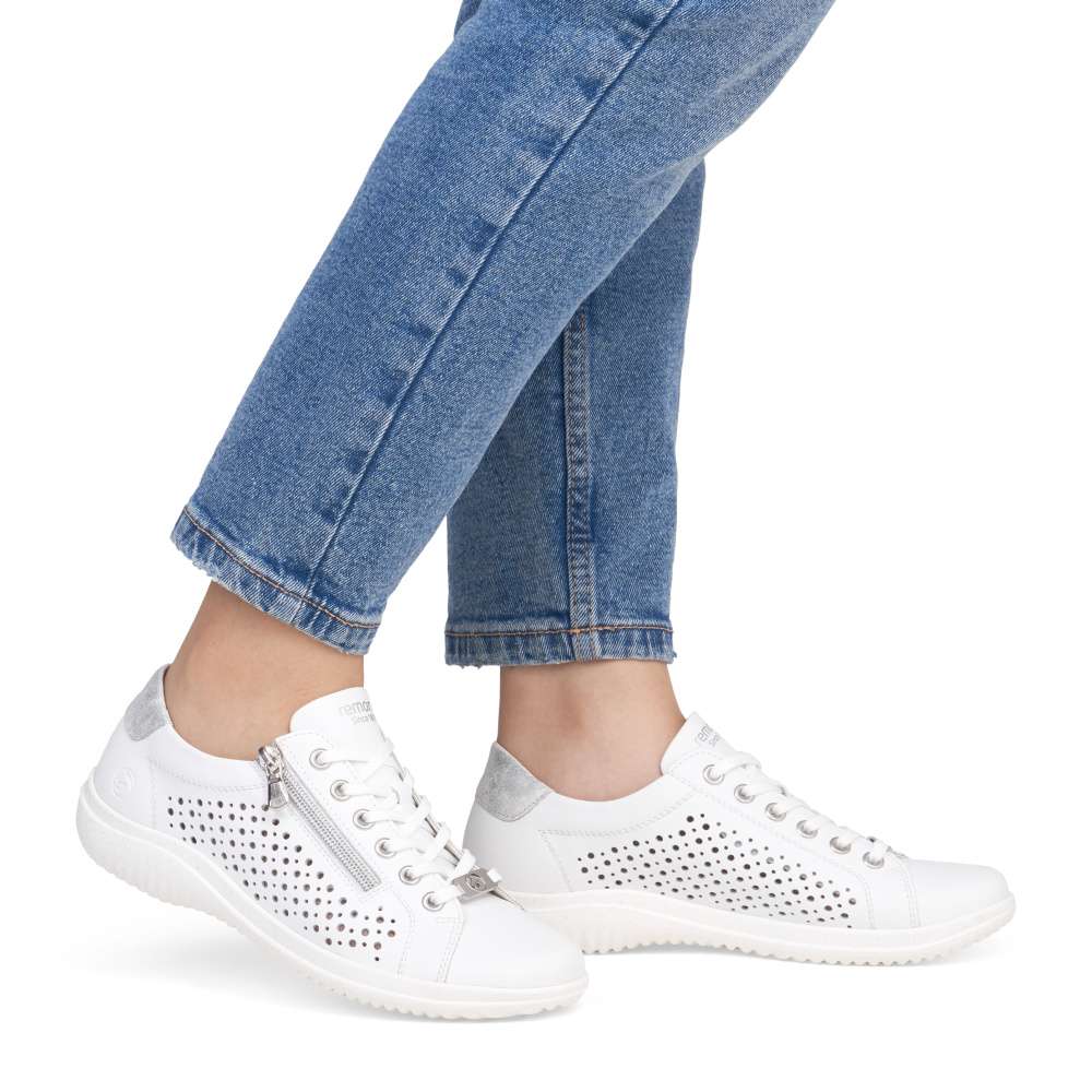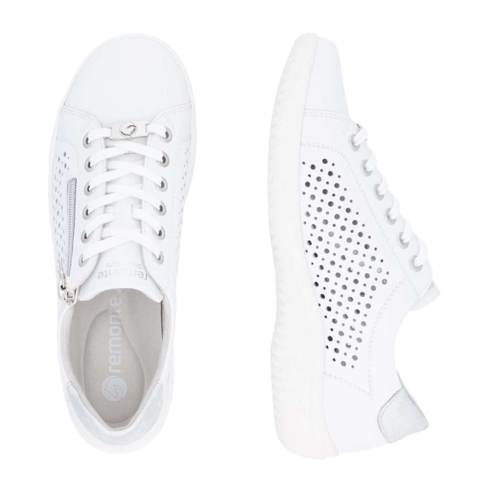 Obuv REMONTE – jedná se o vyšší řadu značky RIEKER, tato obuv se vyznačuje vynikající kombinací svrchních materiálů. Bílý svršek těchto tenisek je zdoben perforovaným vzorem, který nejen vypadá atraktivní, ale také poskytuje prodyšnost, což zajišťuje pohodlí i v horkých dnech. Metalický prvek v patní části dodává teniskám moderní a trendy vzhled, který je zároveň decentní. S možností sáhnout po šněrování nebo použití zipu si můžete vybrat styl, který vám nejlépe vyhovuje při obouvání. Měkká vyjímatelná stélka a flexibilní podešev poskytují maximální pohodlí a podporu během celého dne. Tyto tenisky jsou nejen stylové, ale také praktické pro každodenní nošení. Technologie: Remonte Soft – unikátní stélka vyrobená z prodyšného materiálu, která svým tvarem a materiálem zajistí pocit pohodlí při celodenním nošení. Tato bota je vybavena vyjímatelnou stélkou.