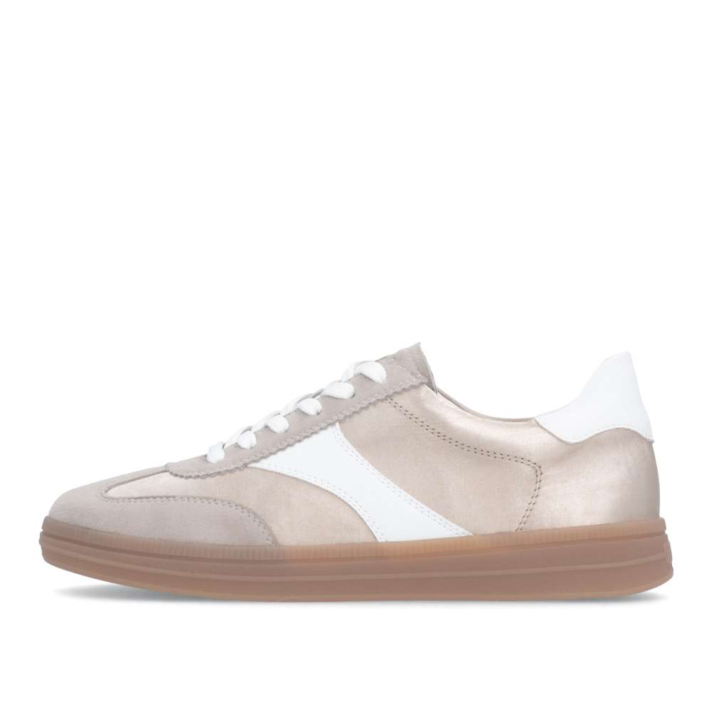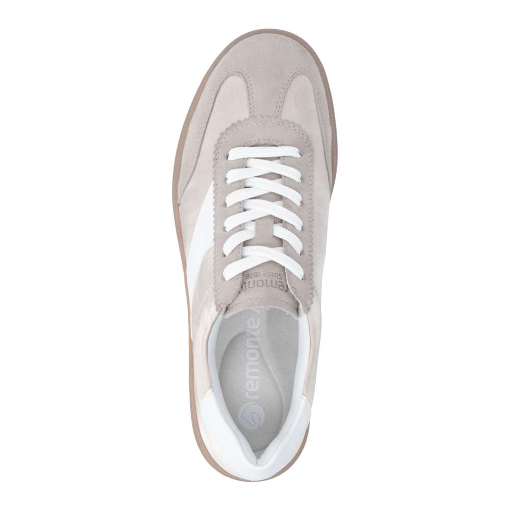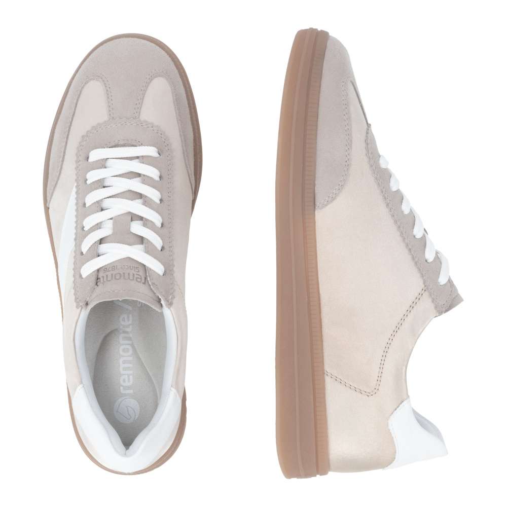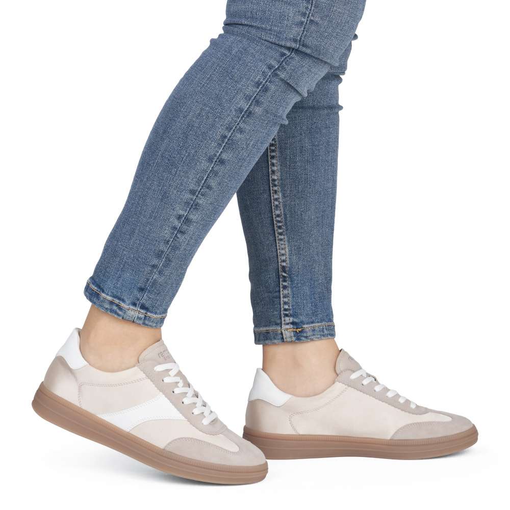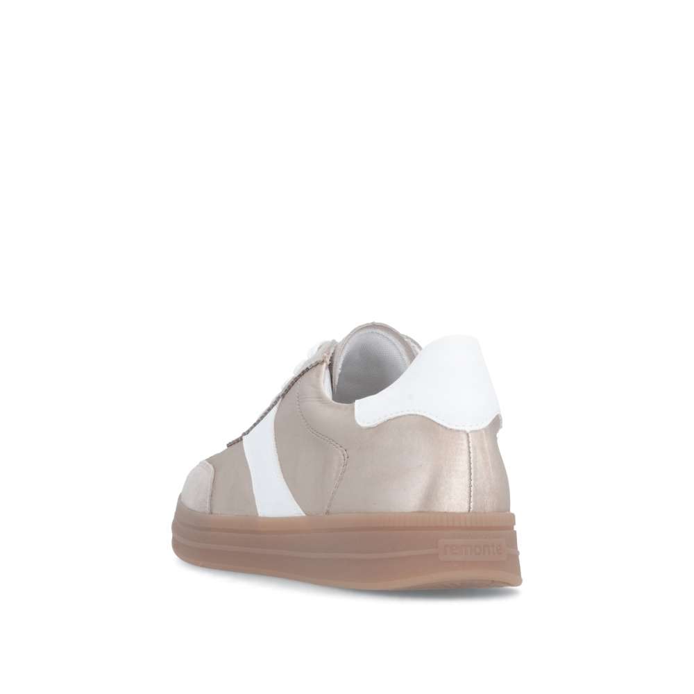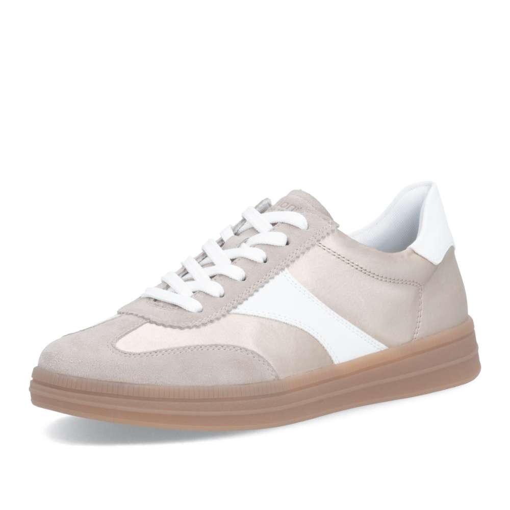 Obuv REMONTE představuje prémiovou řadu značky RIEKER, která se vyznačuje vysokou kvalitou použitých materiálů a precizním zpracováním. Moderní design a výjimečné pohodlí se v těchto teniskách spojují do jednoho celku, který okamžitě oživí váš šatník. Svršek tenisek tvoří harmonická kombinace béžové a bílé barvy, kterou doplňují jemné metalické linie. Tyto decentní barevné kontrasty podtrhují moderní charakter obuvi a ženský vzhled. Klasické šněrování umožňuje pohodlné obouvání i přesné přizpůsobení tvaru chodidla, čímž se zajistí stabilita a přirozený, plynulý pohyb při každém kroku. Vyjímatelná měkká stélka přináší výjimečné pohodlí během celého dne a její praktická vyjímatelnost umožňuje snadné čištění či rychlou výměnu. Podešev poskytuje optimální oporu, flexibilitu a stabilitu při chůzi, což oceníte zejména během delších dnů plných pohybu. Atraktivní design těchto tenisek, propracované detaily a praktické funkční prvky je činí univerzálním kouskem – vhodným pro každodenní nošení, volnočasové aktivity, městské procházky i cestování.