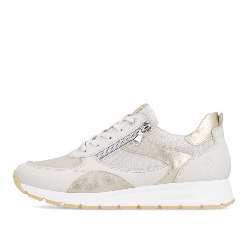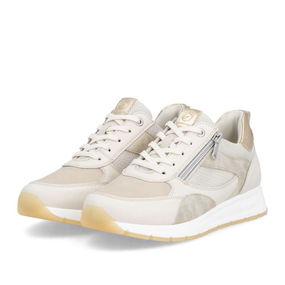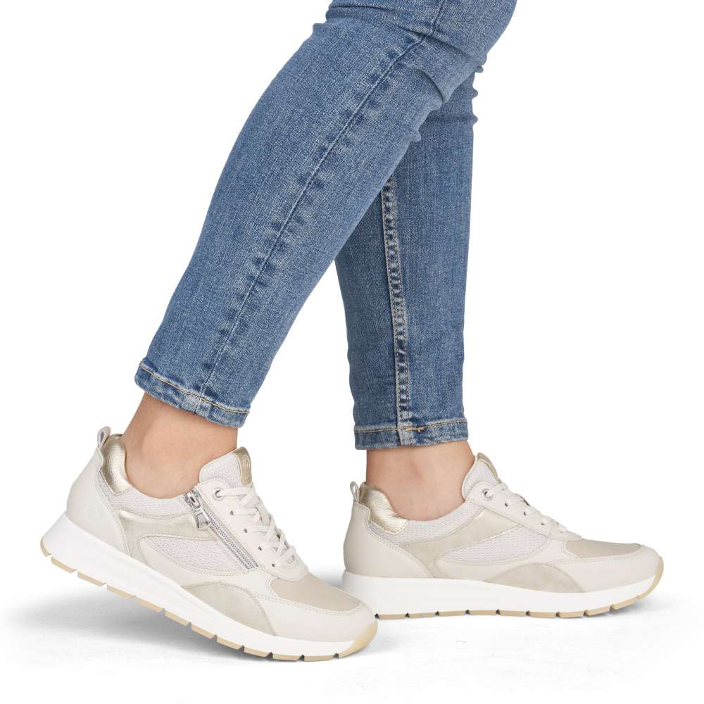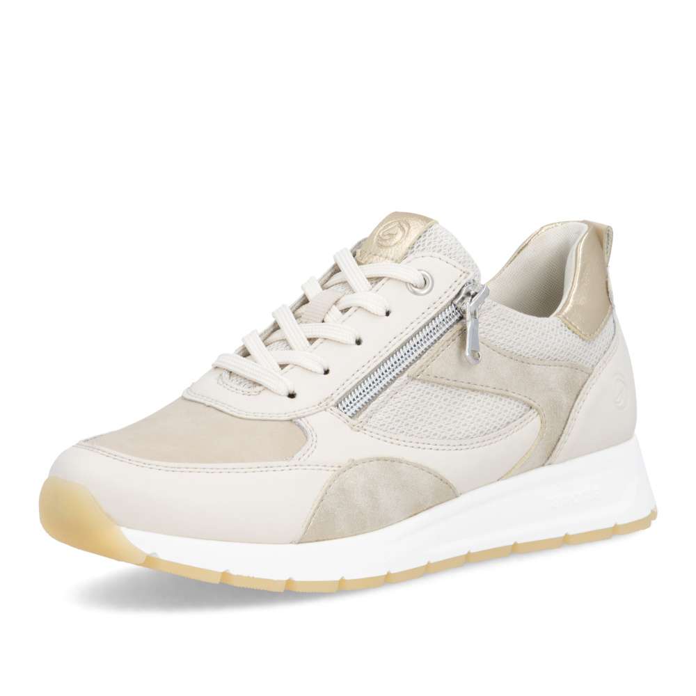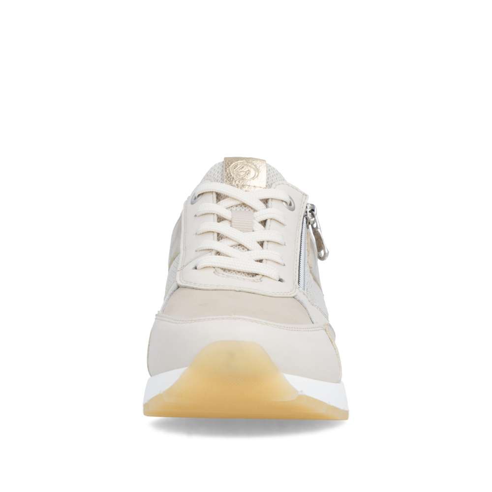 Obuv REMONTE představuje prémiovou řadu značky RIEKER, která se vyznačuje vysokou kvalitou použitých materiálů a precizním zpracováním. Obujte se do stylového designu těchto tenisek RIEKER, které spojují vizuální přitažlivost s mimořádným komfortem a kvalitou zpracování. Svršek tenisek v béžových odstínech z různých materiálových struktur vytváří dynamický vzhled a decentní lesklé odlesky aplikací zvyšují celkovou estetiku modelu. Kombinace klasického šněrování se zipem na nártu umožňuje snadné a rychlé obouvání, přičemž poskytuje přesné přizpůsobení tvaru chodidla podle individuálních potřeb. Vyjímatelná měkká, prodyšná stélka přináší výjimečný komfort a přizpůsobí se tvaru chodidla, čímž podporuje přirozený pohyb. Praktická vyjímatelnost stélky umožňuje snadné čištění a rychlou výměnu, čímž se zvyšuje hygiena tenisek a prodlužuje jejich životnost. Stabilní podešev s precizně navrženou konstrukcí poskytuje optimální oporu při chůzi a její kontrastní barva dodává dynamický nádech. Tyto tenisky díky harmonickému designu, propracovaným detailům a praktickým funkcím jsou vhodné pro každodenní nošení, volnočasové aktivity, procházky po městě nebo cestování.
