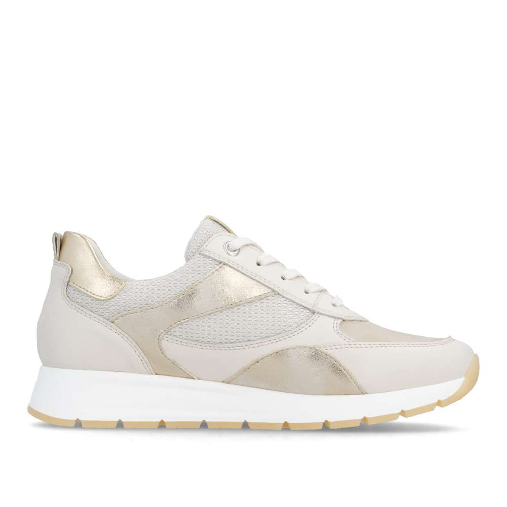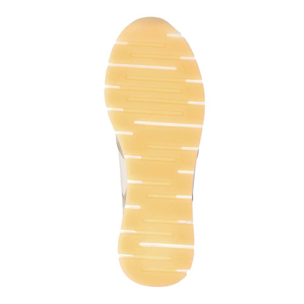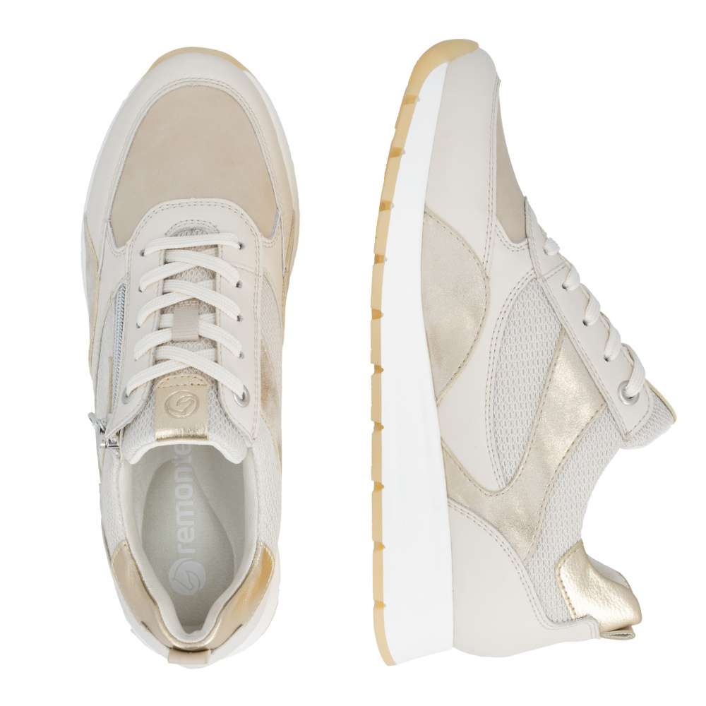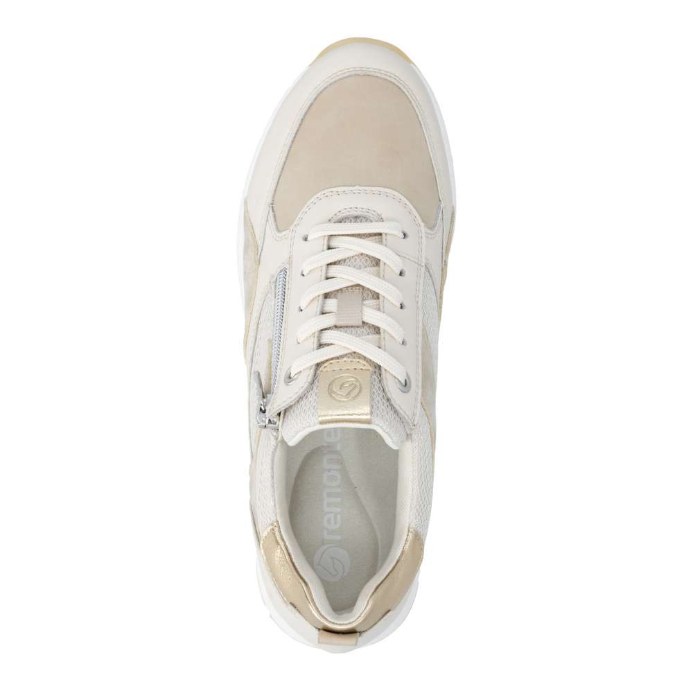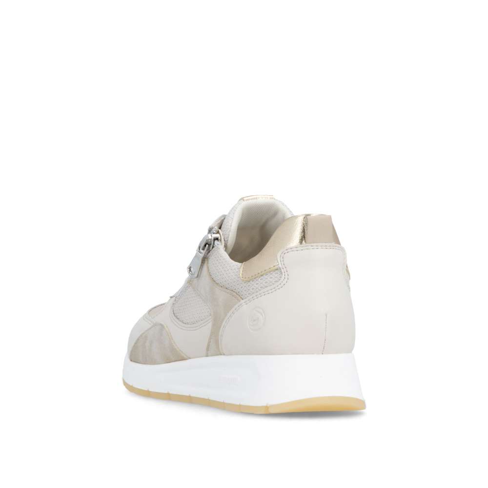 Obuv REMONTE představuje prémiovou řadu značky RIEKER, která se vyznačuje vysokou kvalitou použitých materiálů a precizním zpracováním. Obujte se do stylového designu těchto tenisek RIEKER, které spojují vizuální přitažlivost s mimořádným komfortem a kvalitou zpracování. Svršek tenisek v béžových odstínech z různých materiálových struktur vytváří dynamický vzhled a decentní lesklé odlesky aplikací zvyšují celkovou estetiku modelu. Kombinace klasického šněrování se zipem na nártu umožňuje snadné a rychlé obouvání, přičemž poskytuje přesné přizpůsobení tvaru chodidla podle individuálních potřeb. Vyjímatelná měkká, prodyšná stélka přináší výjimečný komfort a přizpůsobí se tvaru chodidla, čímž podporuje přirozený pohyb. Praktická vyjímatelnost stélky umožňuje snadné čištění a rychlou výměnu, čímž se zvyšuje hygiena tenisek a prodlužuje jejich životnost. Stabilní podešev s precizně navrženou konstrukcí poskytuje optimální oporu při chůzi a její kontrastní barva dodává dynamický nádech. Tyto tenisky díky harmonickému designu, propracovaným detailům a praktickým funkcím jsou vhodné pro každodenní nošení, volnočasové aktivity, procházky po městě nebo cestování.